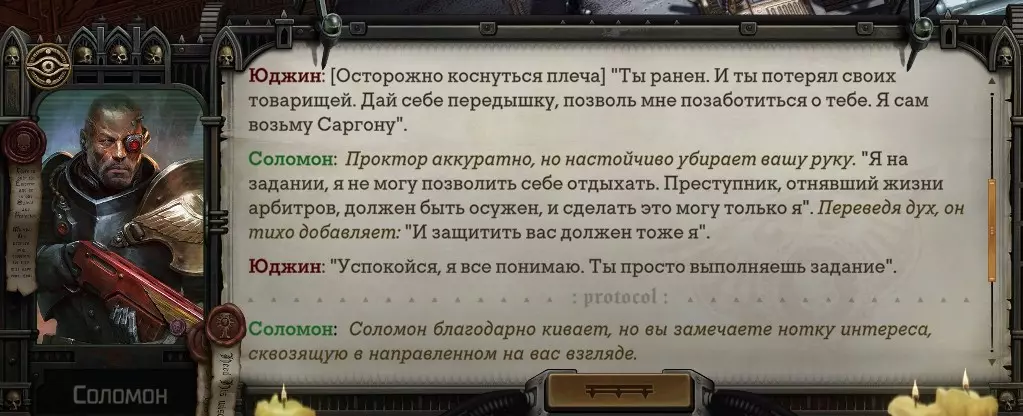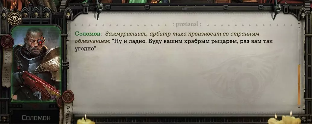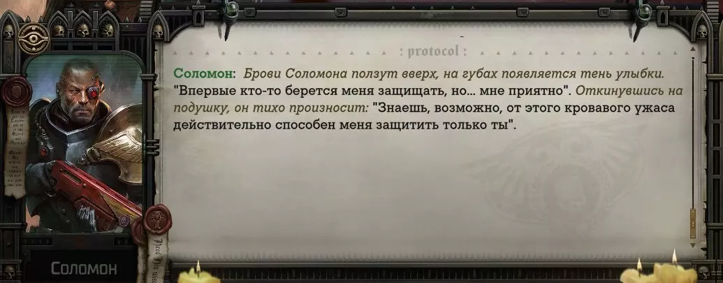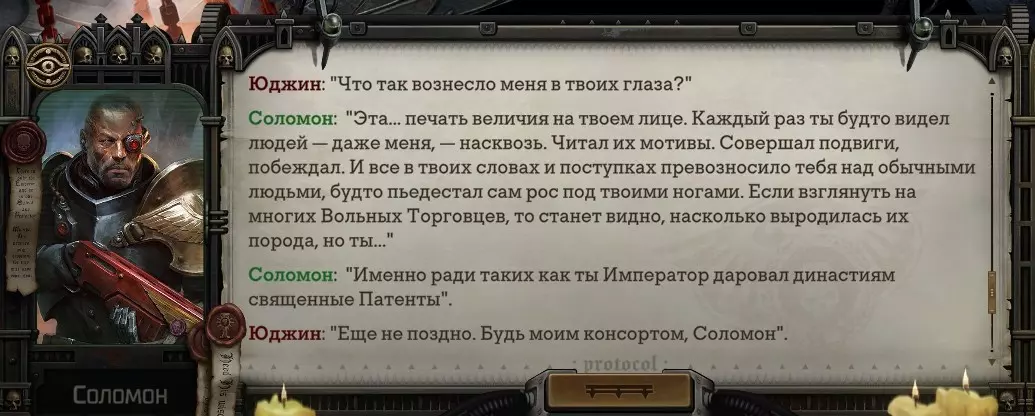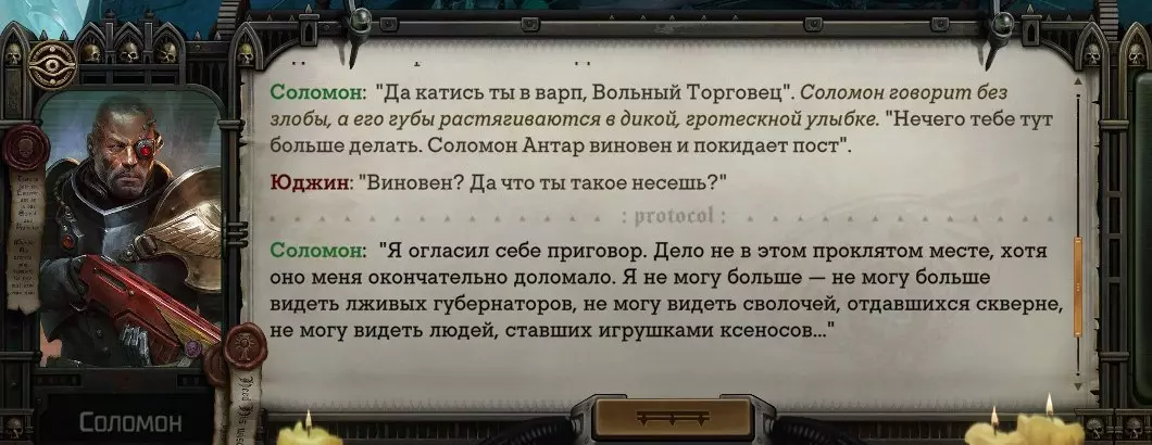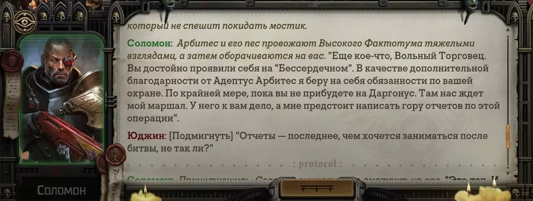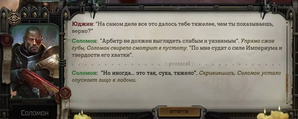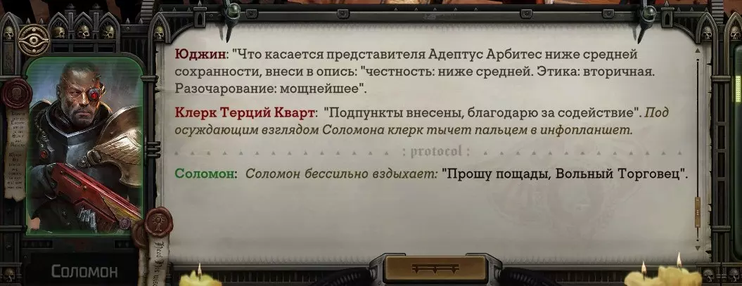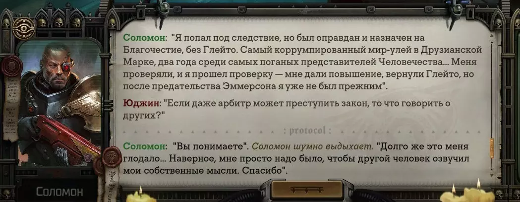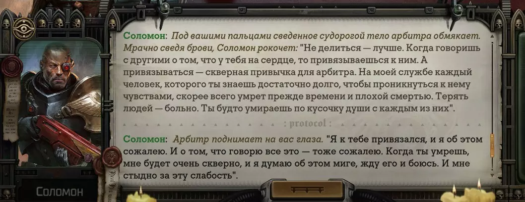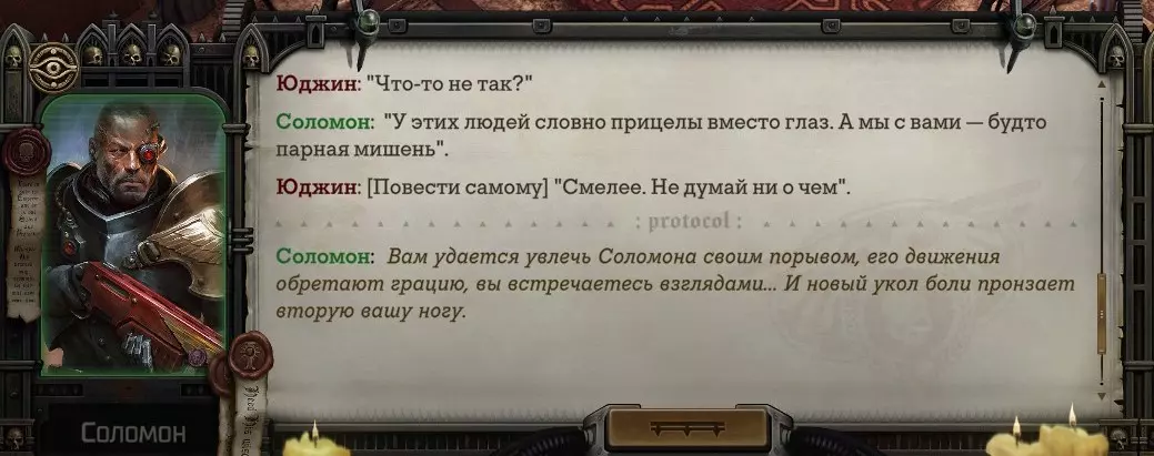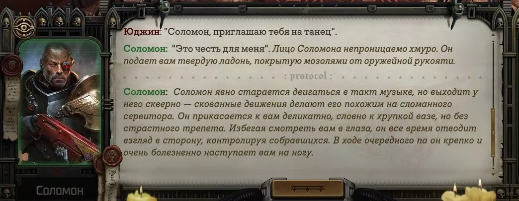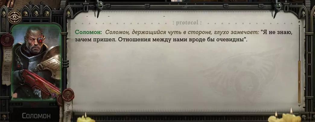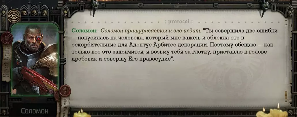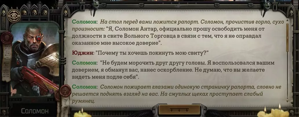 Гайд-обзор на роман проктора Соломона Антара из дополнения Lex Imperialis. С выходом на тру-концов очку и ачивку «Пламя». Предупреждения: гайд 18+, есть одно матерное слово на скрине. Вводные данные Тихого вокса, чегнари. Чё, как жизнь? Не хотите ли поглядеть на роман с новым сопартом из Lex Imperialis, а может и ачивку «Пламя» из него выбить? Если да, то вы по адресу, ведь я на этом, знаете ли, собаку съела. BA-DUM-TSS. Весь гайд состоит из спойлеров, спойлерных текстов, спойлерных скринов, абсолютно весь от и до! Имейте в виду. Что важно знать. Про рекрутинг нового сопарта и вообще Подобрать Соломона Антара можно даже в конце четвертого акта, запустив DLC в настройках игры после закрытия сюжетных квестов. Но это не так интересно, как пройти игру с самого начала (хотя сие и запарно, не спорю). Первая встреча с проктором будет на Райкаде, если вы запустили игру аж сначала. Снова напомнят о себе арбитры на Футфоле, после первой же беседы с наместником Владаймом Токарой. Вас позовут на потную миссию, куда лучше соваться с пати на уровне 20+. Поехать на эту миссию с лоулевельной пати — это жесть. Будете превозмогать и траить бои. Прим.ред: забудьте всё, что я написала. Бой понерфили. Если запустили ДЛЦ в середине прохождения, то проктор вылезет пообщаться после первого варп-прыжка и попросит торговца об аудиенции с маршалом Адептус Арбитес на Даргонусе. Арбитра можно шатать по мировоззрению, от еретика РТ он не сбегает как некоторые лояляхи. Но всё-таки кинуть торговца он может. Просто по другим идеологическим причинам. Сохраняйтесь почаще. Просто во избежание багов. А еще, поставьте себе мод-багофиксилку[www.nexusmods.com]. Это лучшее, что делали для игры сразу после Тойбокса. Атвичаю. Про романсовый контент Роман с проктором доступен как мужчинам, так и женщинам. Перед лицом Лекс Империалис все равны, в кровати с Соломоном тоже. За вывод арбитра на тру-концовку романа отвечает флаг SolomorneImpressed («Cоломон впечатлен», стало быть). И для успеха надо наколотить их как минимум три. Флаги тестировались на версии игры 1.4. Если вы видите, что тексты на скринах в гайде какие-то не совсем те, что у вас в игре получились — не пугайтесь. Два патча с момента релиза дополнения вносили стилистические (но не глобальные смысловые) правки в диалоги на романе Соломона. Суперкраткая выжимка гайда доступна в виде таблицы флагов[docs.google.com] романа мента. А здесь только стены текста, скрины, вещдоки, чушь собачья и полный Флекс Империалис. Я даже не буду скрывать, что писала руководство ради кека. Показывать и рассказывать про подводные камни буду на примере М+М романа. И если вы такое на дух не переносите — сейчас хороший момент, чтобы закрыть гайд, спасибо! СсылкиДругие стимовские руководства по тру-лаву моего пера: тру-роман дознавателя, романсим Кассию, угараем с Джай. И от ToxicBulb: 120 дней Содома с Маражаем, греко-римская борьба в кровати с ассасинкой культа смерти. + общая табла флагов ВСЕХ персонажей[docs.google.com] от ToxicBulb. Хинты по роману с Ирлиэт тоже там есть, добавляйте в избранное и не тормозите. Вопросы по романсовым аспектам также можно сходить задать в тематическом обсуждении, велcum.┌( ಠ_ಠ)┘ Акт 1. Мы встретились в странный период В составлении этого гайда нам помог отпетый крайм-лорд Юджин (Евгений) фон Валанциус. Патент-то он получил, да привычка «нагибать легавых» (во всех смыслах) никуда не делась. Хехе. ( ͡