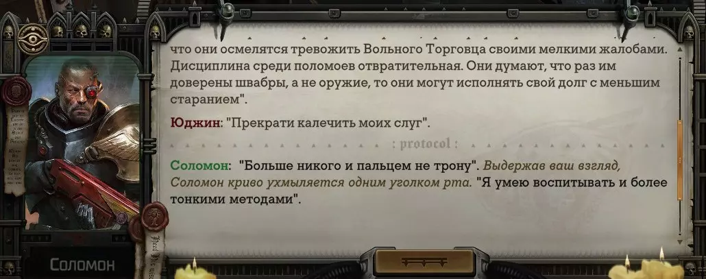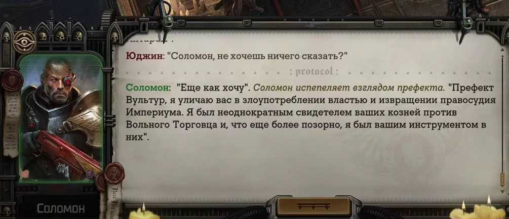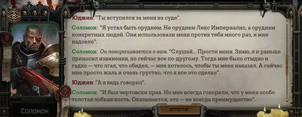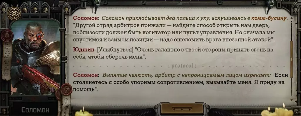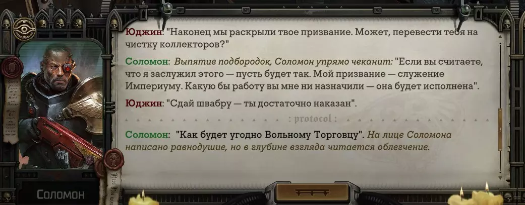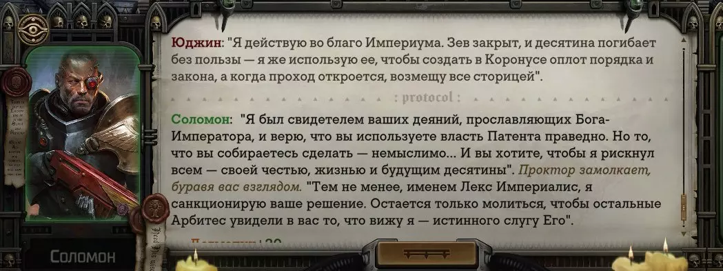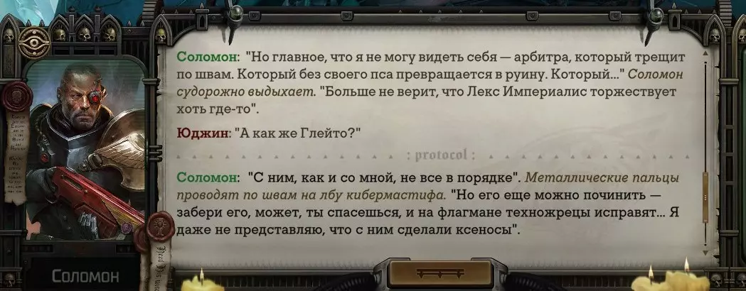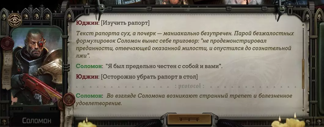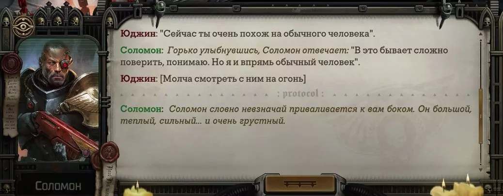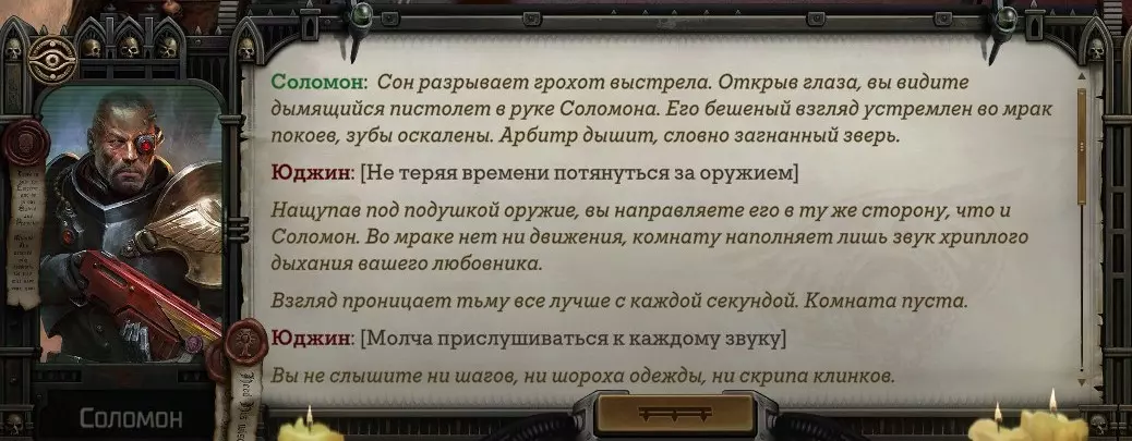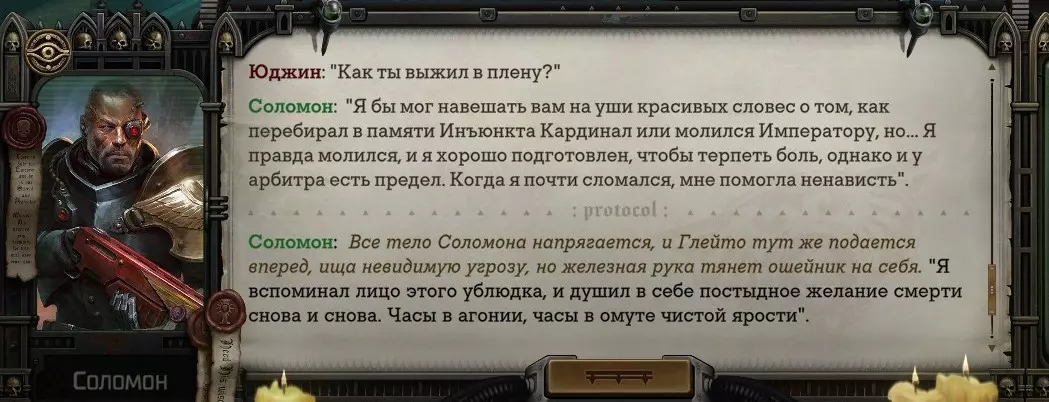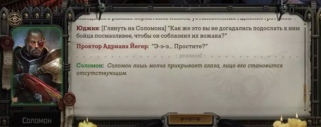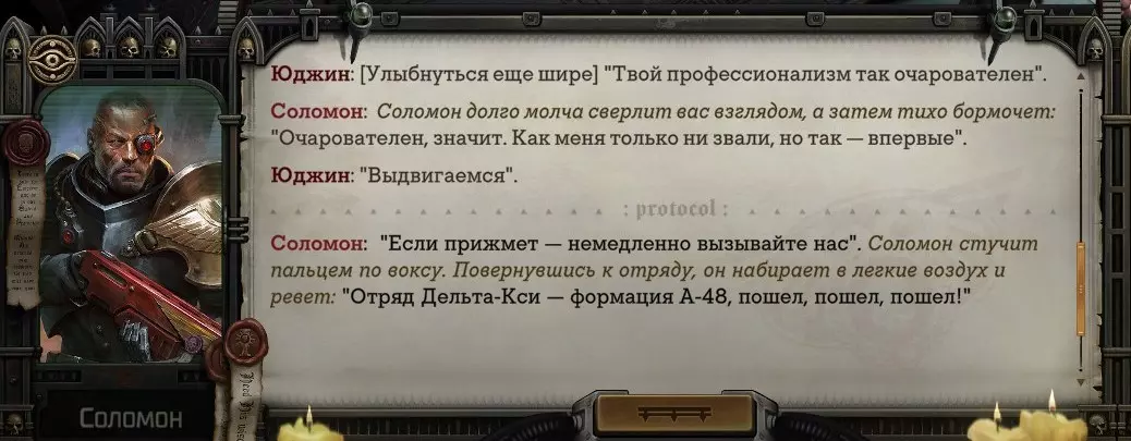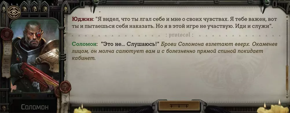 Гайд-обзор на роман проктора Соломона Антара из дополнения Lex Imperialis. С выходом на тру-концов очку и ачивку «Пламя». Предупреждения: гайд 18+, есть одно матерное слово на скрине. Вводные данные Тихого вокса, чегнари. Чё, как жизнь? Не хотите ли поглядеть на роман с новым сопартом из Lex Imperialis, а может и ачивку «Пламя» из него выбить? Если да, то вы по адресу, ведь я на этом, знаете ли, собаку съела. BA-DUM-TSS. Весь гайд состоит из спойлеров, спойлерных текстов, спойлерных скринов, абсолютно весь от и до! Имейте в виду. Что важно знать. Про рекрутинг нового сопарта и вообще Подобрать Соломона Антара можно даже в конце четвертого акта, запустив DLC в настройках игры после закрытия сюжетных квестов. Но это не так интересно, как пройти игру с самого начала (хотя сие и запарно, не спорю). Первая встреча с проктором будет на Райкаде, если вы запустили игру аж сначала. Снова напомнят о себе арбитры на Футфоле, после первой же беседы с наместником Владаймом Токарой. Вас позовут на потную миссию, куда лучше соваться с пати на уровне 20+. Поехать на эту миссию с лоулевельной пати — это жесть. Будете превозмогать и траить бои. Прим.ред: забудьте всё, что я написала. Бой понерфили. Если запустили ДЛЦ в середине прохождения, то проктор вылезет пообщаться после первого варп-прыжка и попросит торговца об аудиенции с маршалом Адептус Арбитес на Даргонусе. Арбитра можно шатать по мировоззрению, от еретика РТ он не сбегает как некоторые лояляхи. Но всё-таки кинуть торговца он может. Просто по другим идеологическим причинам. Сохраняйтесь почаще. Просто во избежание багов. А еще, поставьте себе мод-багофиксилку[www.nexusmods.com]. Это лучшее, что делали для игры сразу после Тойбокса. Атвичаю. Про романсовый контент Роман с проктором доступен как мужчинам, так и женщинам. Перед лицом Лекс Империалис все равны, в кровати с Соломоном тоже. За вывод арбитра на тру-концовку романа отвечает флаг SolomorneImpressed («Cоломон впечатлен», стало быть). И для успеха надо наколотить их как минимум три. Флаги тестировались на версии игры 1.4. Если вы видите, что тексты на скринах в гайде какие-то не совсем те, что у вас в игре получились — не пугайтесь. Два патча с момента релиза дополнения вносили стилистические (но не глобальные смысловые) правки в диалоги на романе Соломона. Суперкраткая выжимка гайда доступна в виде таблицы флагов[docs.google.com] романа мента. А здесь только стены текста, скрины, вещдоки, чушь собачья и полный Флекс Империалис. Я даже не буду скрывать, что писала руководство ради кека. Показывать и рассказывать про подводные камни буду на примере М+М романа. И если вы такое на дух не переносите — сейчас хороший момент, чтобы закрыть гайд, спасибо! СсылкиДругие стимовские руководства по тру-лаву моего пера: тру-роман дознавателя, романсим Кассию, угараем с Джай. И от ToxicBulb: 120 дней Содома с Маражаем, греко-римская борьба в кровати с ассасинкой культа смерти. + общая табла флагов ВСЕХ персонажей[docs.google.com] от ToxicBulb. Хинты по роману с Ирлиэт тоже там есть, добавляйте в избранное и не тормозите. Вопросы по романсовым аспектам также можно сходить задать в тематическом обсуждении, велcum.┌( ಠ_ಠ)┘ Акт 1. Мы встретились в странный период В составлении этого гайда нам помог отпетый крайм-лорд Юджин (Евгений) фон Валанциус. Патент-то он получил, да привычка «нагибать легавых» (во всех смыслах) никуда не делась. Хехе. ( ͡