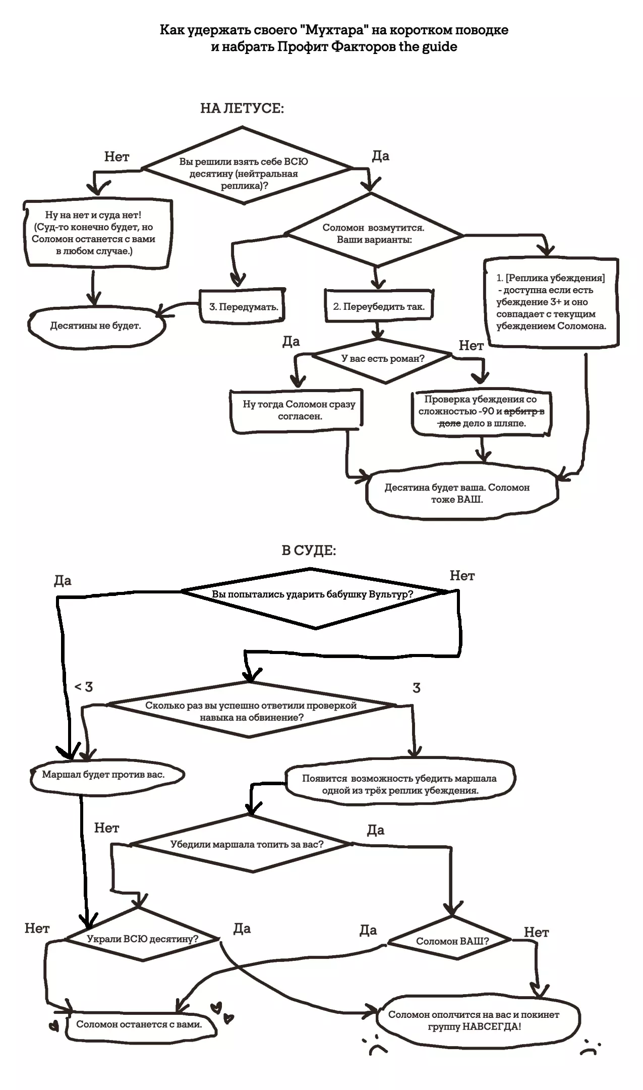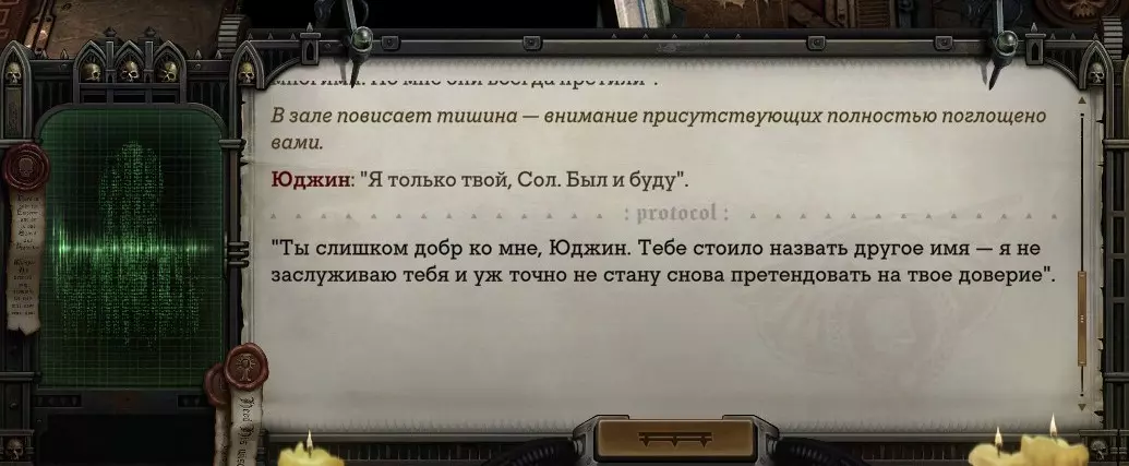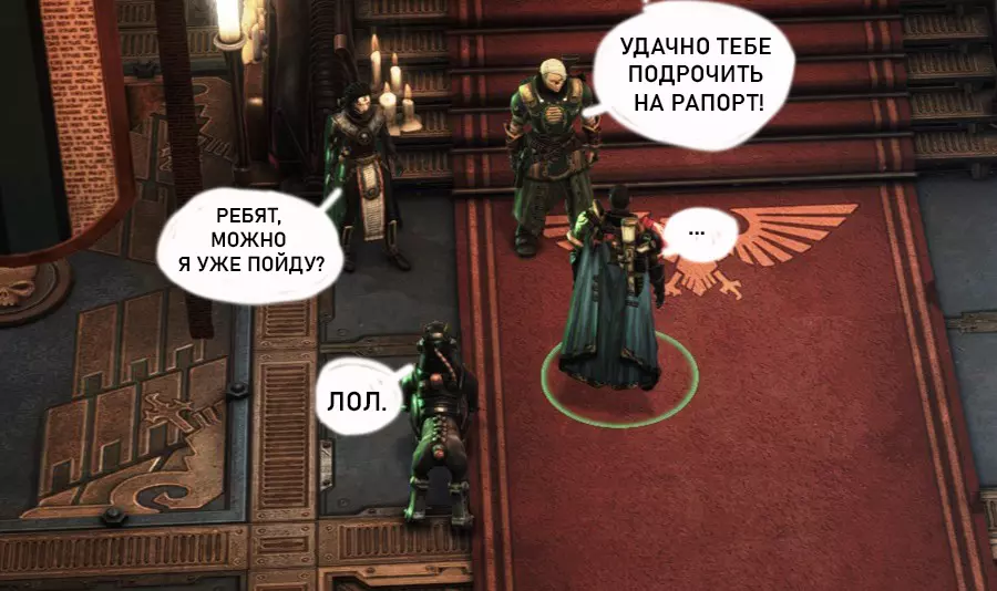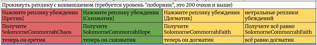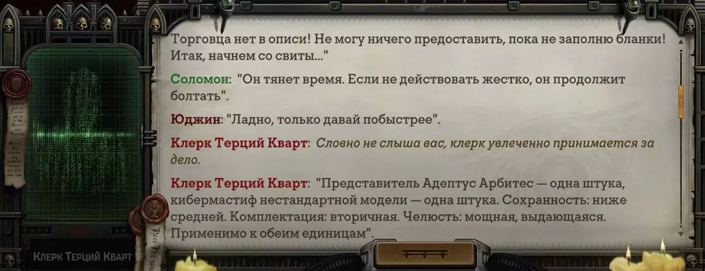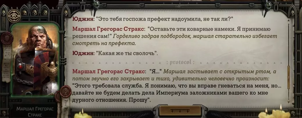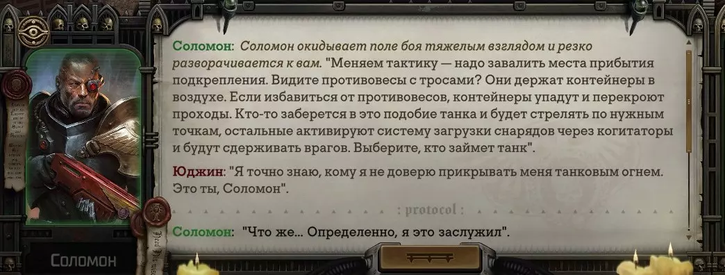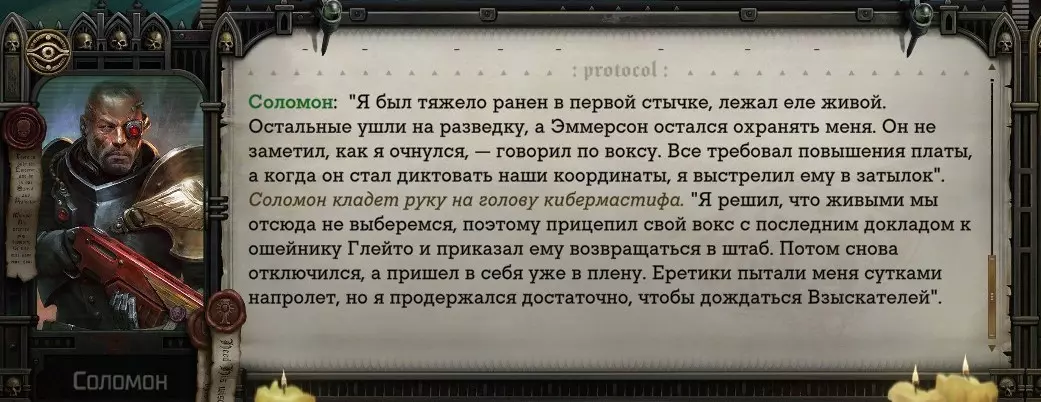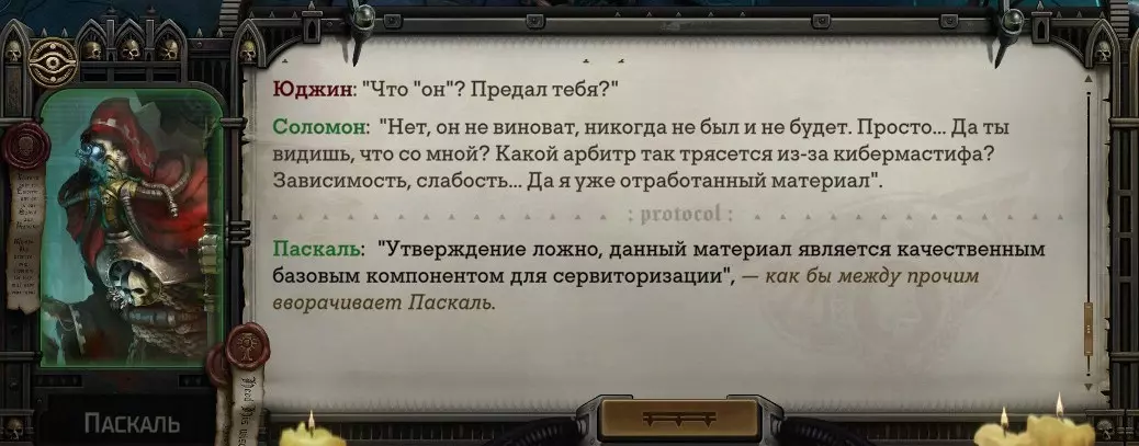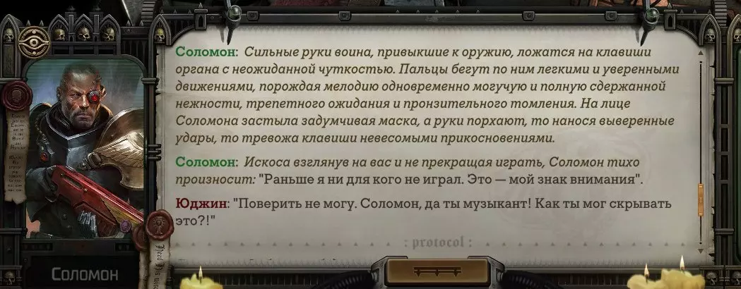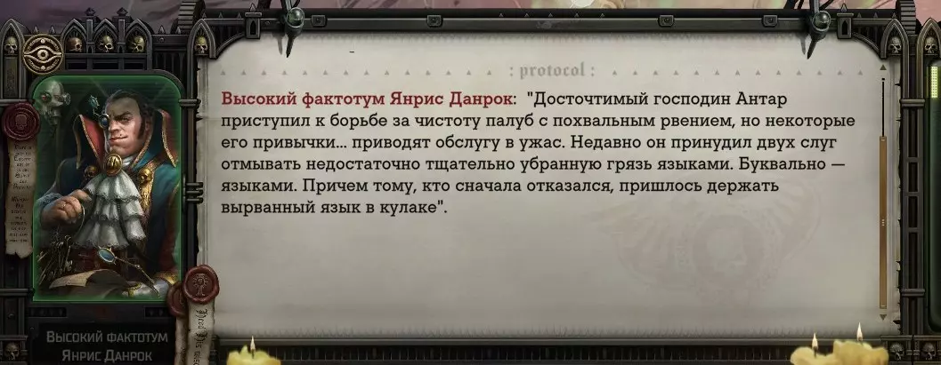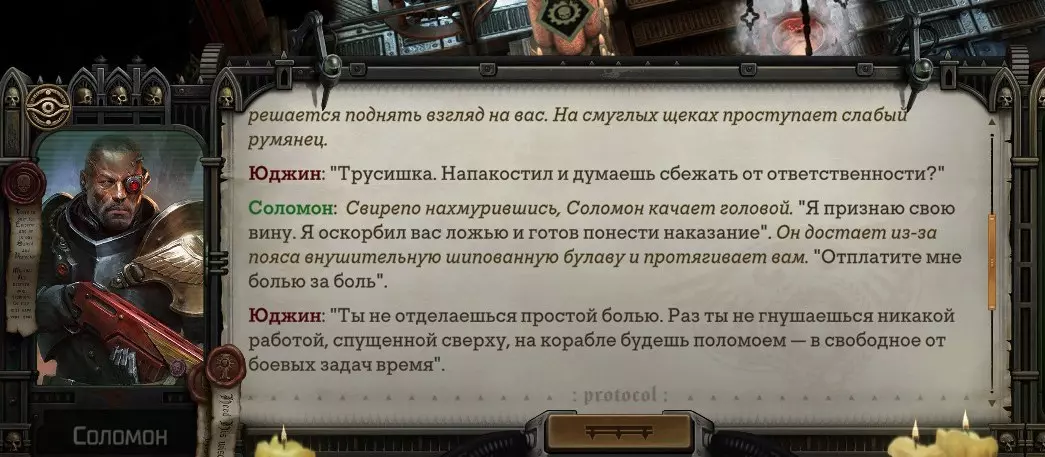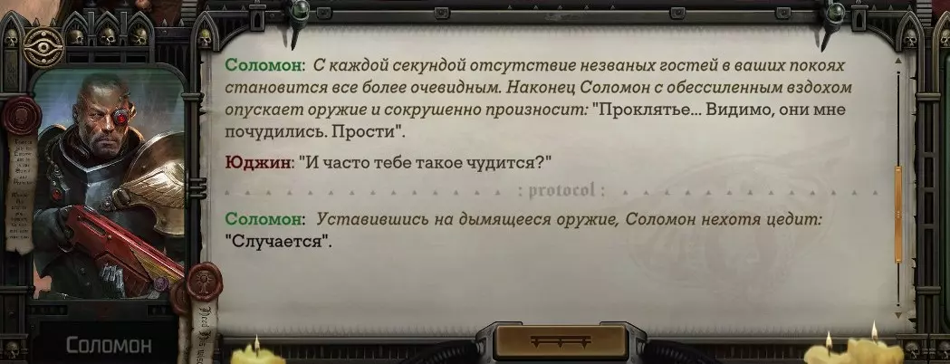 Гайд-обзор на роман проктора Соломона Антара из дополнения Lex Imperialis. С выходом на тру-концов очку и ачивку «Пламя». Предупреждения: гайд 18+, есть одно матерное слово на скрине. Вводные данные Тихого вокса, чегнари. Чё, как жизнь? Не хотите ли поглядеть на роман с новым сопартом из Lex Imperialis, а может и ачивку «Пламя» из него выбить? Если да, то вы по адресу, ведь я на этом, знаете ли, собаку съела. BA-DUM-TSS. Весь гайд состоит из спойлеров, спойлерных текстов, спойлерных скринов, абсолютно весь от и до! Имейте в виду. Что важно знать. Про рекрутинг нового сопарта и вообще Подобрать Соломона Антара можно даже в конце четвертого акта, запустив DLC в настройках игры после закрытия сюжетных квестов. Но это не так интересно, как пройти игру с самого начала (хотя сие и запарно, не спорю). Первая встреча с проктором будет на Райкаде, если вы запустили игру аж сначала. Снова напомнят о себе арбитры на Футфоле, после первой же беседы с наместником Владаймом Токарой. Вас позовут на потную миссию, куда лучше соваться с пати на уровне 20+. Поехать на эту миссию с лоулевельной пати — это жесть. Будете превозмогать и траить бои. Прим.ред: забудьте всё, что я написала. Бой понерфили. Если запустили ДЛЦ в середине прохождения, то проктор вылезет пообщаться после первого варп-прыжка и попросит торговца об аудиенции с маршалом Адептус Арбитес на Даргонусе. Арбитра можно шатать по мировоззрению, от еретика РТ он не сбегает как некоторые лояляхи. Но всё-таки кинуть торговца он может. Просто по другим идеологическим причинам. Сохраняйтесь почаще. Просто во избежание багов. А еще, поставьте себе мод-багофиксилку[www.nexusmods.com]. Это лучшее, что делали для игры сразу после Тойбокса. Атвичаю. Про романсовый контент Роман с проктором доступен как мужчинам, так и женщинам. Перед лицом Лекс Империалис все равны, в кровати с Соломоном тоже. За вывод арбитра на тру-концовку романа отвечает флаг SolomorneImpressed («Cоломон впечатлен», стало быть). И для успеха надо наколотить их как минимум три. Флаги тестировались на версии игры 1.4. Если вы видите, что тексты на скринах в гайде какие-то не совсем те, что у вас в игре получились — не пугайтесь. Два патча с момента релиза дополнения вносили стилистические (но не глобальные смысловые) правки в диалоги на романе Соломона. Суперкраткая выжимка гайда доступна в виде таблицы флагов[docs.google.com] романа мента. А здесь только стены текста, скрины, вещдоки, чушь собачья и полный Флекс Империалис. Я даже не буду скрывать, что писала руководство ради кека. Показывать и рассказывать про подводные камни буду на примере М+М романа. И если вы такое на дух не переносите — сейчас хороший момент, чтобы закрыть гайд, спасибо! СсылкиДругие стимовские руководства по тру-лаву моего пера: тру-роман дознавателя, романсим Кассию, угараем с Джай. И от ToxicBulb: 120 дней Содома с Маражаем, греко-римская борьба в кровати с ассасинкой культа смерти. + общая табла флагов ВСЕХ персонажей[docs.google.com] от ToxicBulb. Хинты по роману с Ирлиэт тоже там есть, добавляйте в избранное и не тормозите. Вопросы по романсовым аспектам также можно сходить задать в тематическом обсуждении, велcum.┌( ಠ_ಠ)┘ Акт 1. Мы встретились в странный период В составлении этого гайда нам помог отпетый крайм-лорд Юджин (Евгений) фон Валанциус. Патент-то он получил, да привычка «нагибать легавых» (во всех смыслах) никуда не делась. Хехе. ( ͡