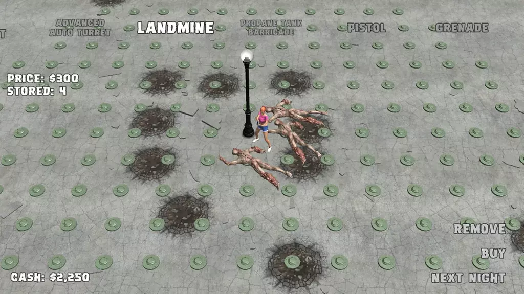 仅使用地雷在第9夜或更高难度下存活。只需购买电锯和一些路障,撑过8个夜晚。不要花太多钱,留意促销活动。然后在第9夜开始前拆除所有路障,全部种下地雷(196个)。它们不会炸掉所有东西,但肯定能成功。效果很棒。