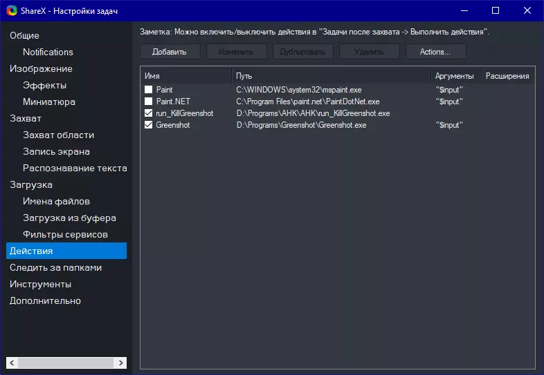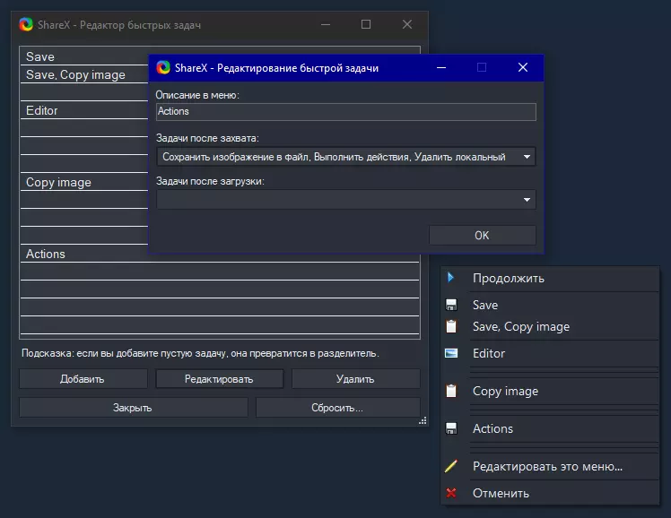 目前ShareX无法在快捷菜单中便捷使用多个命令行操作,所有命令会依次执行,无法进行选择。是的,您可以为命令行操作分配单独的热键,但不得不承认,为每个应用程序单独设置热键并不方便。我希望按下一个热键并截取屏幕后,能直接在快捷菜单中决定如何处理截图,而不是还要去其他地方操作。 不过原则上我已经为此创建了一个临时解决方案。 我们将使用以下工具: 1. ShareX 2. Greenshot 3. AHK脚本 软件安装和快速设置: 1.安装ShareX后,为快捷菜单创建包含以下任务的项目:保存图像到文件、执行操作以及删除本地文件。
