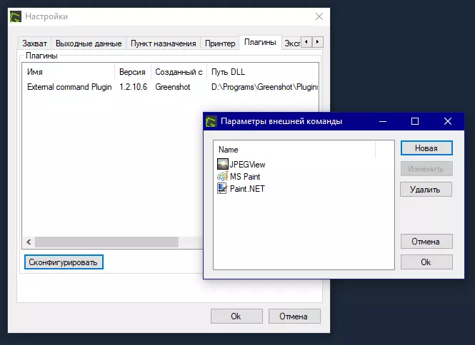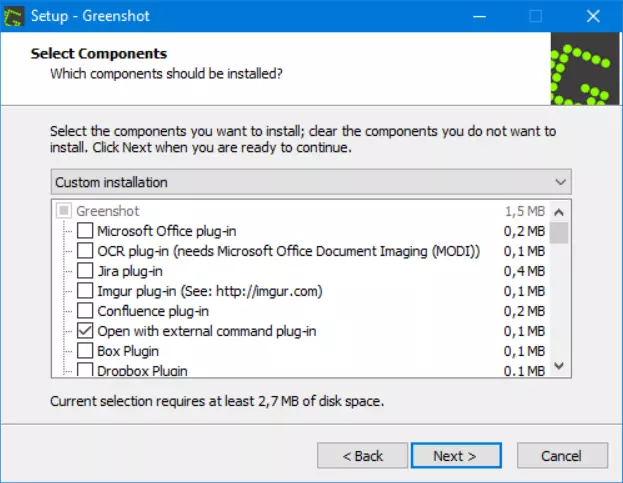 安装Greenshot时,在组件中仅选择【外部命令打开插件】,以及【俄语】。