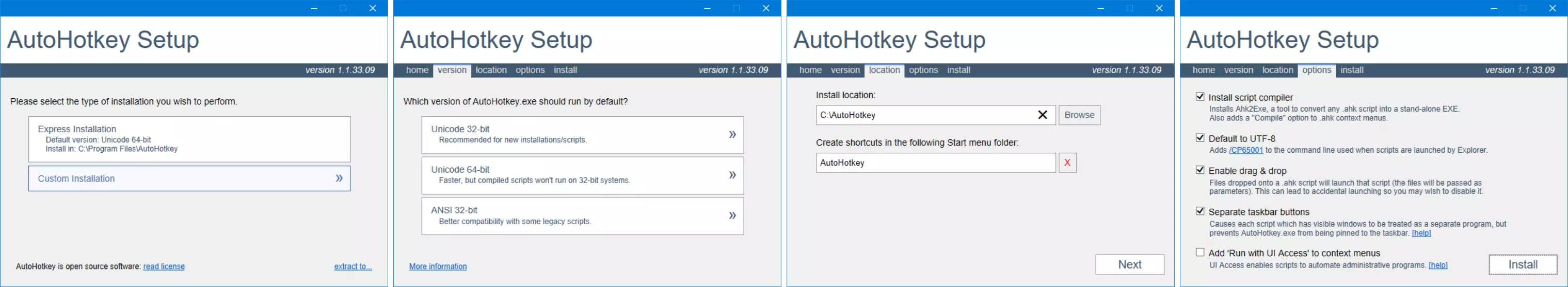 3. AHK可以通过快速安装进行安装,也可以通过自定义安装,这样就能指定程序的安装文件夹。