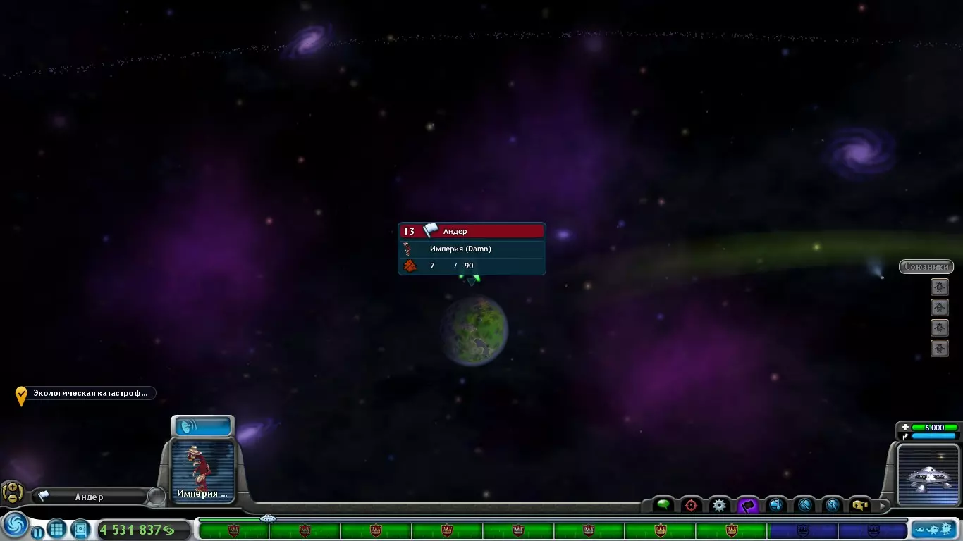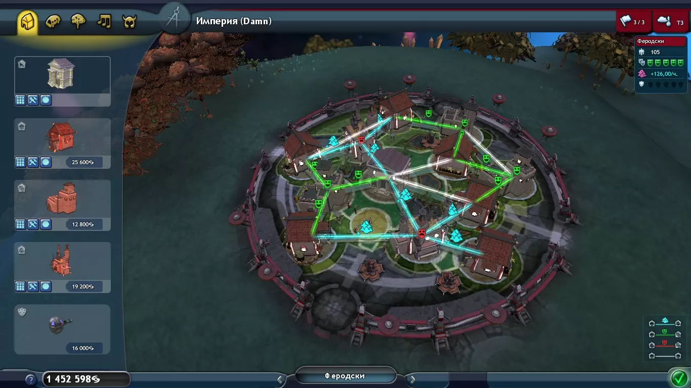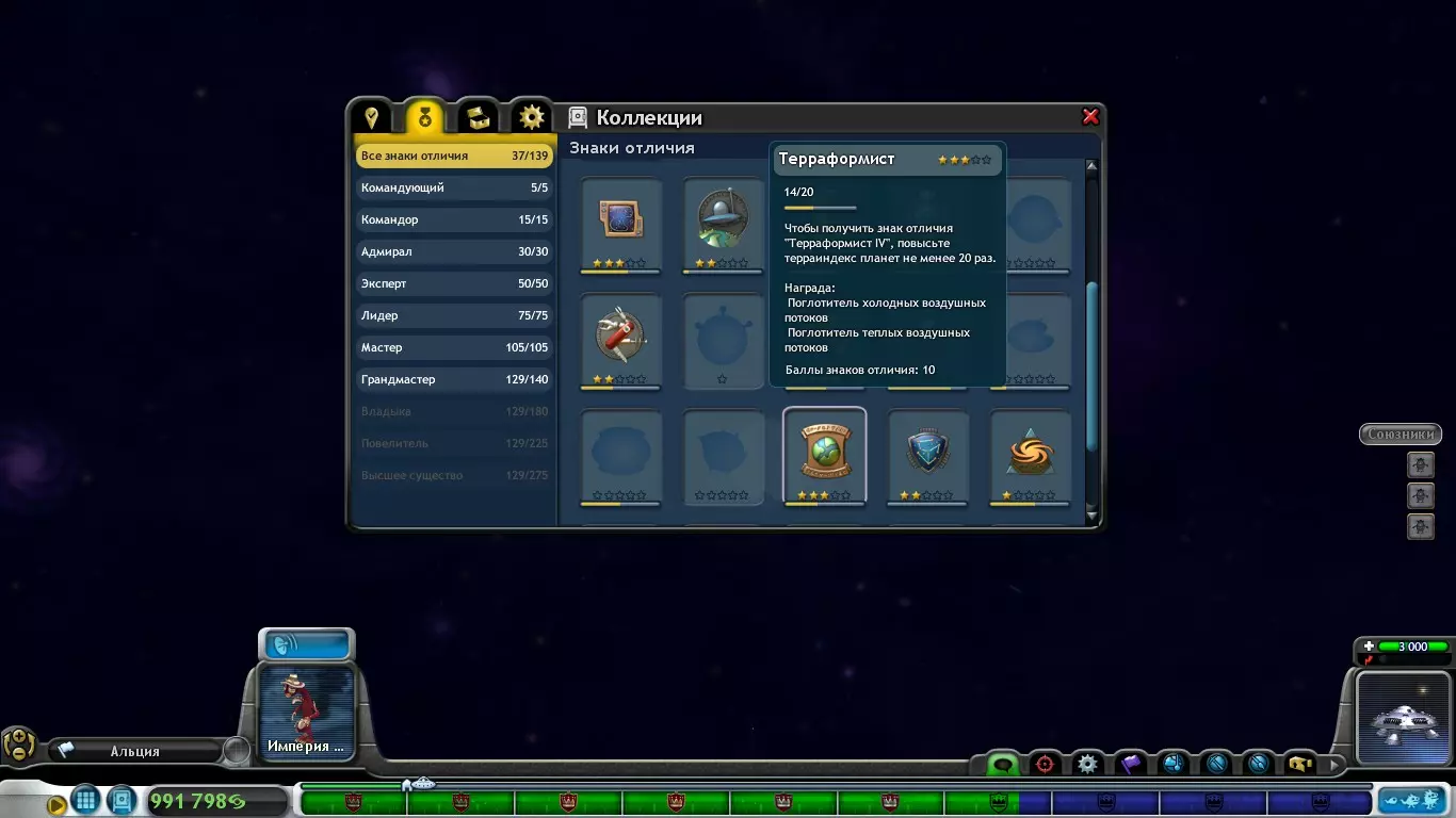 如我们所见,这里出现了一个友好的帝国(绿色笑脸)。要与其他帝国建立友好关系,需要完成他们的任务、进行贸易,或者提升对方帝国殖民地所在星球的地形指数,这样就能通过“帮助星球”来改善与该帝国的关系(+30,若将地形指数提升至T3,则+100),但与格罗克斯人的关系会因此恶化(-100)。同时,在这个系统中,所有三颗行星上都只有黄色香料,因此这个帝国可以高价收购除黄色以外的任何香料(香料价格随机选择)。此外,表情符号左侧显示的是帝国等级,等级高低由帝国所拥有的恒星系统数量决定。1级:1–3个星系 2级:4–5个星系 3级:6–8个星系 4级:9–12个星系 5级:13个及以上星系 帝国等级会影响其是否愿意以高价购买香料(例如3级帝国与1级帝国相比,3级帝国通常会以更高价格购买香料)。此外,帝国等级还会影响盟友的生命值(当你向帝国请求支援时)。1级 - 425生命值 2级 - 625生命值 3级 - 1250生命值 4级 - 1850生命值 5级 - 2500生命值 此外,只有4级及以上的帝国可以发布与更换哲学相关的任务。 当你与某个帝国签订贸易协议后,当进度条达到终点时,你将可以购买该帝国。购买星系的价格取决于该星系内最高的地形指数等级: T0 - 500000斯波林 T1 - 1000000斯波林 T2 - 3000000斯波林 T3(3座城市以内)- 5000000斯波林 T3(3座城市以上)- 10000000斯波林 太空 - 星球改造 星球改造是太空阶段最重要的事项之一,甚至可以说是最重要的。因为不摧毁其他帝国,你也能获得许多成就,这些成就将为你的宇宙飞船解锁各种强化。如果掌握了地形改造技术,你就能在行星上开采香料并建立殖民地。