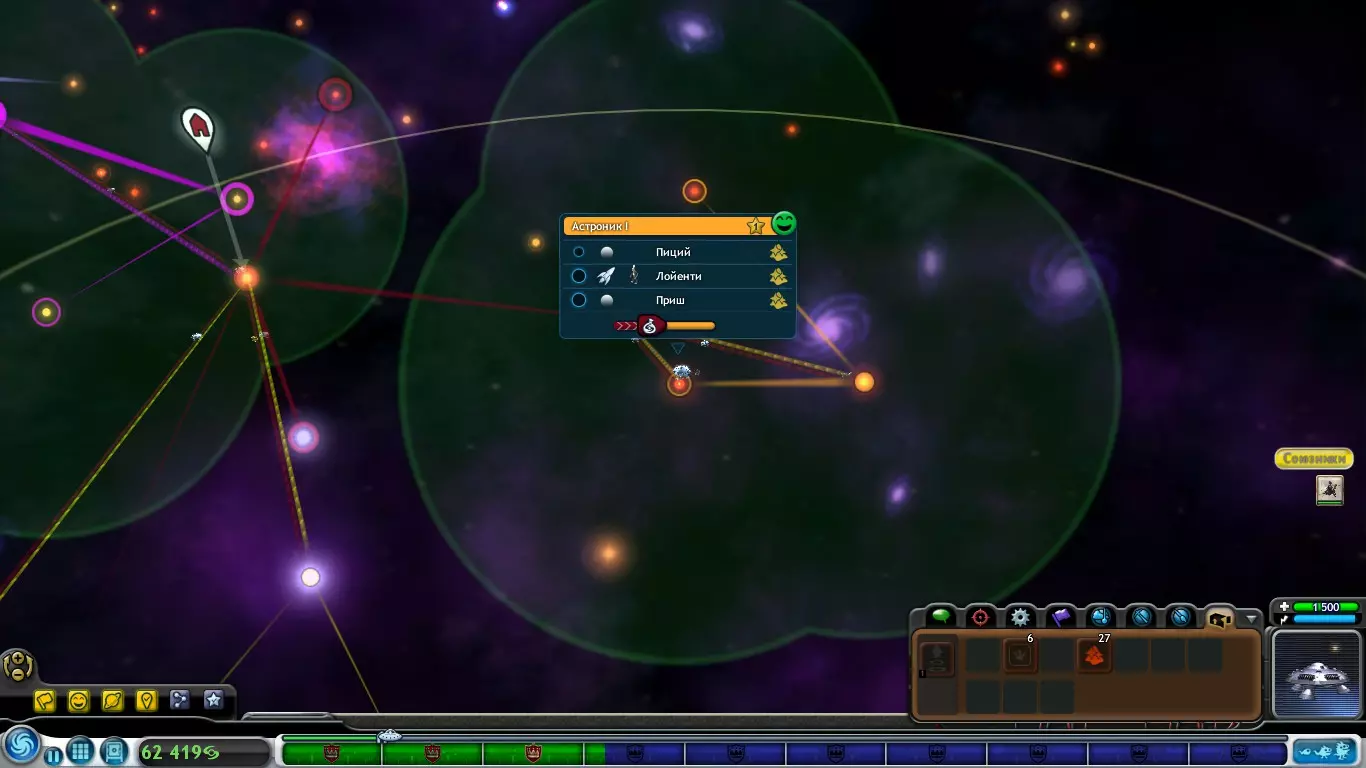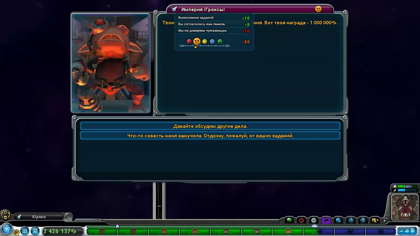 最终,在这样的布局下,我们每小时能获得126个香料。如果用这种方式建造其余2个殖民地,采集量将会非常巨大,你只需要及时收集即可。此外,还有【香料仓库】,它能使存储的香料数量翻倍,即最多可存储30个香料。遗憾的是,每个星球只能放置1个香料仓库。宇宙 - 格罗克斯人 请记住,我们的主要任务是抵达宇宙中心。 当你前往宇宙中心时,你会遇到格罗克斯人帝国,他们对你的态度会非常负面(-70 我们不信任外星人)。