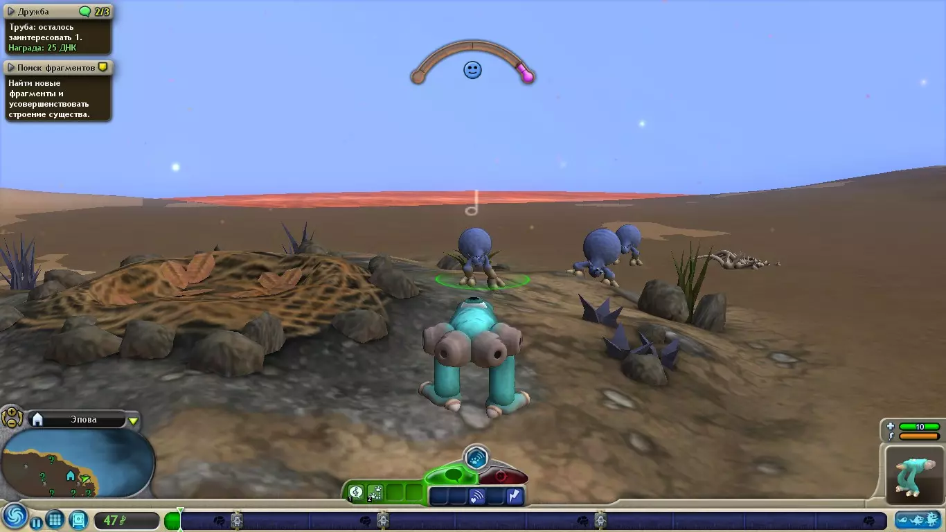 要和它们成为朋友,需要模仿它们的动作,它们唱歌我们就唱歌,它们跳舞我们就跳舞。重要的是要知道,如果它们的某项技能等级高于我们(例如我们的歌唱等级是2级,而它们是4级),我们就无法和它们成为朋友,因为在互动时我们无法匹配进度条。它在做一些动作——进度条从右侧填充,当你模仿它时,进度条从左侧填充,你需要一直模仿直到进度条对接。需要注意的是,另一个生物的进度条只能到中间位置,不会向你的方向移动。当生物那边的进度条到达中间位置时,你将无法和它成为朋友,必须从头开始填充进度条。