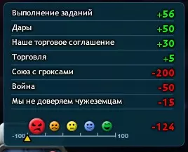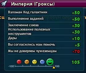 7. 最后一步,你需要使用千兆 detonator 摧毁格罗克斯附近的5颗行星。对于所有帝国,这将导致【银河代码破解】(-105),而对于格罗克斯,每用千兆 detonator 摧毁一颗行星将获得(+14)。 8. 之后你可以与格罗克斯结盟(至少75点)。如果你的点数不足,且对方反对结盟,那么选择下一行对话:外交->缔结同盟->我该怎么做才能让我们缔结同盟?之后,格罗克斯会给你另一个任务,完成该任务可获得+5点,并且会添加“你同意帮助我们”的文字。 与格罗克斯改善关系的完整列表如下: