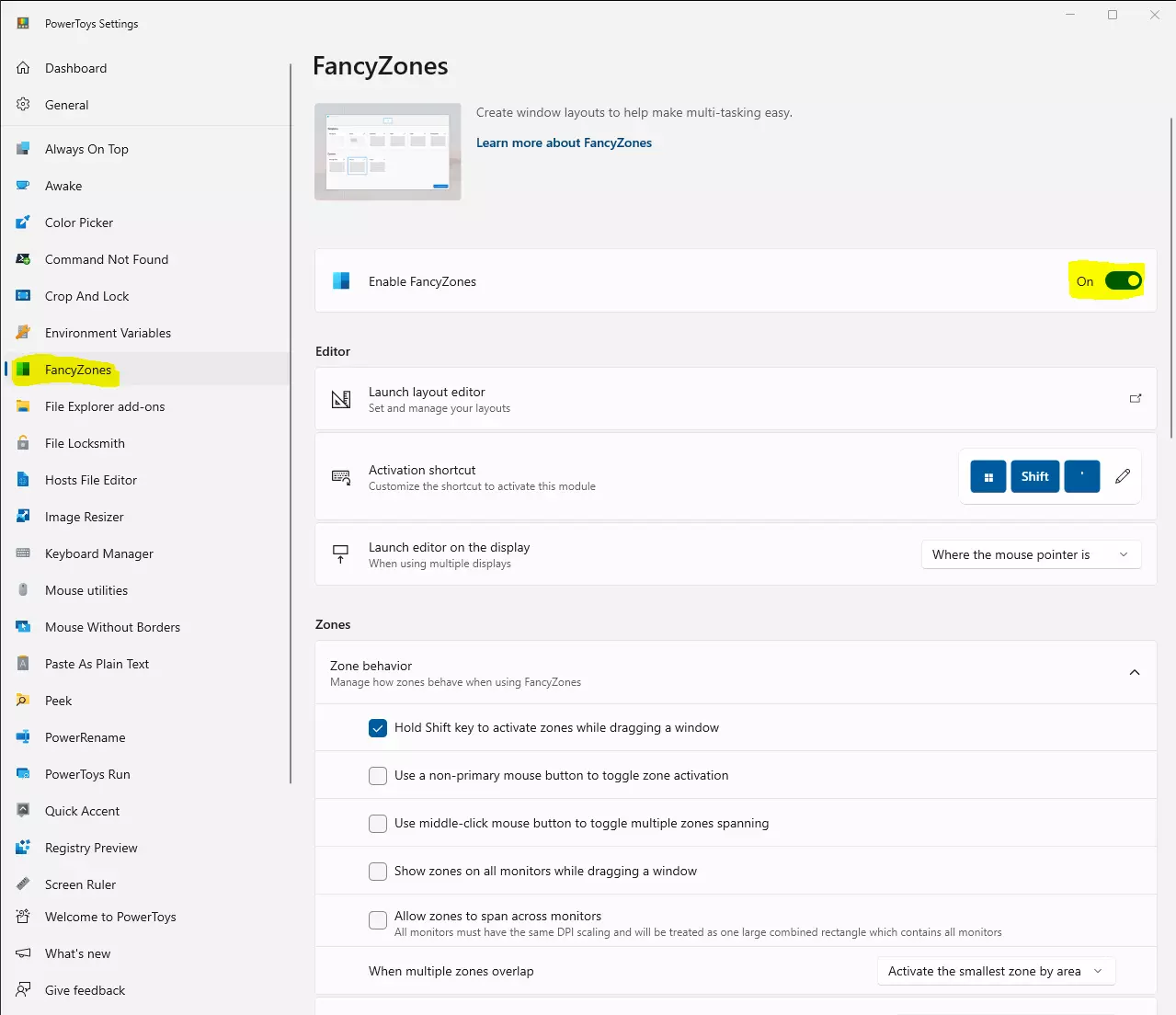 FancyZones的安装与配置 首先,从Microsoft store或其Github页面安装PowerToys应用。默认情况下,这会创建PowerToys的开始菜单快捷方式。 安装完成后,从开始菜单打开PowerToys应用,然后转到窗口左侧的FancyZones。确保启用FancyZones已打开(默认情况下应该是开启的)。