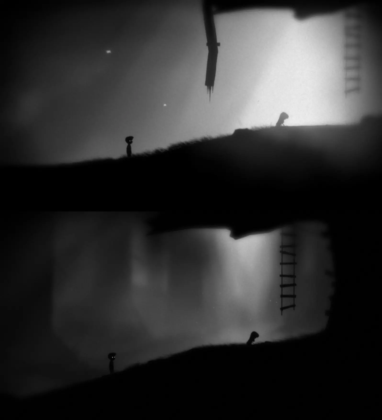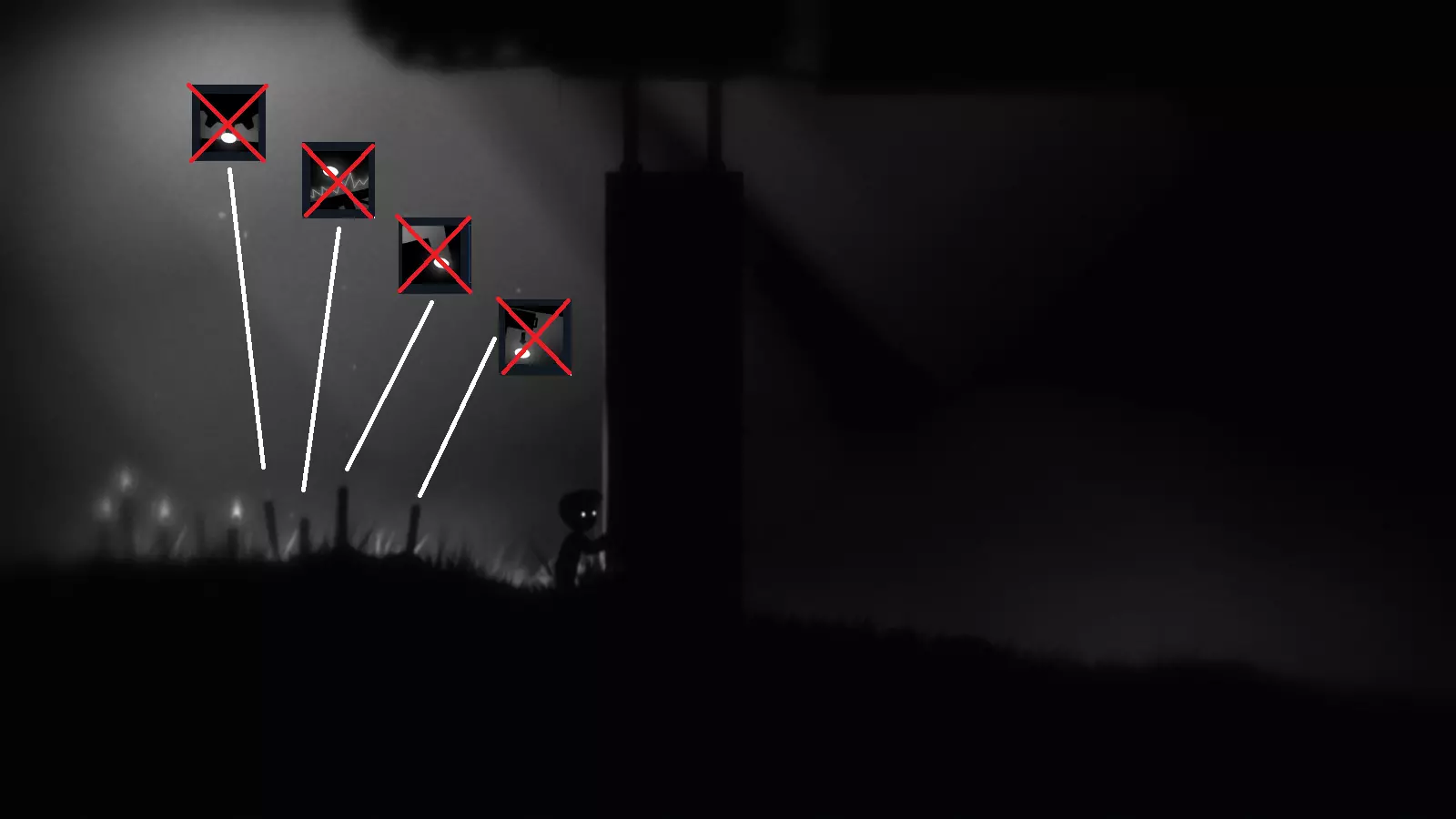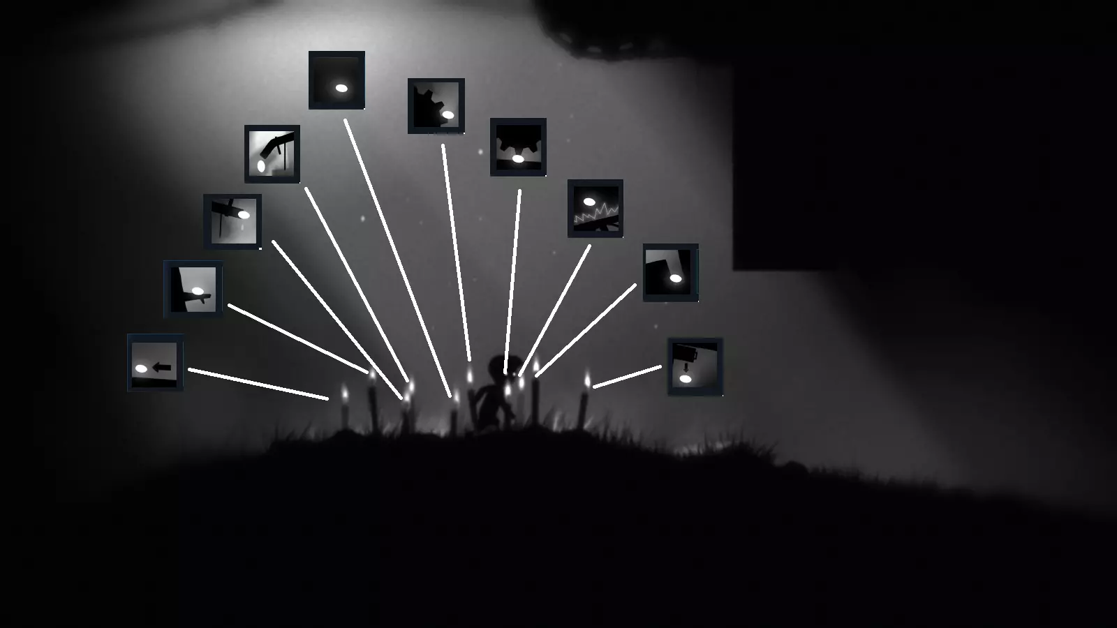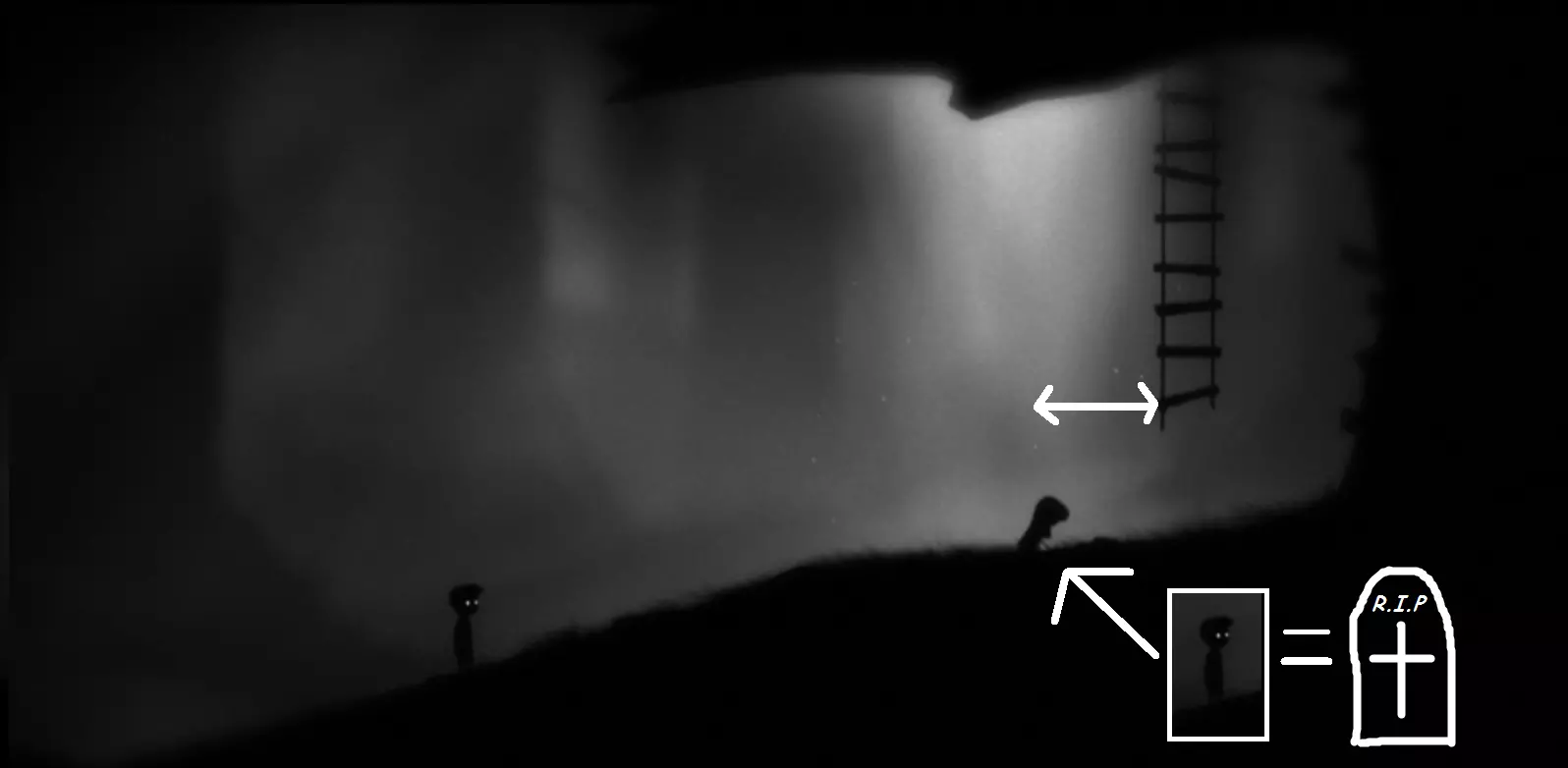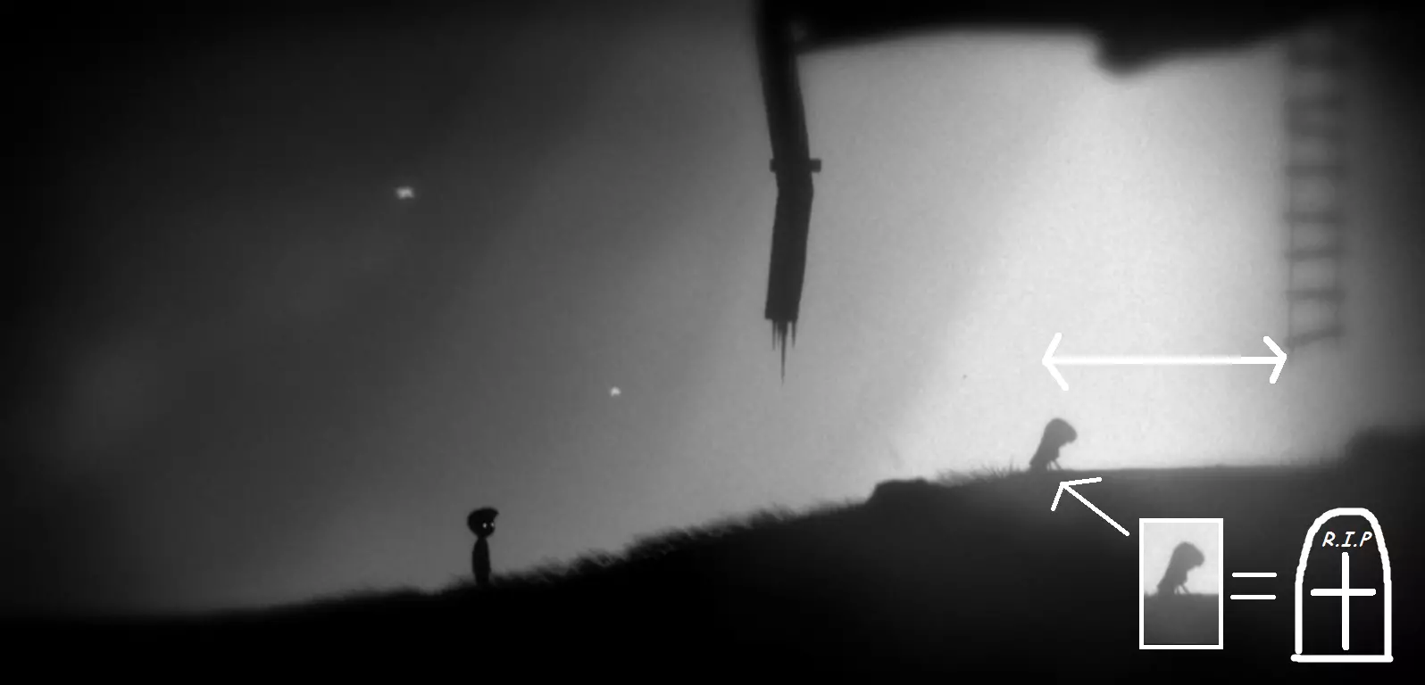 他穿越【地狱边境】,途经不同的地方,始终躲避着死亡——无论是遭遇陷阱、蜘蛛、其他人(不知为何他们试图杀死我们),还是其他种种危险,因为死亡一直想将他永久拖入地狱。