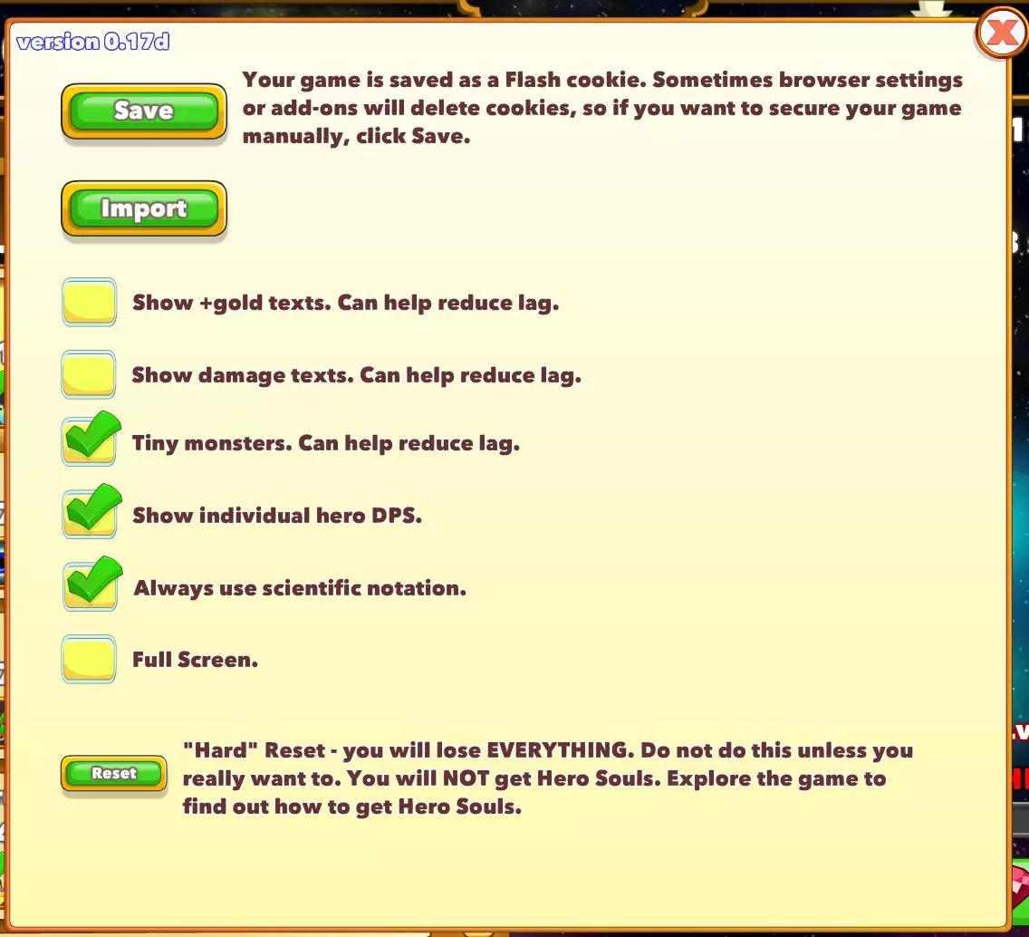 SaveFrom here you can make a save of your progress so far. On clicking the save button a collection of text that encodes your games current state is copied to the clipboard, ready for pasting into one of the on-line tools that have been developed for the game, and a save dialogue is opened to create a text file that contains a copy of the same code. Note that, the game also uploads a copy of you game to the Steam cloud when you exit the game. If you suffer a powercut or other abnormal way in which the game is closed, your progress may not be saved when you next open the game. As such performing a manual save periodically is generally advised as a good idea. The Steam version of the game by default saves in the following location. C: Program Files Steam steamapps common Clicker Heroes clickerHeroSave.txt ImportThe next option allows you to import a saved game by copying the code from within a save file and pasting it into the window where indicated. When importing a game in this fashion, the time since the save was made will be treated by the game as if you were in the off-line farming mode. TogglesNext are a series of toggles. 'Show +gold texts' and 'Show damage texts' toggle the display of the quantity of gold collected form each coin and the damage done with each click respectively. Toggling them off can help if the game becomes laggy. 'Tiny monsters' toggles if the monsters scale in size with the current zone level that has been reached. This is purely visual and has no effect on the monsters health or gold dropped. Toggling it on can help if the game is suffering slowdown. 'Show individual hero DPS' toggles the display of how much DPS each hero is currently contributing on their bar in the left hand pane. 'Always use scientific notation' toggles if all numbers are displayed using conventional notation, e.g. 6,341B or scientific notation, e.g. 6.341e12. As numbers reach very high levels they will automatically switch over to using the scientific notation but this toggle allows that to happen from the start. The final toggle switches the game to running in full screen. At the time of writing(0.17d), in order to close the game it is necessary to switch back out of full screen before you can exit the game.ResetThe final button on the options page allows you to perform a hard reset, causing all progress made in the game to be completely reset. Steam achievements will remain awarded, but otherwise it will be as if you had started the game for the first time again. It is heavily advised that you make a save prior to doing this and periodically through normal play to guard against accidental use. Controls While most actions in Clicker Heroes are performed by the mouse, there are also a number of keyboard short-cuts and modifiers. Key Effect Shift When upgrading a Hero or Ancient, upgrade by up to 10 levels per click. z When upgrading a Hero, upgrade by up to 25 levels per click. When upgrading an Ancient, upgrade by up to 1,000 levels per click. Ctrl When upgrading a Hero or Ancient, upgrade by up to 100 levels per click. q When upgrading a Hero or Ancient, upgrade by the maximum number of levels that can be afforded when clicked(Actually caps at 9,999 levels per click). a Toggles between Progress mode and Farm mode once unlocked. 1 Activate Clickstorm ability. 2 Activate Powersurge ability. 3 Activate Lucky Strikes ability. 4 Activate Metal Detector ability. 5 Activate Golden Clicks ability. 6 Activate Dark Ritual ability. 7 Activate Super Clicks ability. 8 Activate Energize ability. 9 Activate Reload ability. Note: when using q to add a very large number of levels, it may be a good idea to hold Shift first to avoid lag problems experienced by some players. Game Modes The game has three main modes of play, Active, Off-line and Idle. Only the first two will be available on your first run and on following runs until one of the Idle Ancients is purchased. ActiveThe game is in active mode if it is open and there has been a click causing damage to a monster or an ability has been activated within the last 60 seconds. Progress can be made to higher zones. Off-lineThe game is in Off-line mode if the game window is closed. In this mode, gold is acquired based on your heroes total DPS and the highest zone level that is accessible, as seen at the top of the screen. No progress to higher zone levels will occur while in Off-line mode. If not in Idle mode when going off-line, it will be calculated as if Idle mode had been entered at the same time as if the game had been left running. If a game save is imported, the time since the save was made will be treated as if the game was in Off-line mode until the time of import. IdleIdle mode becomes available once one of the Idle Ancients, Libertas or Siyalatas is purchased. Idle mode is entered 60 seconds after the last ability was activated or 60 seconds after the last click that would cause damage to a monster occured, whichever is the later. Progress can be made to higher zones. Idle mode is broken as soon as an ability is activated or a click is made that would cause damage. Notably, clicking on a clickable that appears within the game area(currently appearing as a small headcrab as of Steam version 0.17d) does not break the idle mode. Progression/Farm modeFollowing the first ascension after beating the boss on zone 100, a new button can be seen on the right-hand side of the screen. This toggles between Progression and Farm modes, where Progression mode causes the game to advance to the highest unlocked zone upon the death of the current enemy while Farm mode causes the game to remain on the current zone level. If a Boss is not defeated within the allotted time while in Progression mode, the game will automatically change to the prior zone level and switch to Farm mode. This is to allow gold to be accumulated to enable the upgrading of Heroes to defeat the boss that blocked progress. Getting Started Zone 1You will be visiting many, many times. On the right
