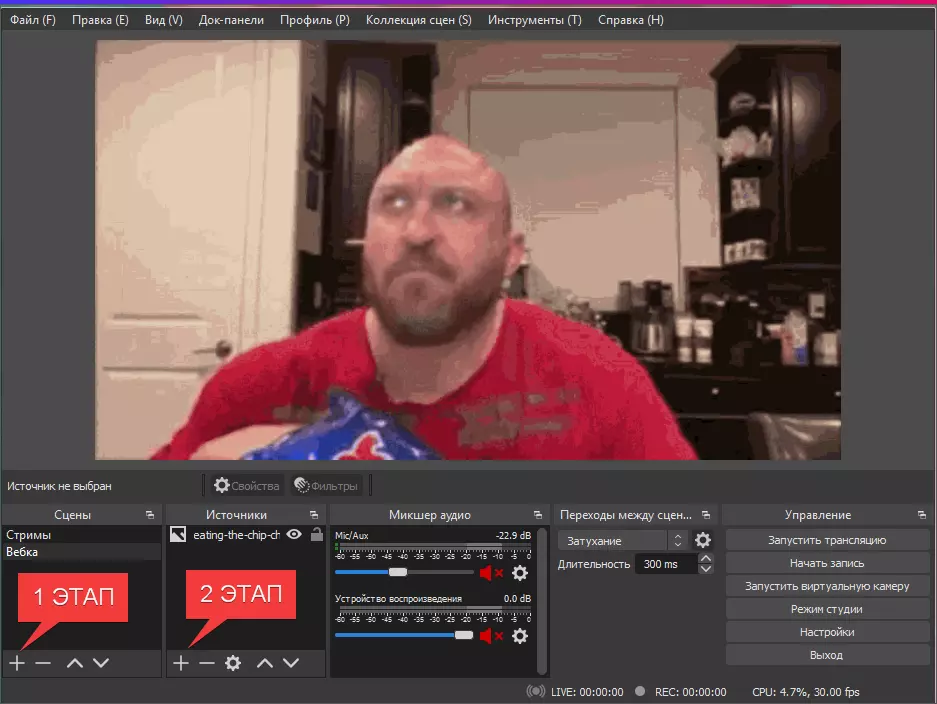 2. 启动OBS并进行准备工作! 当你启动OBS后,需要对其进行设置以确保舒适使用!(具体设置方法可在视频平台搜索,此处不再详细说明) 同时下载你后续将使用的图片或GIF动图! 3. 创建场景并添加图片或GIF动图 第一阶段 - 创建场景。1. 点击加号后会出现一个窗口,用于命名场景,输入名称(或保留默认名称:场景1),然后点击“OK”! 2. 第二步 - 添加图片或GIF。 点击加号后,点击“Изображение”(如果是GIF,操作相同)。 输入来源名称(或保留默认名称),然后点击“OK”。 之后点击“Обзор”并选择任意图片或GIF。 点击“OK”。 根据需要调整大小...