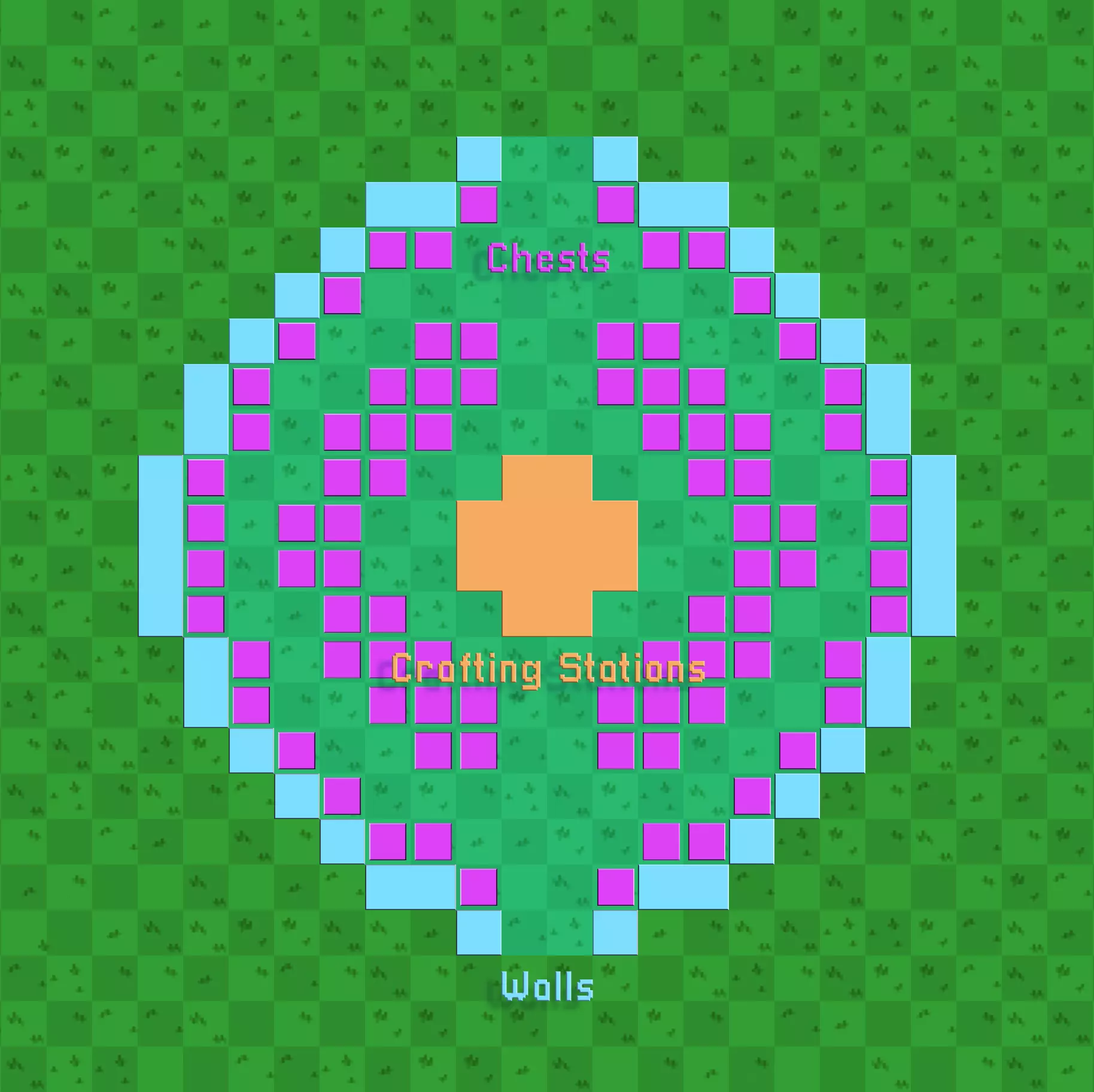 游戏中有14个制作站,但其中只有9个可以使用附近的储物箱,分别是: 高级工作站 炼金台 木工台 烹饪锅 烹饪站 恶魔工作站 铁砧 烤架 工作站 我设计这个布局时考虑了6个制作站,因为它们在游戏后期会合并。因此,布局中的制作站为: 高级工作站 炼金台 木工台 烹饪站 铁砧 这是游戏后期的制作站布局。 储物箱 至于储物箱,我只是将它们布置在房间布局中。