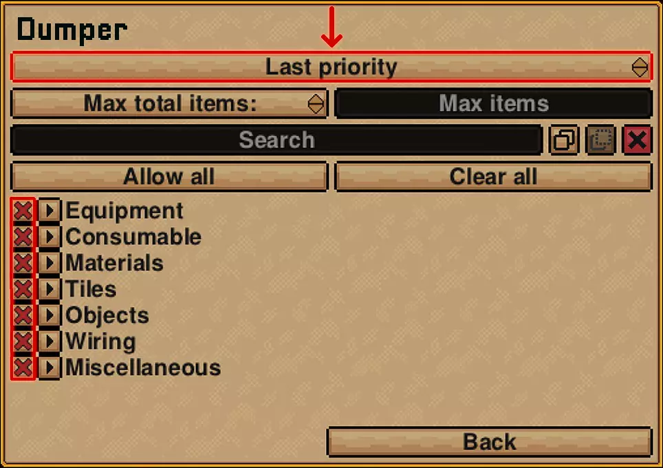 强烈建议制作一个【丢弃箱】,在其中将所有物品标记为X并设置最低优先级。