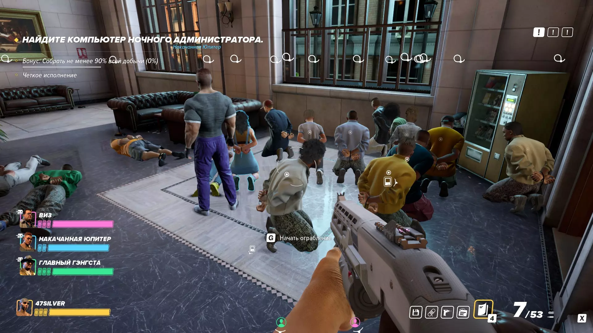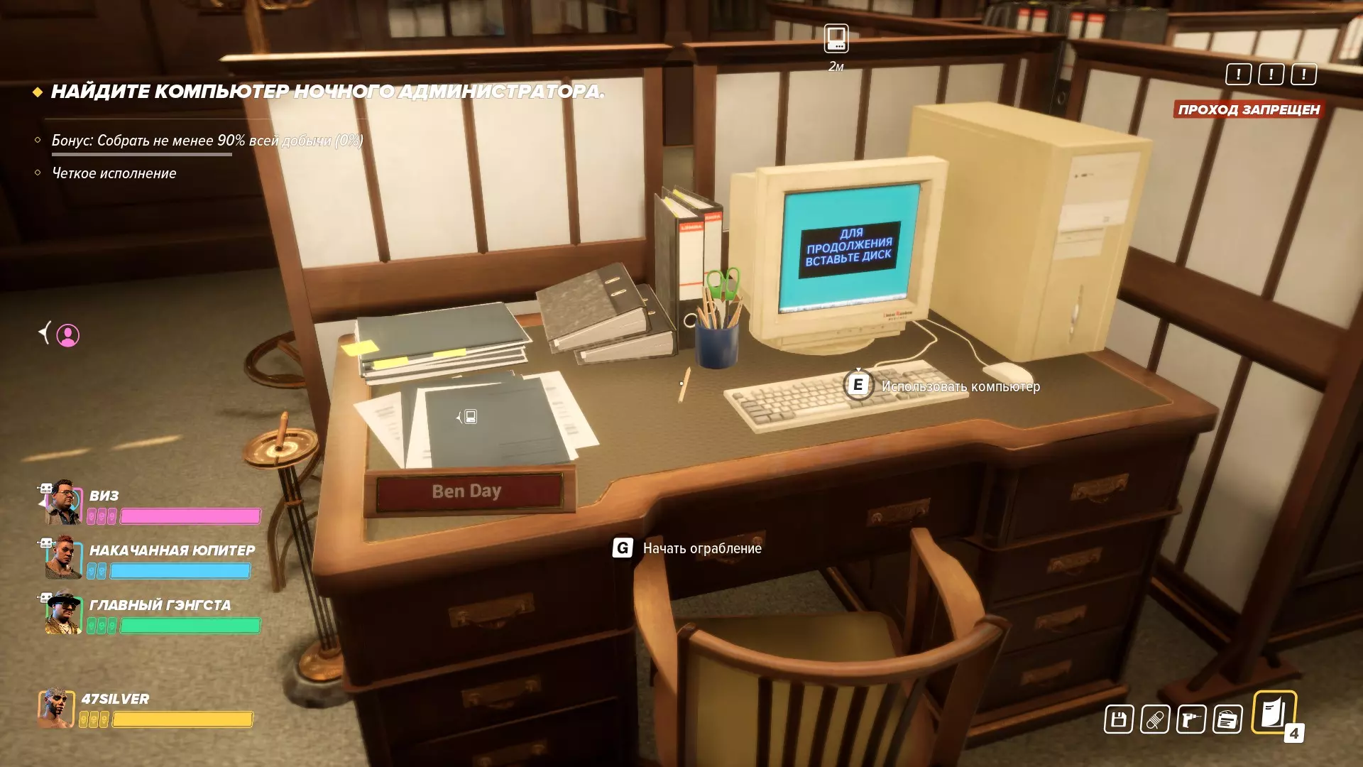 悄无声息地抢劫仓库 别出声! 今天我们要在不触发警报的情况下清理银行的秘密仓库(极限难度)。实际上,虽然由于访客众多而颇具挑战性,但这完全是可以做到的。首先:自然是关闭监控摄像头。其次,【必须】以任何方式制服所有保安,我个人更喜欢用麻醉针。别偷懒,再检查一遍银行的每个楼层。要确保保安已经不在了,或者被悄悄制服后藏在某个角落。在三楼,我们找到了夜班经理的名牌。