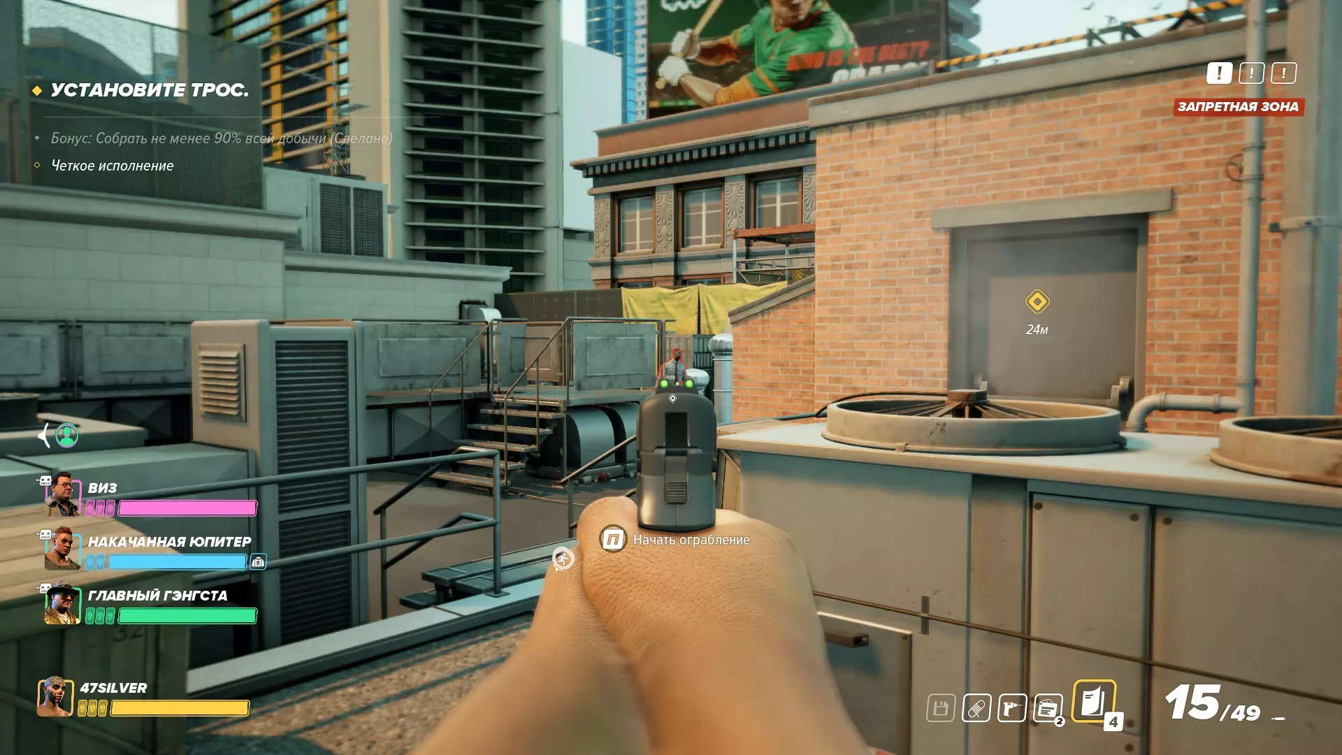 我们再次回到本的电脑前,这次要启动它并打开隐藏的储物间。进入储物间后,把电钻调到最大功率,然后迅速冲向大楼入口去迎接新“客人”(把他们控制住并引到一边)。接下来带着战利品上到屋顶,要注意那里还有最后一名保安。