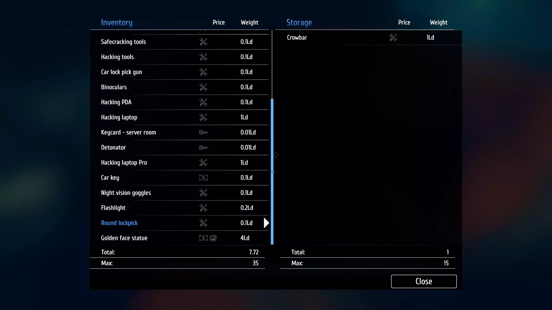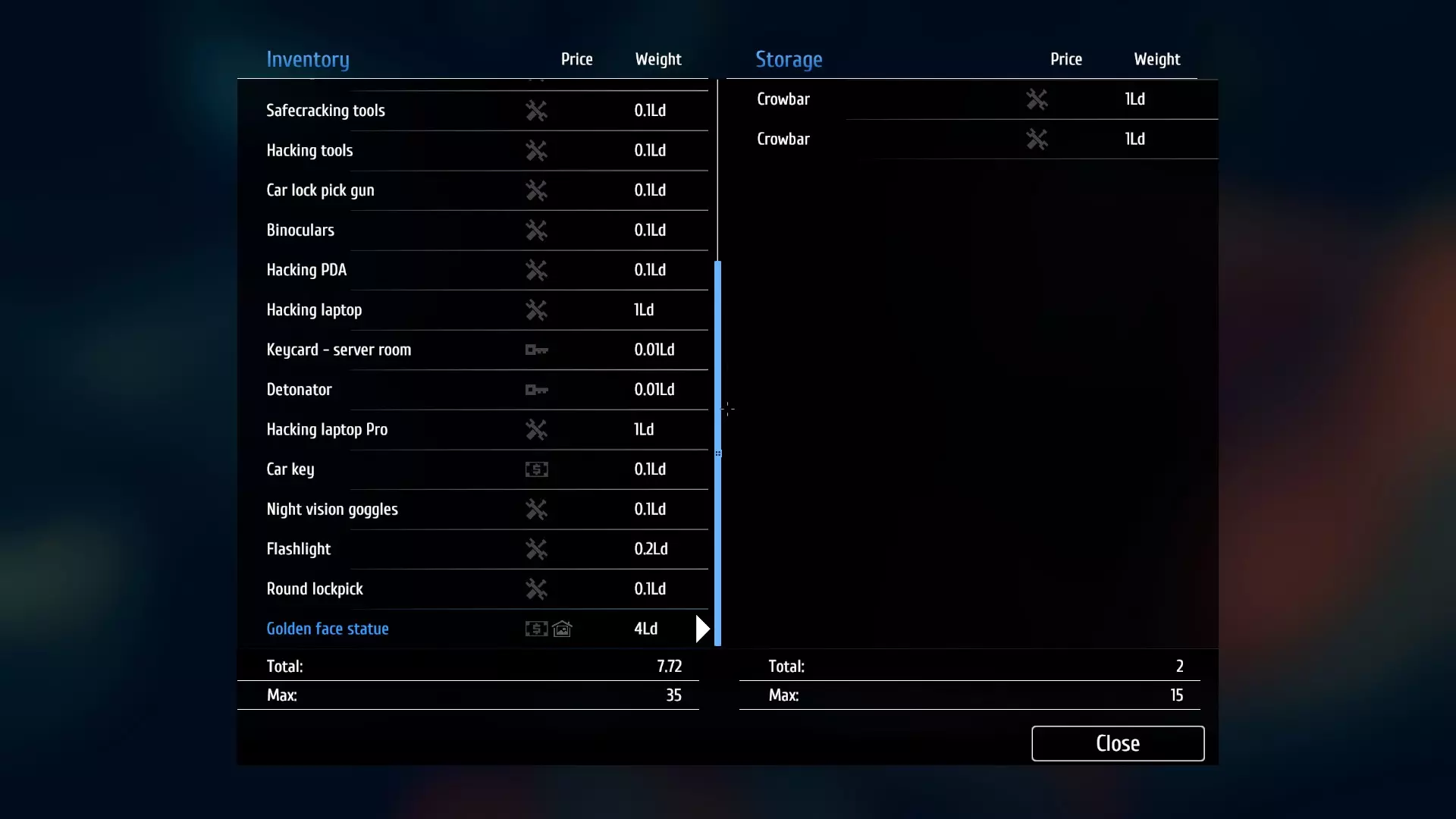 它会一直留在车里和/或特定的储物柜中,即使你离开该区域后再回来也是如此。不过,有些人可能和我犯了同样的错误,囤积了太多备用工具,而你希望除了一个之外的所有工具都消失(截图显示了我不再需要的两个复制撬棍)。