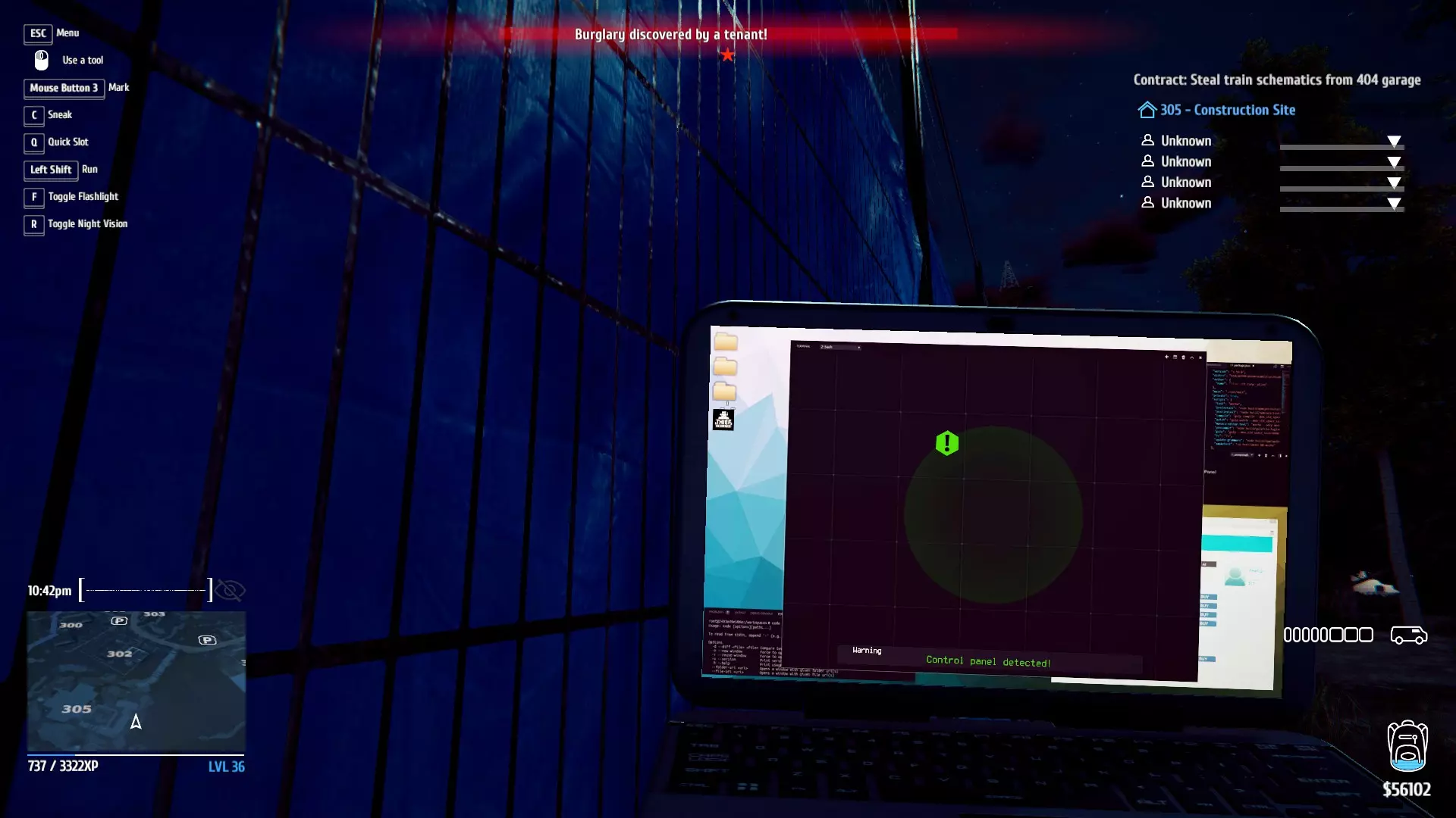 这是因为如果你进入黑湾,就可以出售物品。到了游戏后期,可能还需要你拥有多个该物品才能出售。有些物品只能通过黑湾出售,而有些物品则可以在任何地方出售,比如当铺/废品场或黑湾。如果你能通过黑湾出售物品,通常能获得更多的钱。 什么会引起租客警觉? 我提到的内容一半来自我自己的实验,另一半来自Steam用户Sgt. Kelp。因为之前有人问过非常类似的问题,他通过自己的实验给出了答案。 门和窗户 如果你打开窗户或门并让它们一直开着,租客看到的话会注意到。 如果窗户有破洞或被撬棍撬开,租客看到的话也会注意到。如果你关上之前锁着的门或窗户,而他们使用了这些门或窗,他们会察觉到异常。 如何确保他们不会发现: 你必须重新锁好窗户或门。同时,要确保他们不会注意到破碎的窗户。或者选择他们不会看到或使用的门/窗。 噪音、视线和抽屉 如果他们从远处透过窗户看到你,警戒等级会迅速从黄色变为橙色,再变为红色。 如果你靠近窗户或出现在他们面前,警戒等级会立即变为红色。 如果你出现在所有住户面前,他们会寻找掩护,但如果你离开,他们就会报警。 如果你制造大量噪音,他们会报警。 只有当住户进入有打开抽屉的房间时,他们才会在意那些打开的抽屉。汽车/货车特技 如果建筑物内有住户,他们会注意到并迅速报警。 如果建筑物内没有住户,住户则不会在意。 如何在通关 credits 后继续游玩? 进入个人资料并选择存档,应该会加载到最后一次保存的进度。如果找不到存档文件,我有另一篇指南尝试帮助恢复存档。 是的,你可以在通关 credits 后继续游玩,游戏结束后甚至还有一些小型任务。 如何重新锁上迷你电子锁? 关于这个问题我其实制作了一个视频以便更轻松地解释。总之,当你解锁门后,可以使用 M3;如果不是在 PC 上,游戏应该会提示你按住哪个键来重新锁门。视频由Coolish_Person/Coolish_Channel(本人)制作 如果你不小心卖掉了202号复制画该怎么办? 起初我以为必须重新加载存档(我犯同样错误时就是这么做的)。感谢Steam论坛上的Dr. Bread,其实不必如此。在任务发生地点的房屋棚屋后,还有另一幅画。 黑客PDA vs 黑客笔记本电脑 vs 黑客专业笔记本电脑 由于游戏没有直接告诉玩家这些设备之间的区别,我花了一个小时制作了对比图表。如果有人想补充内容,欢迎告诉我。为了让图表更简洁,我有意省略了一些对比项。