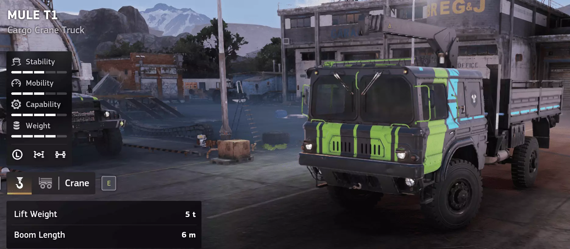 价格:27,000 评分:9/10 类型:货运/起重机支援 优点 集成起重机使其用途极为广泛。 就其尺寸而言,起重机强度出色。 越野性能优异。 非常适合作为搜救或通用支援卡车。 无需外部帮助即可自行装载和为其他车辆装载。 性价比高。 缺点 绞盘存在但无法使用。 稳定性略低于无起重机的车型。 后期会被更重型的起重机卡车取代。 单人实用性:9/10 在单人游戏中,这款卡车是出色的全能型车辆。内置起重机大幅减少了对其他车辆的依赖,使后勤工作更顺畅、更高效。在通行受限或地形恶劣的地图上尤其有用。 多人游戏实用性:8/10 在多人游戏中,它作为支援起重机车辆表现出色。尽管重型起重机卡车最终可能会取代它,但它的机动性和灵活性使其在很长一段时间内仍具有实用价值。 游戏玩法说明 - 非常适合混合货物运输和救援任务。 - 注意起重机导致的重心过高问题。 评价 骡式T1货物起重机卡车是游戏中性价比最高的多功能卡车之一。它将机动性、自给自足能力和货物处理能力完美结合,这是其他少数车辆无法做到的。 可靠、灵活,选择它准没错。 骡式T1货物卡车 骡式T1货物卡车