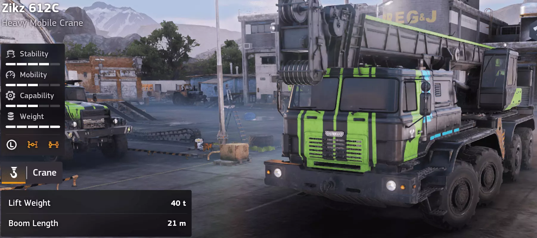 价格:52,000 评分:4/10 类型:起重机/轻型履带式 优点 - 履带底盘提供良好牵引力。 - 离地间隙高。 - 起重机操控响应灵敏。 - 非常适合小型、精确的吊装作业。 - 紧凑尺寸便于进入狭窄区域。 缺点 - 起重机仅能从左侧操作。 - 转向范围非常有限。 - 无锚定装置,接近起重极限时存在倾翻风险。 - 吊臂长度极短(8米)。 - 不适合吊装重于轻型设备的物品。 单人实用性:4/10 在单人游戏中,ETV-89最多只能算 niche 设备。它适用于轻型吊装和狭窄空间,但缺乏锚定装置且起重机活动范围有限,使得进行任何重要作业时既危险又令人沮丧。多人游戏实用性:4/10 在多人游戏中,它可以作为小型作业的支援起重机,但很快就会被更重型的起重机取代。团队通常更喜欢带有锚点和适当旋转功能的设备。 游戏玩法注意事项 始终将左侧朝向负载。 保持起吊重量远低于10吨限制。 避免在不平坦的地形上使用,容易倾翻。 最适合在高度受控的环境中使用。 评价 Vostok ETV-89是一款专用紧凑型起重机,仅在有限范围内适用。它反应灵敏且操作精准,但其设计限制使其无法成为可靠的通用起重机。适用于小型作业,其他情况下使用则有风险。 Zikz 612C重型移动起重机 Zikz 612C重型移动起重机
