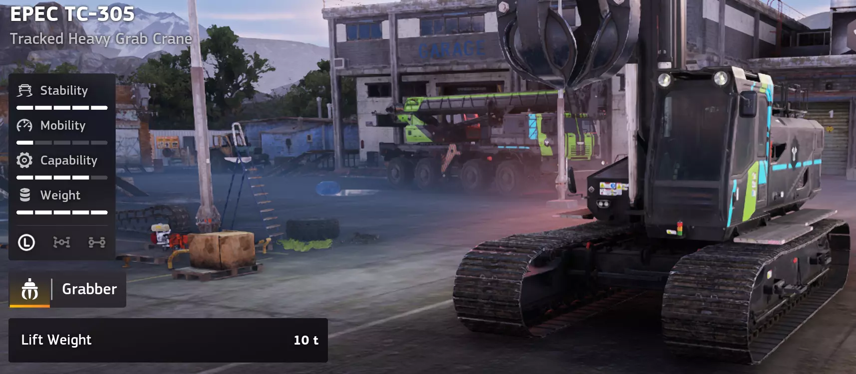 价格:53,000 评分:3/10 类型:起重机/履带式重型 优点 履带底盘提供稳固的牵引力。 360度全回转,定位灵活。 若操作得当,比许多轮式起重机更不易倾翻。 能在轮式起重机难以作业的松软地面上运行。 缺点 抓爪使用困难且不可靠。 与吊钩式起重机相比,抓力较差。 无锚定装置,限制了安全吊装范围。 就其尺寸和成本而言,起重能力较低。 一旦倾翻或陷入困境,极难救援。 很快会被更好的起重机选项所超越。 单人实用性:3/10 在单人游戏中,TC-305(抓爪式)令人沮丧且效率低下。抓爪机制带来了不必要的复杂性,而缺乏锚定装置意味着你一直在与稳定性作斗争,而非专注于工作。多人游戏实用性:4/10 在多人游戏中,如果队友协助管理位置和回收,它的价值会略有提升,但相比功能更强大的吊钩式起重机,它仍然很少被选用。 游戏玩法注意事项 避免搬运沉重或形状不规则的货物,抓爪难以应对。 保持吊装高度低且靠近底盘。 仅在非常平坦的地形上使用效果最佳。 在操作前制定回收计划至关重要。 评价 EPEC TC-305(抓爪式)是起重机设计中的一个失误。虽然履带式稳定性有所帮助,但不可靠的抓爪和缺乏锚点使其弊大于利。除非别无选择,否则请避免使用。 EPEC TC-305 履带式重型起重机 2.0(吊钩式) EPEC TC-305 履带式重型起重机 2.0(吊钩式)