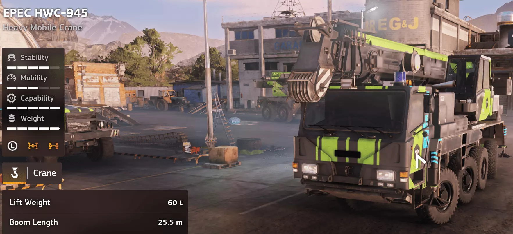 价格:58,000 评分:9/10 类型:起重机/履带式重型 优点 相比抓爪型号有巨大改进。 35吨的起重能力可进行重要的救援和建筑工作。 18.5米长的吊臂提供出色的作业范围。 吊钩式起重机比任何抓斗/抓爪系统都可靠得多。 履带式底盘在松软地面上提供强大牵引力。 能够执行极具冲击力的救援操作。 缺点 重新定位速度非常慢。 没有锚定装置,稳定性完全取决于位置摆放。 在全伸状态下吊装重物仍可能倾翻。 一旦翻车,救援难度大。 单人实用性:9/10 在单人游戏中,TC-305 2.0是一款极其高效的重型起重机。它对精准定位有回报,对操作马虎有惩罚,但其强大的起重能力使其成为目前最强大的救援工具之一。多人游戏实用性:9/10 在多人游戏中,这款起重机成为了问题解决者。团队可以用它来回收被困车辆、重新放置重型设备,以及执行轻型起重机根本无法完成的创造性解决方案。 游戏玩法注意事项 始终尽可能将重物保持在底座附近。 避免侧坡,有履带并不意味着不会倾翻。 在开始吊装前规划好退路。 部署后将其视为半固定式起重机。 评价 EPEC TC-305重型起重机2.0版本达到了原版应有的水平。它强大、可靠且能力极强,但如果操作不当仍有危险。是游戏中最出色的履带式起重机之一。 EPEC HWC-945重型移动起重机 EPEC HWC-945重型移动起重机