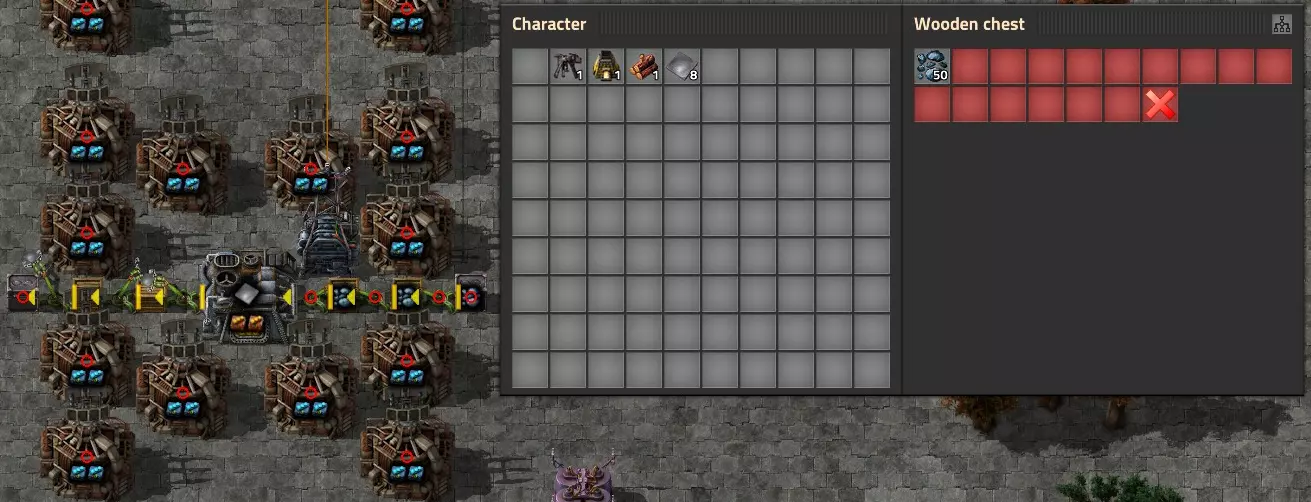 按住【Shift】键可复制任意实体的内容,并粘贴到同类实体上。例如:将一个请求箱的内容复制到另一个请求箱,装配机复制到装配机, combinator复制到 combinator,火车复制到火车,火车站复制到火车站,或其他任何同类实体。