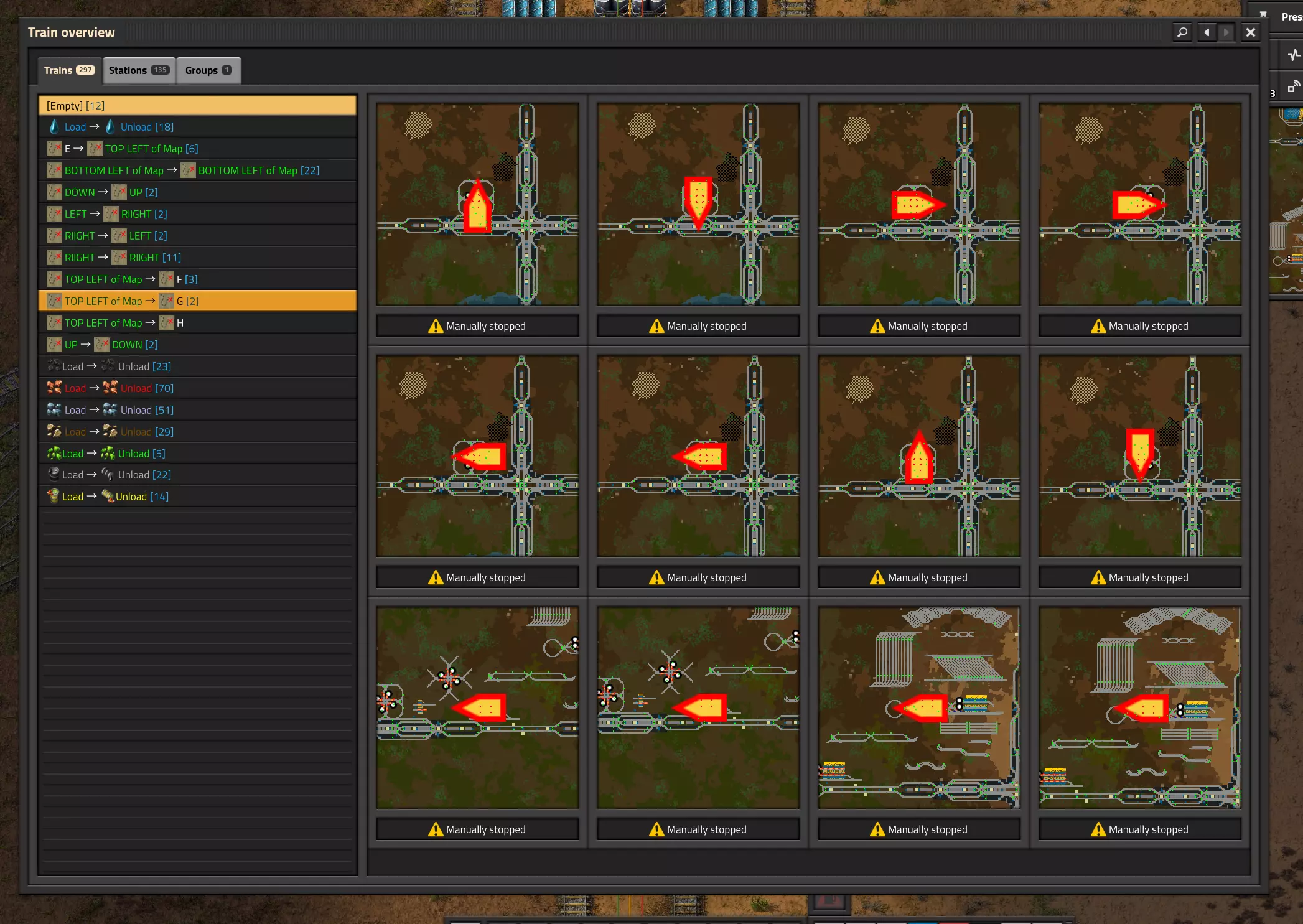 显示你的火车将要前往某地的路径。按住“Ctrl”键并在地图上“右键点击”,可让选中的火车沿高亮路线行驶。如果你在火车内打开地图,你所在的火车会被自动选中,你可以前往任何轨道。在物流请求菜单中,选中某个物品后,按住“Shift”键。
