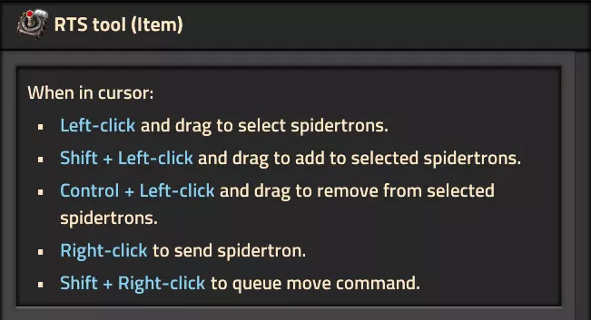 按住【蜘蛛tron遥控器】并点击一个实体,蜘蛛tron会跟随任何被点击的实体。按住【Ctrl】键