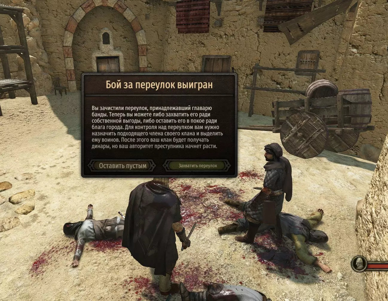 如果队伍中有10-16名士兵,就可以在村庄和城市中接取小型任务,其中部分任务可以“和平”解决——打造武器、提供工具/铸铁/锻铁,或通过高魅力值进行协商;占领城市中的死胡同/后院/小巷并获取犯罪收入。占领发生在【城市漫步】模式中:(与同伴一起)找到匪徒的藏身处,与任意匪徒搭话引发对话,消灭整个团伙(3-9名匪徒)。