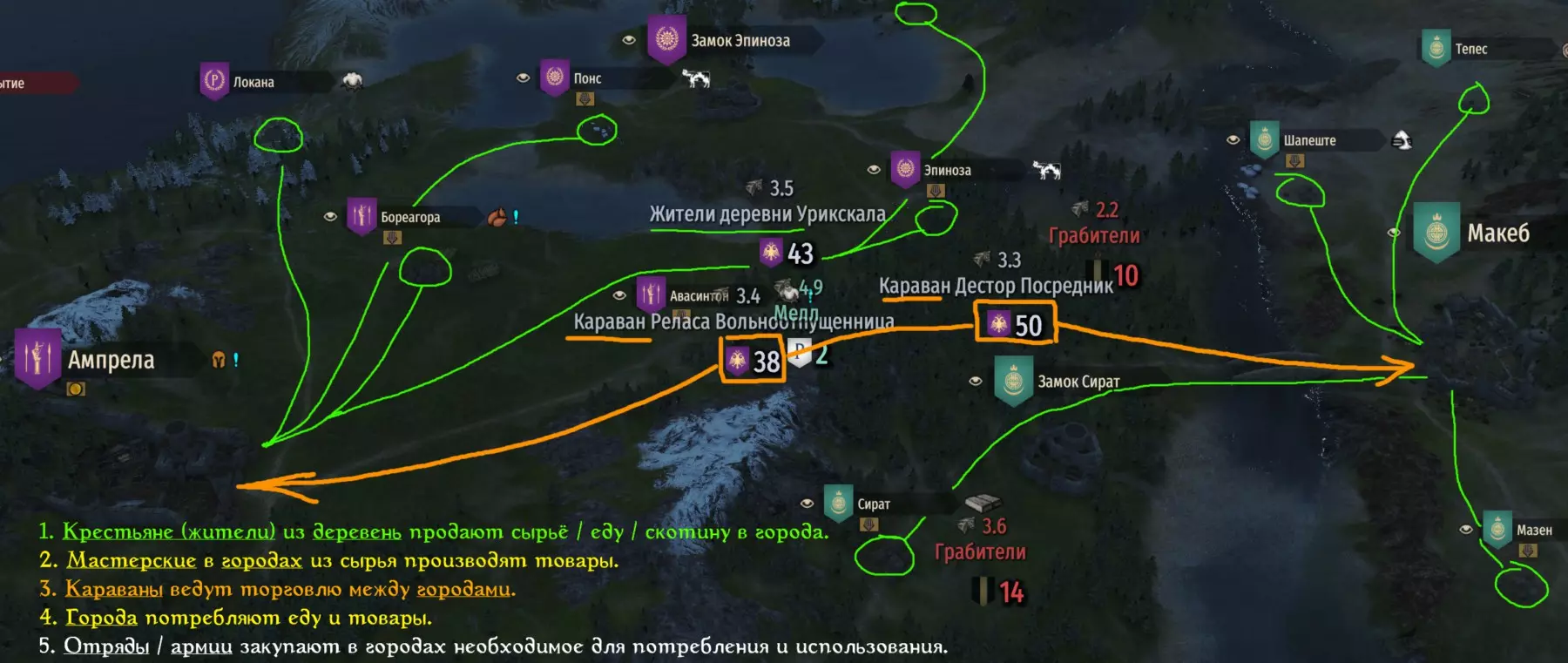 Крестьяне (жители) из деревень продают сырьё / еду / скотину в города. Мастерские в городах из сырья производят товары. Караваны ведут торговлю между городами. Города потребляют еду и товары. Отряды / армии закупают в городах необходимое для потребления и использования.Отряд игрока может торговать/обмениваться со всеми перечисленными участниками, снаряжать караваны, покупать/продавать мастерские. Производство в деревнях:Деревня с ресурсомПроизводит (что появляется на её экране торговли, что крестьяне относят на продажу в города)КороваМасло, Сыр, Зерно, КороваОвцыШерсть, Зерно, Овцы, Масло, СырСвиньяСвинья, Зерно, Масло, СырБаттанская лошадкаЗерно, Масло, Сыр, Вьючная лошадь, Мул, Рабочая лошадь, Ездовая лошадь, Охотничья лошадь, Баттанская лошадка, Строевая лошадь, Глинторский пони, Суэнрийский пониРевильская скаковая лошадьЗерно, Масло, Сыр, Вьючная лошадь, Мул, Рабочая лошадь, Ездовая лошадь, Стургийская лошадь, Строевая лошадь, Ревильская скаковая лошадь, Оморский рысакВерховая лошадьЗерно, Масло, Сыр, Вьючная лошадь, Мул, Рабочая лошадь, Ездовая лошадь, Верховая лошадь, Охотничья лошадь, Строевая лошадь, Скакун из Валанбю, Рыцарский коньСтепной коньЗерно, Масло, Сыр, Вьючная лошадь, Мул, Степеной конь, Степной охотник, Карахан, АсалигатКантерионская строевая лошадьЗерно, Масло, Сыр, Вьючная лошадь, Мул, Рабочая лошадь, Ездовая лошадь, Верховая лошадь внутренних земель, Охотничья лошадь, Строевая лошадь, Кантерионская строевая лошадь, ПалматиецНахазавиЗерно, Масло, Сыр, Вьючная лошадь, Мул, Вьючный верблюд, Нахазави, Верблюд, Даршийский конь, Боевой верблюд, АскаратРыбаРыба, Зерно, Масло, СырФиникиФиники, Зерно, Масло, СырСольСоль, Зерно, Масло, СырЗерноЗерно, Овцы, Свинья, Корова, Масло, СырВиноградВиноград, Зерно, Масло, СырОливкиОливки, Зерно, Масло, СырЛёнЛен, Зерно, Масло, СырШёлк-сырецШелк-сырец, Зерно, Масло, СырТвёрдая древесинаТвердая древесина, Зерно, Масло, СырМехМех, Зерно, Масло, СырГлинаГлина, Зерно, Масло, СырЖелезная рудаЖелезная руда, Зерно, Масло, СырСеребряная рудаЗерно, Серебряная руда, Масло, СырМоржовый клык (DLC War Sails)Рыба, Моржовый клык, Зерно, Сыр, МаслоКитовый жир (DLC War Sails)Рыба, Китовый жир, Зерно, Масло Производство — личные действия игрока В БАЗОВОЙ игре (без DLC War sails). Исходный объектДействияРезультатЛюбая лошадьМанипуляции в инвентаре отряда (клацнуть на строку, в выдвинувшемся меню клацнуть иконку мясницкого ножа) 3x Мясо КороваМанипуляции в инвентаре отряда (клацнуть на строку, в выдвинувшемся меню клацнуть иконку мясницкого ножа) 6x Мясо 2x Шкура ОвцаМанипуляции в инвентаре отряда (клацнуть на строку, в выдвинувшемся меню клацнуть иконку мясницкого ножа) 2x Мясо 1x Шкура СвиньяМанипуляции в инвентаре отряда (клацнуть на строку, в выдвинувшемся меню клацнуть иконку мясницкого ножа) 1x Мясо 1x Шкура Твердая древесинаРабота в городской кузне — переработка Уголь Уголь Металлы (Чугун, Кованое железо, Железо, Сталь, Качественная сталь, Тамасская сталь) Работа в городской кузне — переработка Металлы (Чугун, Кованое железо, Железо, Сталь, Качественная сталь, Тамасская сталь). Уголь Оружие ближнего боя ИЛИ Метательное оружие Работа в городской кузне — плавка Твердая древесина, металлы (Чугун, Кованое железо, Железо, Сталь, Качественная сталь, Тамасская сталь). Сколько и чего получите — зависит от оружия и его качес
