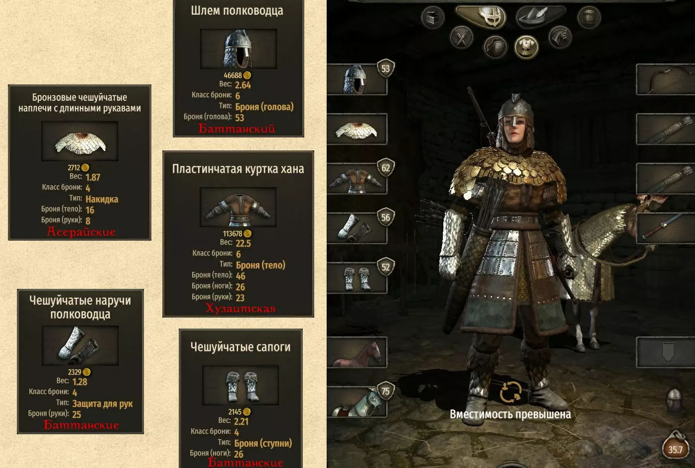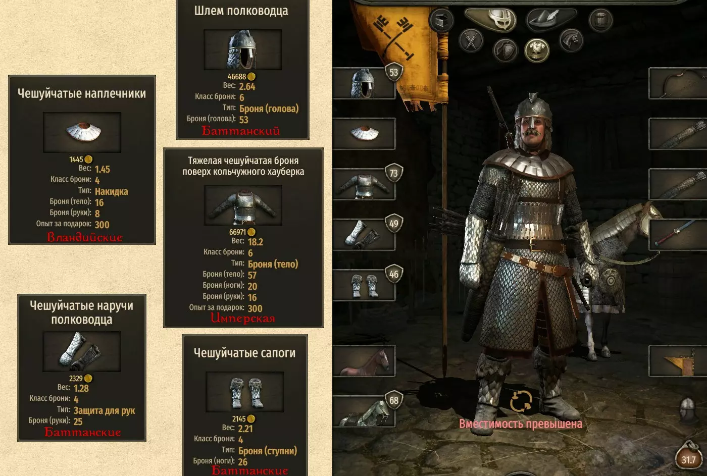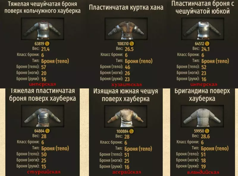 以下内容仅为我的个人选择和观点。 我个人在超过3000小时的游戏时长中,总结出了以下基础品质装备组合(不包含传奇/精良/豪华等带有加成效果的品质前缀,这种情况下,基础属性并非顶级但品质较高的装备可能比基础属性顶级的装备更强): 1. 53点护甲的巴坦族指挥官头盔(出现在巴坦族城镇,极为稀有)。 2.鳞甲肩甲(瓦兰迪亚民族城镇,半数以上城镇稳定出售) 或 青铜鳞甲长手套肩甲(阿塞莱民族城镇,稳定出售); 3.重型鳞甲覆盖在链甲罩衫之上(帝国民族城市出品,稀有)或可汗板甲外套(胡扎伊特民族城市出品,稀有,价格高得离谱~477k,重量比前者重4)。或许你会觉得可汗外套差很多,但仔细想想,它对经常被步兵攻击的骑兵来说非常好用,因为步兵的攻击往往不是打向躯干(可汗外套的躯干防护不如链甲罩衫),而是打向四肢(可汗外套的四肢防护)4. 指挥官鳞甲护腕(巴坦族城镇,稳定出售) 5. 指挥官鳞甲战靴(巴坦族城镇,稳定出售) (将套装大致分为“男性”和“女性”)