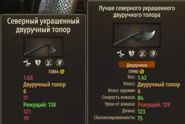 普通品质锻造双手斧与北方装饰双手斧对比: 挥砍速度:+7 挥砍伤害(切割):-9 攻击范围:+2 平衡性:+5