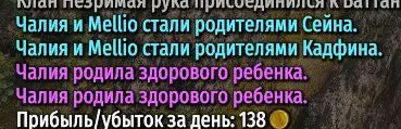 有时候我会把投掷技能练到225级。【大范围拾取】(可以不着急从地上捡物品!) 投掷技能可以通过使用投掷类武器轻松快速升级,比如使用攻城/防御火炮射击,或者用手投掷攻城/防御火炮的炮弹。 怀孕和妊娠。怀孕会在事件日志中以粉色消息“%s 怀孕了”进行通知,同时会为配偶在顶部弹出消息“您的配偶 %s 刚刚得知自己怀孕了”。 怀孕发生条件: - 夫妻之间 - 女性年龄在18岁及以上且小于45岁 - 18岁女性的基础每日怀孕概率为13%,45岁时为0% - 基础概率每年下降0.46% 即公式:基础概率 = 13 - (年龄 - 18) * 0.46 女性已有的子女数量会影响怀孕概率。考虑现有子女的受孕概率公式:基础概率 / ((子女数量+1)^2) 男性最大受孕年龄未知,但至少不小于60岁(我的角色60岁男性与32岁女性成功生育); 受孕发生时(涉及你的角色时,即你处于“休息”状态时),双方需在同一领地(城市或城堡)或同一强盗藏身处(等待攻击期间)。同时,配偶双方可以同时在城堡内,或同时在同一支部队中,或一方担任城市管理者而另一方在城堡内,或一方在部队中而另一方在城堡内/担任管理者。或者如果双方在同一支部队中行军(在陆地或海上),时间需在早上6点到中午12点之间。即大约在每日收支结算前的这段时间。影响怀孕概率的因素: 【魅力】技能中的【勇气】专长(25级)可提高成功怀孕的概率。目前尚不清楚配偶双方的专长是否会叠加,但为了保险起见,我通常会让双方都学习该专长。 (未经证实的信息)【魅力】技能的数值对怀孕概率有正向影响。(未经证实的信息)夫妻间的好感度会对怀孕概率产生积极影响。具体的影响系数我并不清楚。 网上有人说怀孕周期是63天,但我没有具体计算过。 比如,我的配偶在第四个孩子出生后的第三天就再次怀上了第五个孩子。这就是所谓的随机性。出生事件可能有以下结果: 母亲存活,孩子存活。 母亲存活,孩子死亡。 母亲死亡,孩子存活。 母亲死亡,孩子死亡。 可能会出现双胞胎,但在1000多小时的游戏中,我只遇到过两次这种情况。