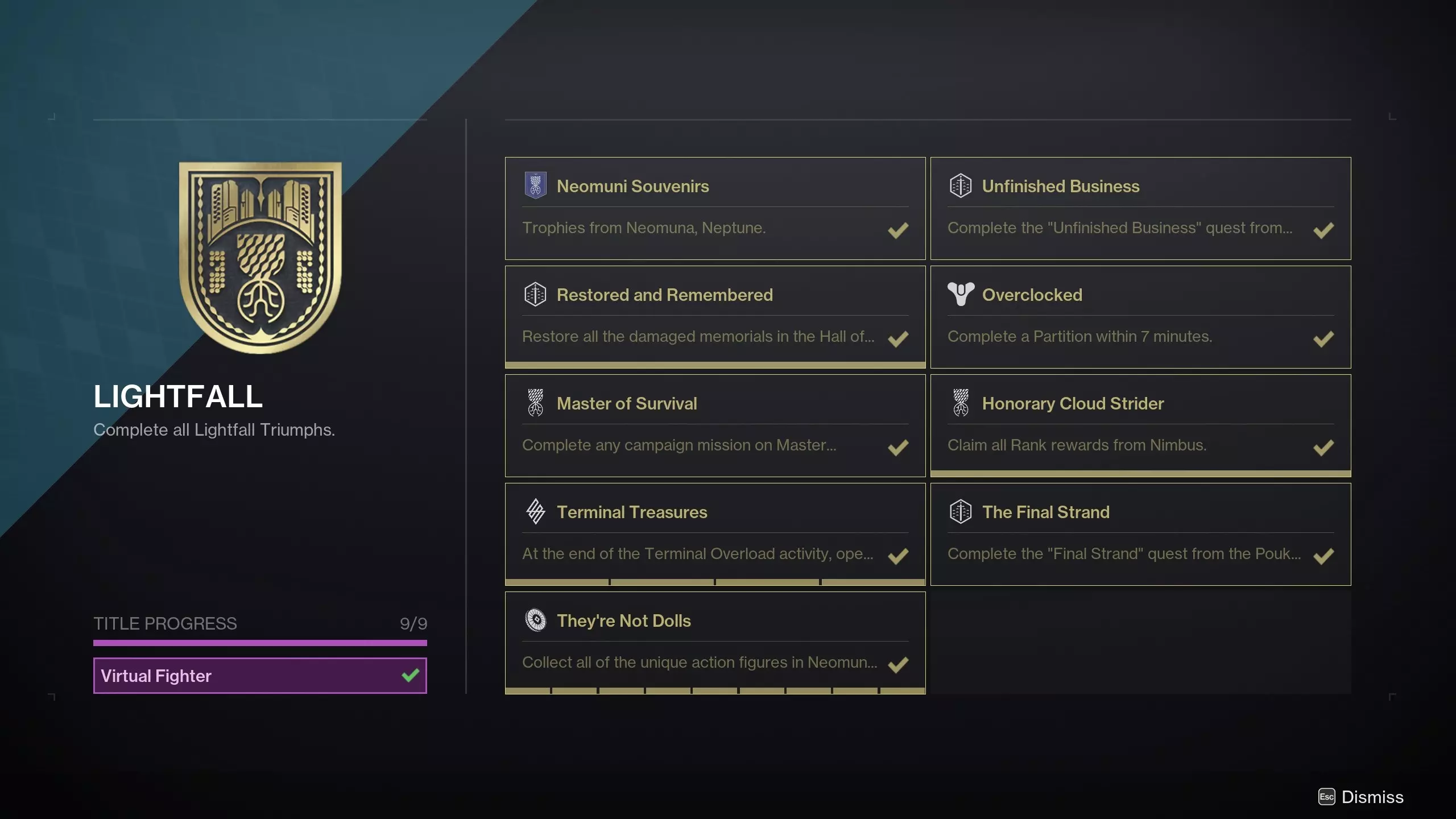 完成一个收藏徽章。 收藏徽章是来自特定地点或活动的一组物品。虽然可以用任意职业完成,但只需在一个角色上完成即可账号通用解锁。收藏徽章可在玩家的收藏菜单中找到。完成一个收藏徽章,即可解锁该成就。 此成就尚未修复。只有《命运2:遗落之族》及之前版本的徽章才计入。我是通过“梦城”徽章解锁的此成就。