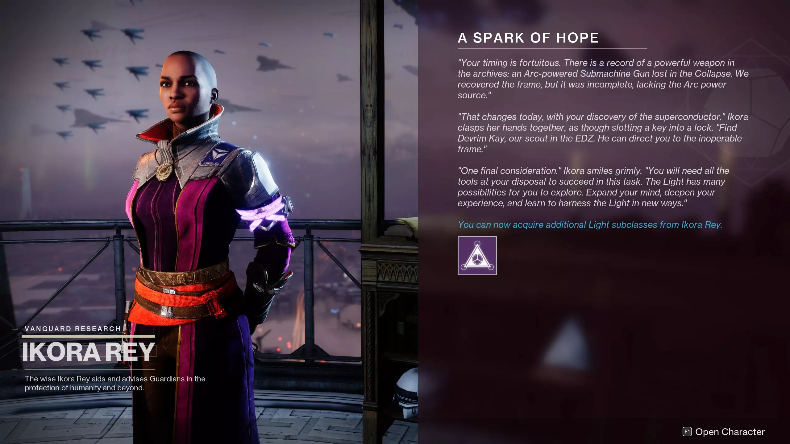 获得每个猎人分支职业。 使用新猎人游玩时,你需要完成首个故事任务【守护者的崛起】。完成后,你会获得另一个名为【希望的火花】的任务。此任务触发后,指挥官萨瓦拉会派你去找艾可拉·瑞,她会交给你两个不同的任务。每个任务都要求你用相应的元素伤害击败敌人,并生成3个超能球。完成这两个任务,解锁分支职业,至少装备每个分支职业一次,即可解锁该成就。 猎人初始职业为烈日,因此你会接到的任务是:【驾驭风暴】和【凝视深渊】。