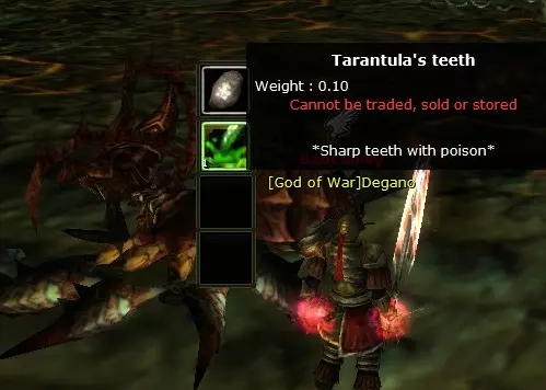 最重要的是!所有怪物(尤其是 Boss)都极具攻击性,请注意! 怪物 地牢中分布着少量怪物。 - 狼蛛 - 掉落狼蛛之牙。 - 狼蛛之牙可兑换 castellankey(用于进入暗黑龙房间),或者在狄洛斯的 NPC(负责将你传送进地牢的那个)处兑换 200000 金币(每颗牙齿)。