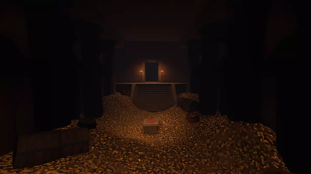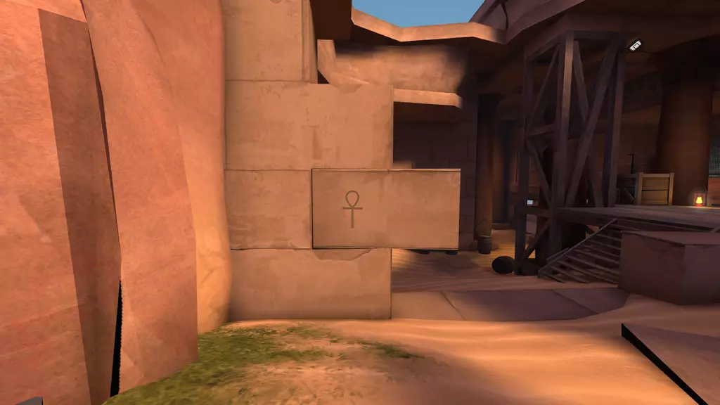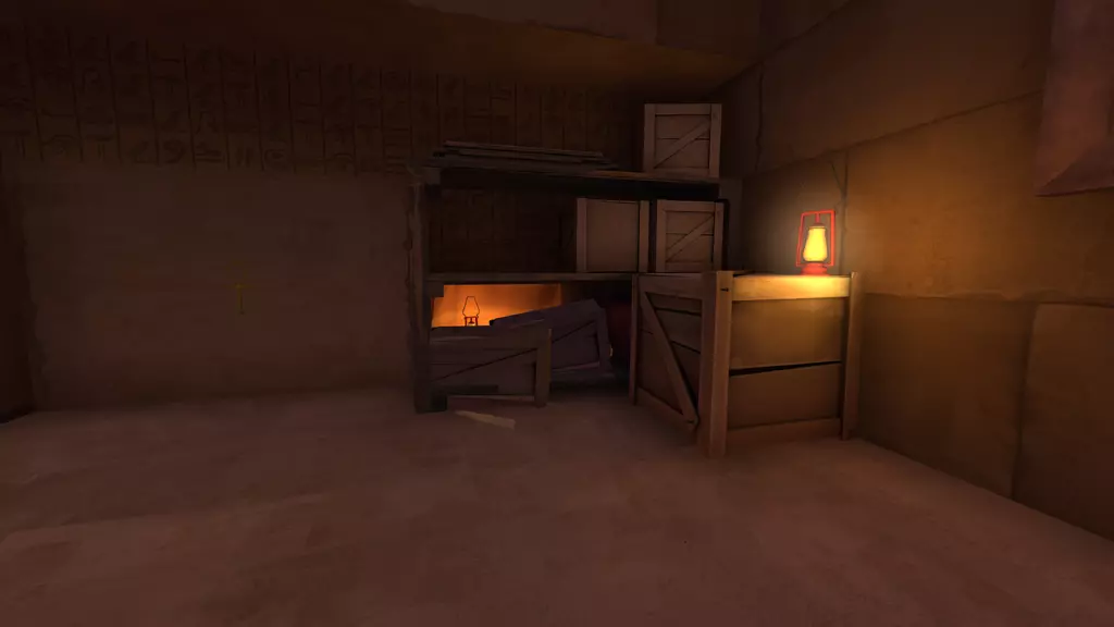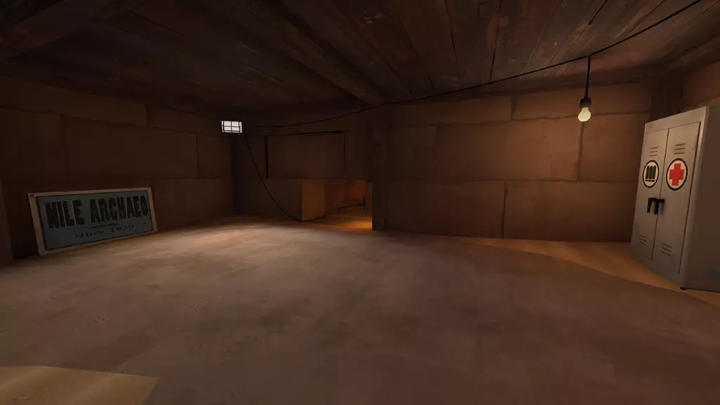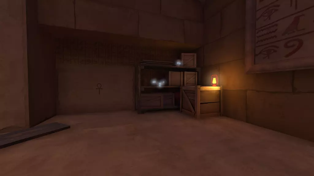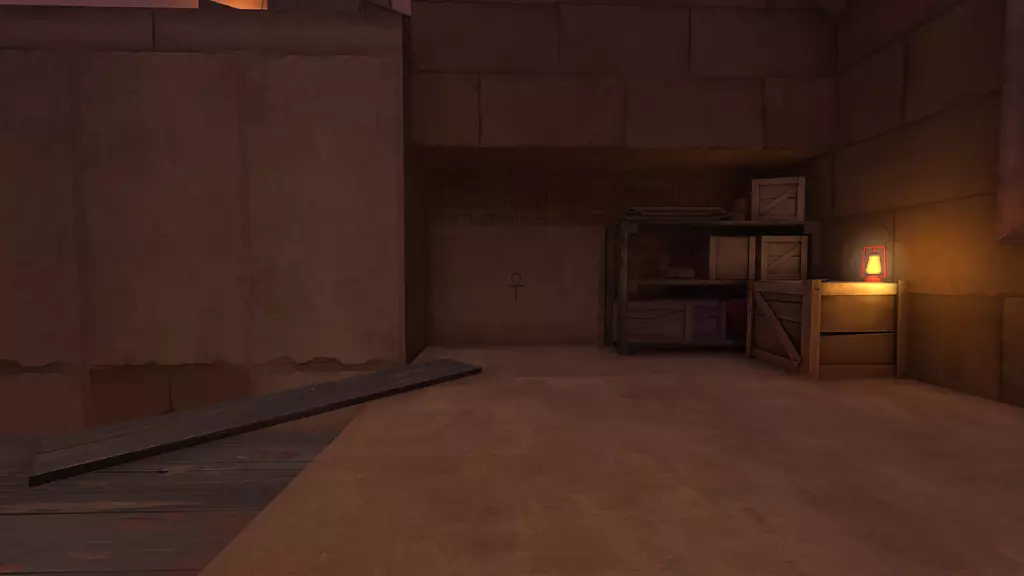站在宝藏室门前,门会缓缓降下,最终停下。里面的宝藏已被偷走,只剩下一个基座,周围是一堆堆毫无价值的黄金。仅留下一个孤零零的【安卡(ankhor)】。注意:离开宝藏室会将玩家传送回各自队伍的出生点,蓝队(BLU)前往前方出生点,红队(RED)前往后方出生点。 宝藏室 宝藏室门: