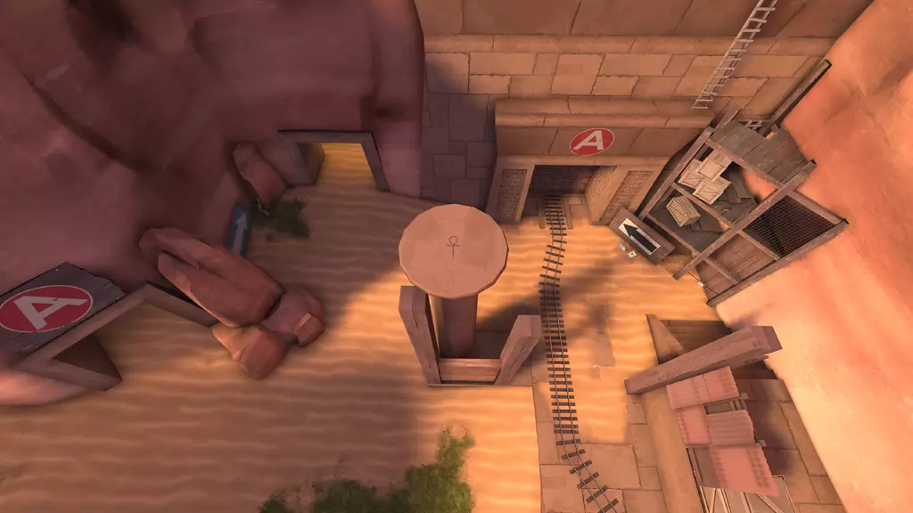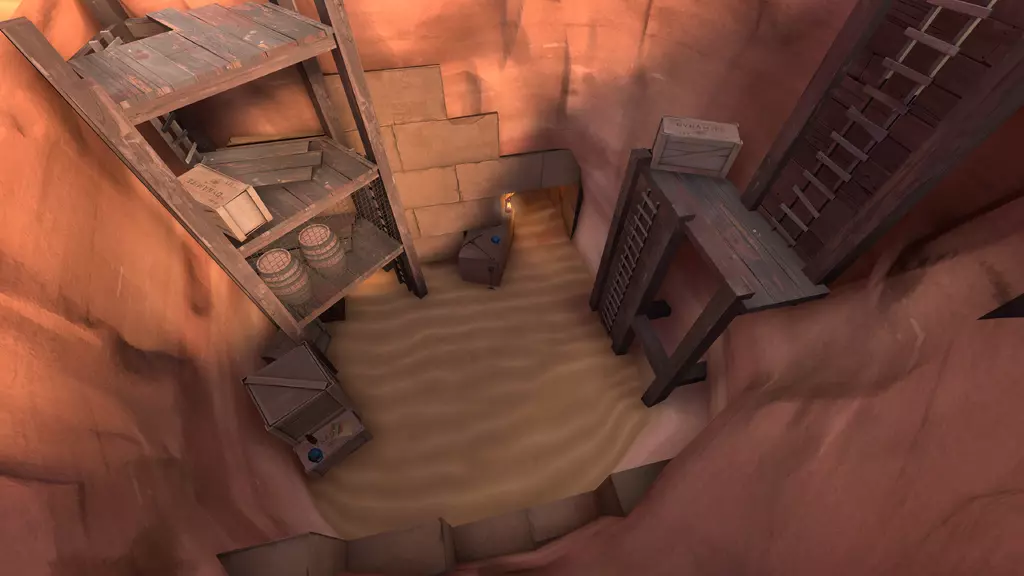 当第四个安卡旁的入口显现后,玩家无需再站在任何安卡旁边。在蓝队前方出生点内还有第二个入口,但只有蓝队可以进入。这个入口通向一个复杂的隧道系统,包含多个环路、单向掉落点、死亡坑和一个误导性的凹室。尽管结构复杂,但到达埋藏的宝藏的路线很简单。从主入口出发,在第一个岔路口选择右侧路径,下到有梯子的区域,然后向左进入坑中。你会坠入黑暗,之后从宝藏室入口出来。 主入口: