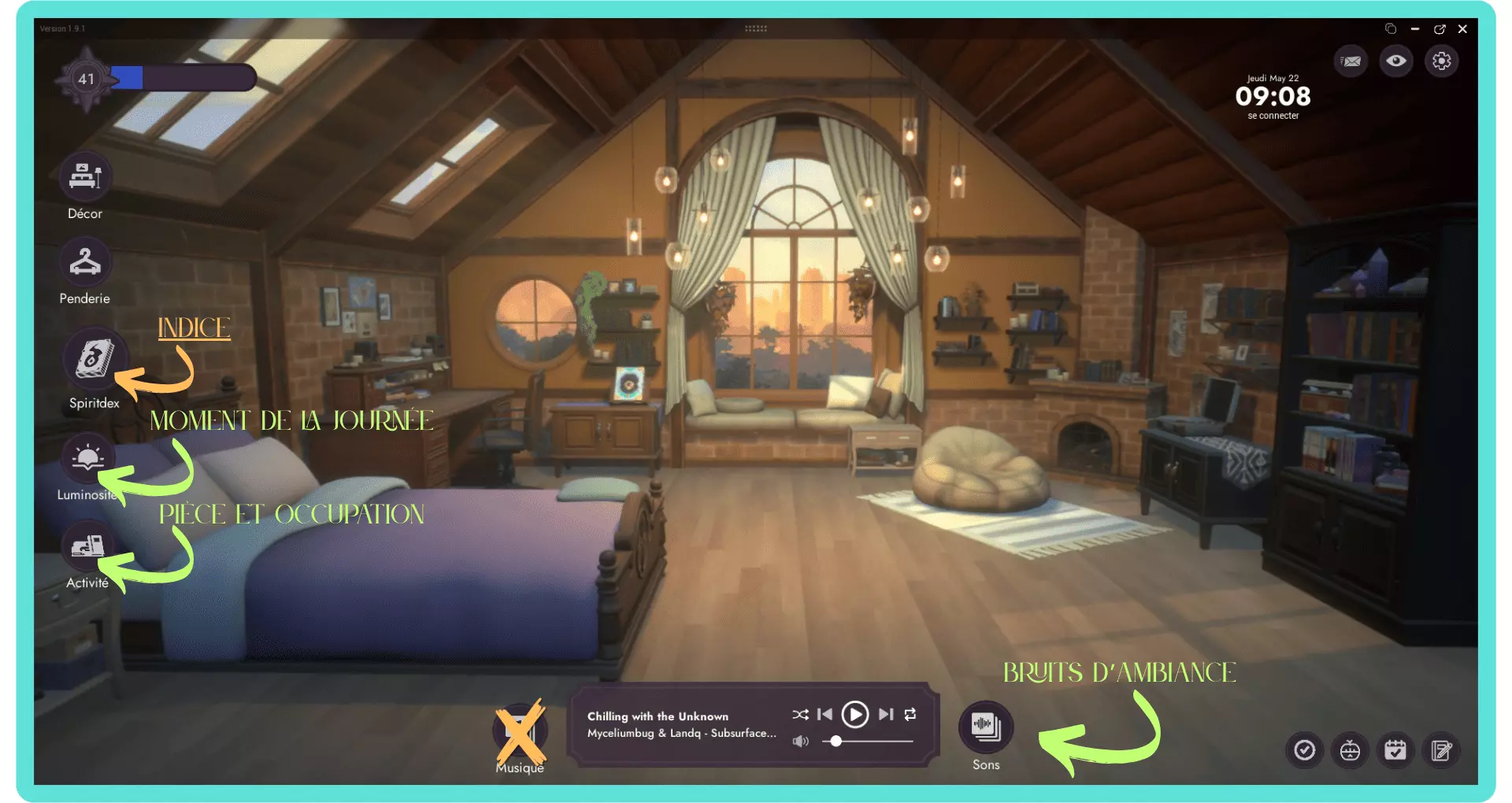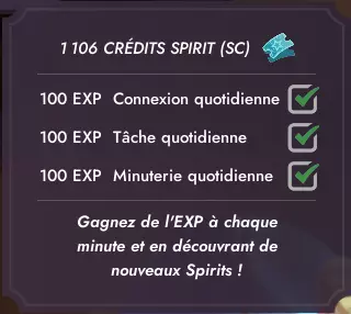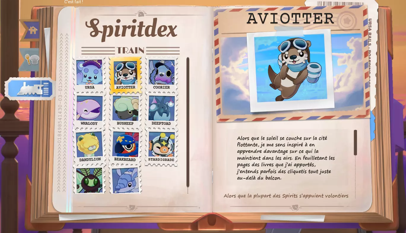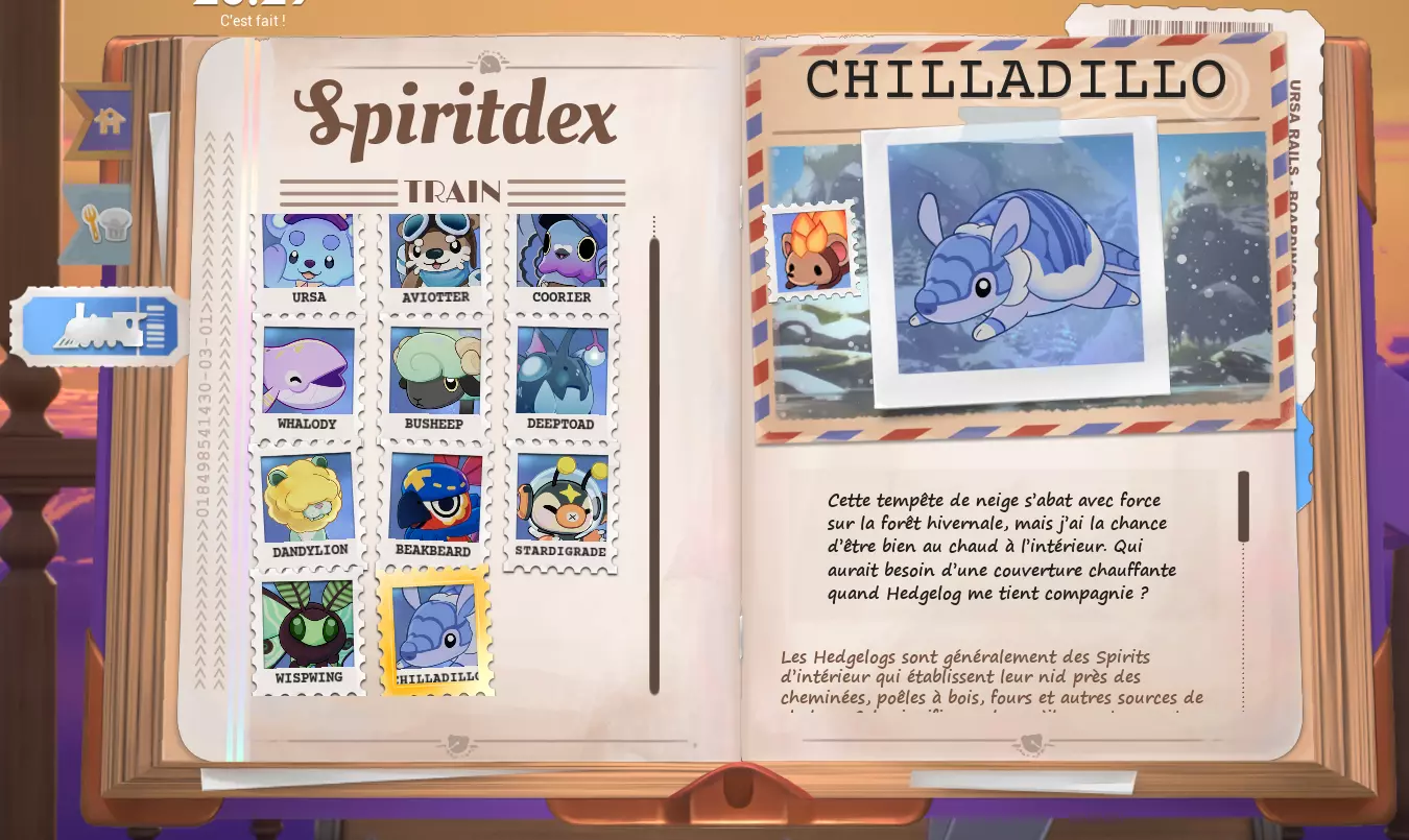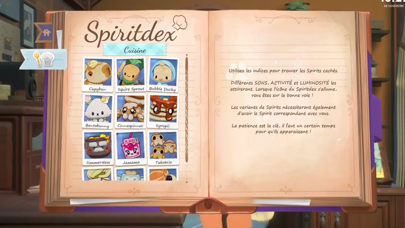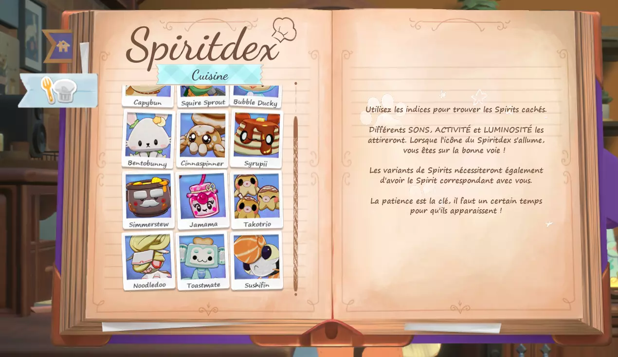 💡 Lorsque le Spiritdex affiche l'animation ci-dessus, cela signifie que vos paramètres sont corrects et qu'il ne vous reste plus qu'à attendre que l'esprit apparaisse. 👻 Plus vous avancerez dans le Spiritdex, plus les temps d'attentes sont longs. Il vous faudra prendre votre mal en patience. cliquer sur le Spiritdex lorsqu'il affiche un point rouge (important !) Pour les esprits de la cuisine douillette DLC : certains esprits du Spiritdex Cuisine nécessitent la présence d'un autre esprit très spécifique à proximité, sélectionnable grâce à la penderie. Leur indice ne se débloquera pas non plus tant que vous n'avez pas débloqué le Spirit accompagnant nécessaire dans le Spiritdex classique. Les indices dans le Spiritdex sont là pour vous aider à trouver les esprits cachés. Si les indices vous semblent cryptiques, ne vous inquiétez pas, toutes les solutions vous sont fournies plus bas. Pour voir les solutions, cliquez sur la case noire correspondante, comme celle-ci : BRAVO ! Vous êtes prêt ^^ 🦉 Amusez-vous bien à trouver vos esprits préférés! Lenny Votre plus fidèle compagnon Goopii Indice : Mon bureau me semble étrangement propre ces derniers temps, il me manque peut-être même quelques objets. Solution : Activité : Bureau Dust Bunny Indice : J'ai entendu des bruits étranges sous le lit durant la nuit. Je me demande ce que cela peut bien être. Solution : Luminosité : Nuit ; Activité : Lit ; Earlybirb Indice : Ces derniers matins, j'ai été réveillé par de curieux gazouillis. Solution : Luminosité : Matin ; Activité : Lit ; Sons : Chants d'oiseaux. Hedgelog Indice : Il fait très chaud dans ma chambre ces derniers temps. Je me demande s'il n'y a pas un problème avec le foyer ... ? Solution : Activité : Foyer ; Sons: Feu de foyer. Arachknit Indice : À mesure que la lumière m'amenuise, il me semble marcher sur des morceaux de laine éparpillés sur le sol. Solution 1 : Activité : Foyer Tricotter Solution 2 : Activité : Baie Vitrée Tricotter Chapterpillar Indice : Chaque fois que je lis, je sens une présence au-dessus de mon épaule. Solution 1 : Activité : Lit Lire Solution 2 : Activité : Baie Vitrée Lire Solution 3 : Activité : Cuisine Lire Moonpaw Indice : Les soirs de grand vent, on a presque l'impression que quelque chose hurle à la lune. Solution : Luminosité : Nuit ; Sons: Vent reposant. Drizzlefin Indice : J'ai entendu un vieux conte sur un Spirit aux yeux larmoyants. "Quand le ciel pleure et que les étoiles sortent pour joue, vous pouvez les trouver en train de nager au milieu des gouttes." Solution : Activité : Baie vitrée ; Luminosité : Nuit ; Sons: Douce pluit. Trashnuki Indice : Ce spirit glouton peut être attiré par les bruits provenant de la cuisine l'après-midi. Solution : Luminosité : Après-midi ; Sons: Savoureux grésillements. Kettlebrew Indice : Des rumeurs circulent au sujet d'un Spirit qui accueille l'arrivée du jour avec une tasse de thé fumante au coin du feu. Solution : Activité : Foyer, Siroter ; Luminosité : Matin. Sunquill Indice : Une chanson enchanteresse émane de la forêt alors que le soleil se couche. Solution : Luminosité : Soirée ; Sons : Forêt nocturne. Bulbee Indice : Lors d'orages, j'ai remarqué que les lumières clignotent de manière étrange. Solution : Sons : Grondement paisible Vootodoo Indice : Ce Spirit hante celles et ceux qui passent trop de temps à procrastiner au lit. Solution : Activité : Lit Naviguer Inkster Indice : J'ai entendu parler d'un Spirit qui peut m'aider à surmonter mon syndrome de la page blanche. Solution 1 : Activité : Foyer Ecrire Solution 2 : Activité : Bureau Ecrire Bobapole Indice : J'ai entendu parler d'un Spirit qui adore le boba tea, c'est un excellent remontant quand je n'ai plus d'énergie à force de travailler à l'ordinateur toute la journée. Solution : Luminosité : Soirée ; Activité : Clavarder (Cuisine/Baie vitrée/ Bureau/ Foyer) Waxolotl Indice : Quelle est cette odeur qui flotte dans la brise d'après-midi, presque comme une bougie allumée ? Solution : Luminosité : Après-midi ; Sons : Vent reposant Hamstereo Indice : Mon tourne-disques fait des siennes depuis quelques temps, sautant un temps dès que je me trouve à proximité. Solution : Activité : Foyer ; Sons : Vinyle apaisant. APE - Bit Indice : Un mystérieux glitch apparaît dans tous les jeux auquel je joue. Je ne trouve aucune information à ce sujet sur les forums en ligne ! Solution 1: Activité : Bureau Jouer Solution 2: Activité : Lit Jouer Solution 3: Activité : Foyer Jouer Flutterfrog Indice : Alors que je débute ma journée avec une méditation paisible, il m'arrive parfois de sentir une présence qui m'observait avec curiosité. Solution : Activité : Baie vitrée Méditation Luminosité : Matin Hexwing Indice : Pendant les nuits fraîches d'automne, on peut apercevoir quelque chose qui rôde dans le ciel — les sons d'autres créatures nocturnes annoncent son arrivée. Solution : Luminosité : Nuit ; Sons : Forêt nocturne. Twintail Indice : C'était difficile à distinguer, mais je jure que j'ai vu quelque chose à travers la tempête de neige. Solution : Sons : Douce neige. BloomScale Indice : Lorsque le soleil brille, chaque fois que je nettoie le sol près de la fenêtre, j'aperçois quelques instants plus tard des empreintes de pas couvertes de terre réapparaître. Solution : Luminosité : tout sauf la nuit ; Activité : Baie vitrée Nettoyer Catsudon Indice : Pendant ma séance d'étirements après le dîner, j'ai ressenti la présence d'un étrange Spirit. Solution : Luminosité : soirée ; Activité : Baie vitrée Étirements 🆕☕︎ Deermuff - Mise à jour d'hiver 2025 Indice : Ce Spirit adore jouer près du feu de foyer lorsque la neige tombe. Solution : Son: Feu de foyer + Douce neige ; Activité : Foyer Jouer (avec un Spirit, pas jouer sur la console) Crewmate - Collaboration Among Us Indice : Dans l'infini silencieux de l'espace, un je