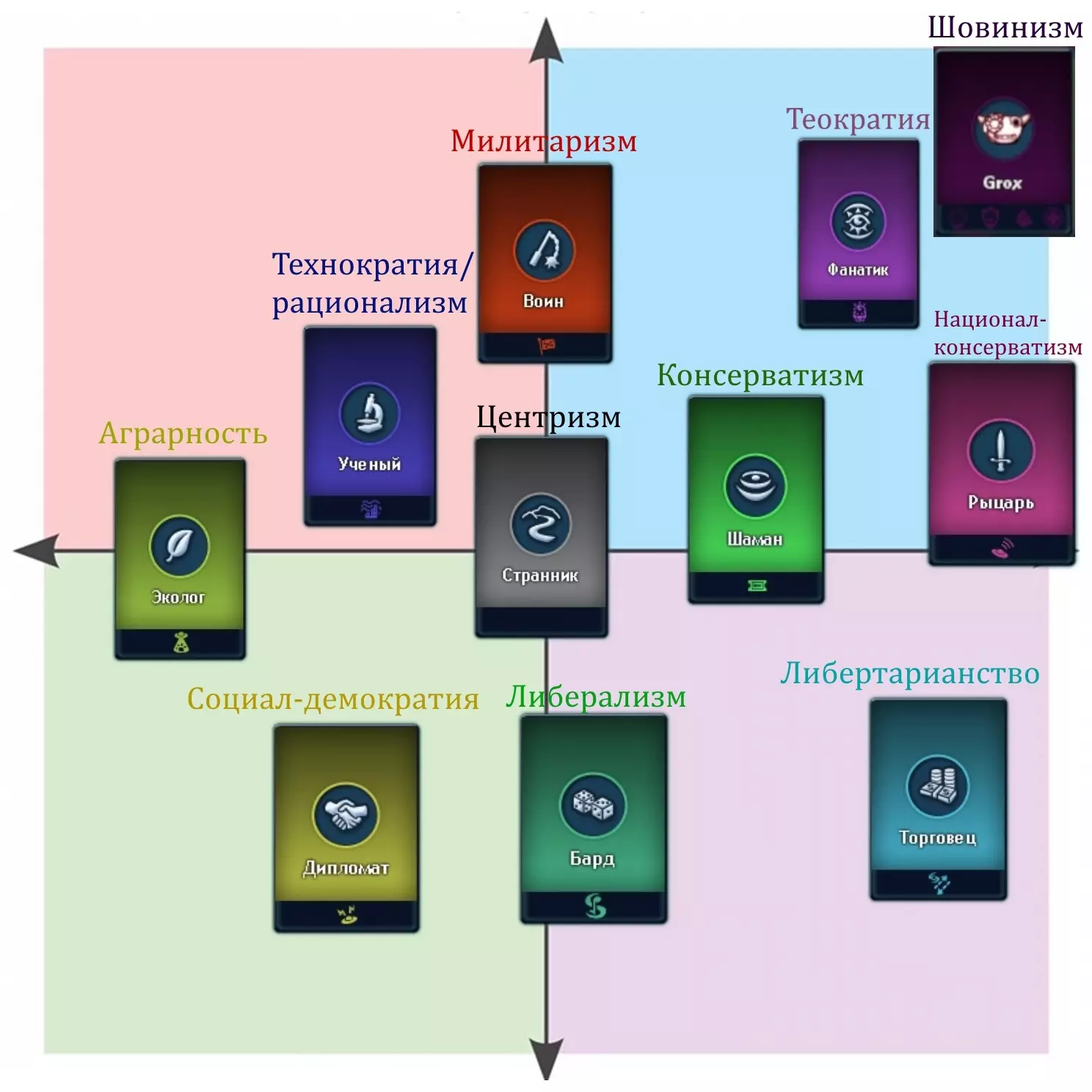 哲学理念 格罗克斯人身上明显体现出理想主义特质。 理想主义是唯物主义的对立面。理想主义认为生物的内心世界是首要的,而非物质。这一点在格罗克斯人的对话中也得到了充分展现。他们完全不在乎金钱。用他们的话说,斯波林格斯(原词:спорлинги)仅仅是为了在整个银河系扩张而存在。格罗克斯人自己则称其他国家为贪婪、自私、为虚无而战的存在。