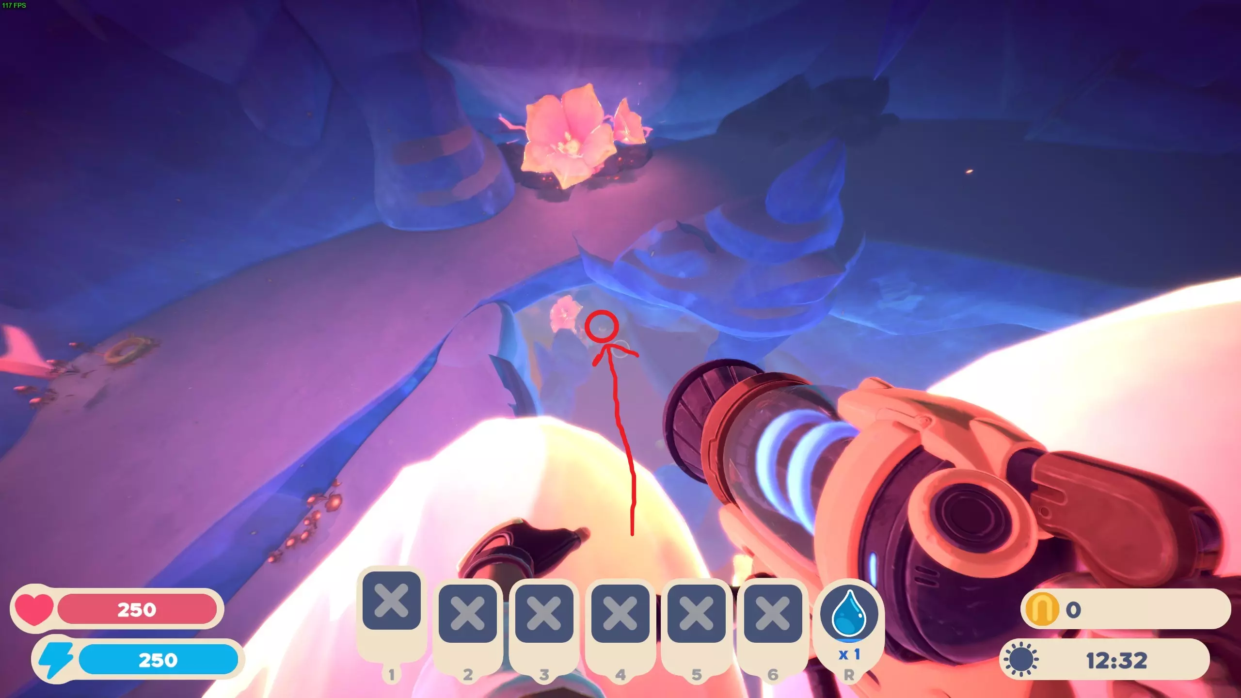 从第13个胶囊出发,一直往前走,就能到达有红色花朵的洞穴。