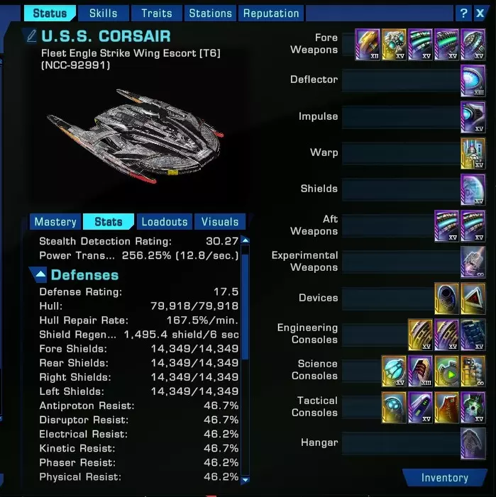 如果你处于太空(而非地面或星域空间),这个窗口会根据你当前的装备、能量等级以及增益效果,实时显示你飞船的各项数值。 这里我不想过多解释,因为我希望本指南保持简洁,优化你自己的装备应该是你自己的事情,这样你的飞船才会更符合你的操作习惯。这意味着我不会提供千篇一律的装备配置方案。 不过,如果你想知道的话……在那张特定的图片里,我实际上没有使用任何专门的护盾科学控制台。 本部分并不打算深入细节,但有几点提示:提供被动护盾能量加成的装备是个不错的起点,而且你还能找到本身就能阻挡额外伤害的护盾。这是我目前使用的盾牌作为示例。