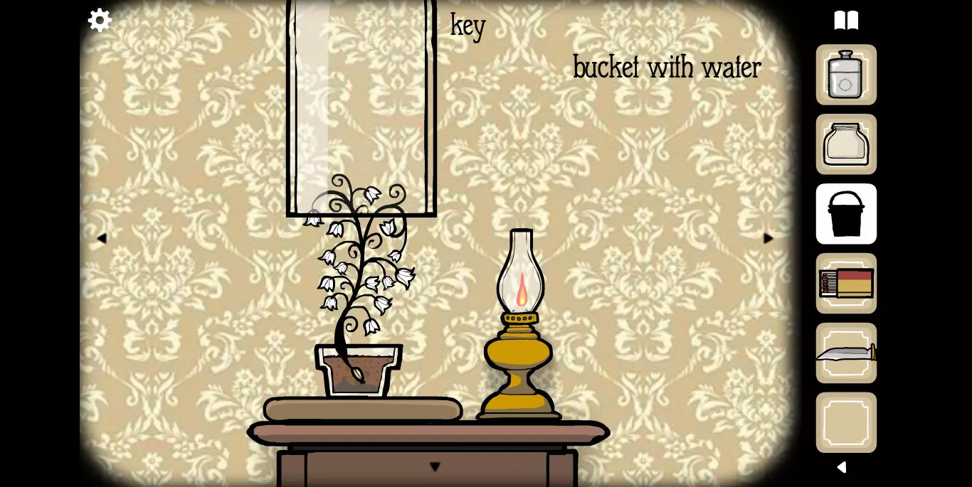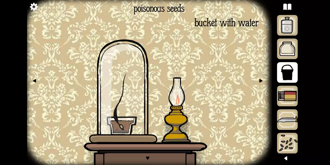 将种子放入花盆中,用火柴点燃油灯,再给泥土浇水。收集油灯旁边的钥匙。