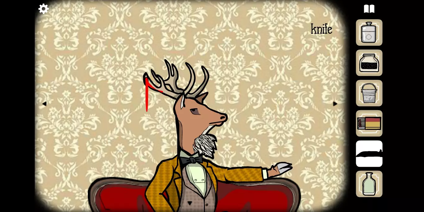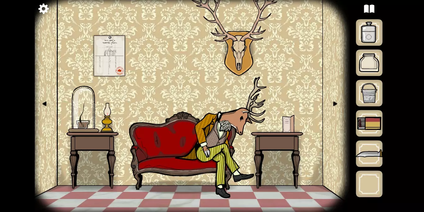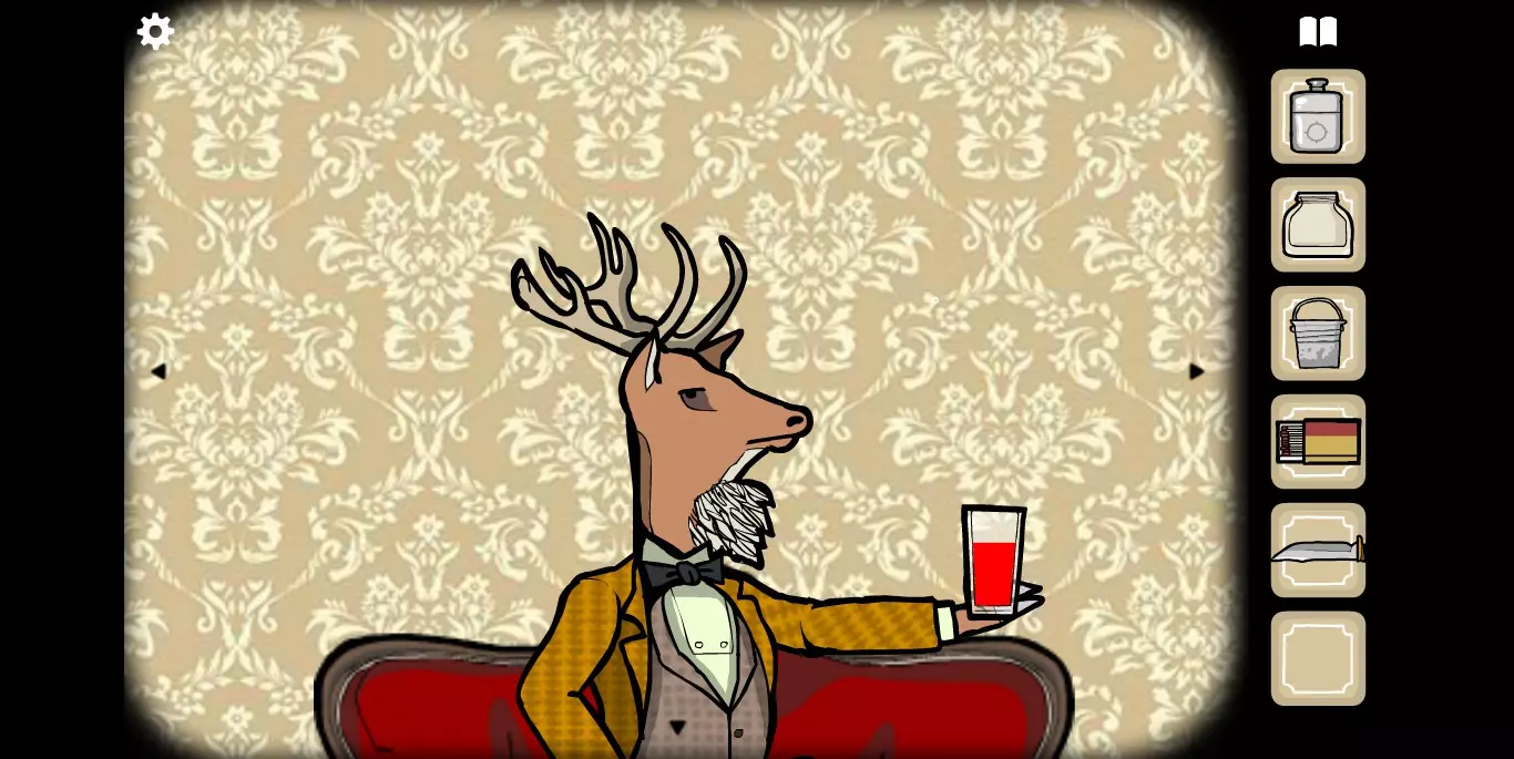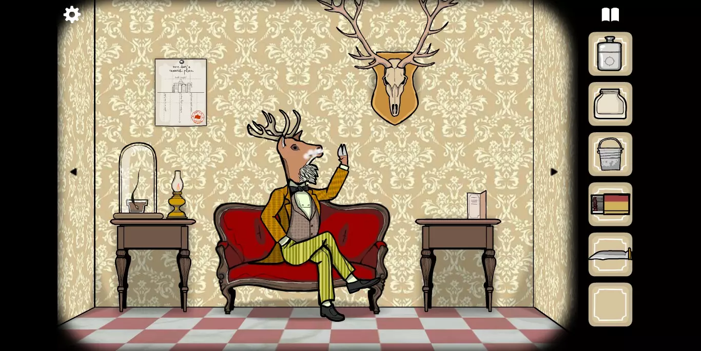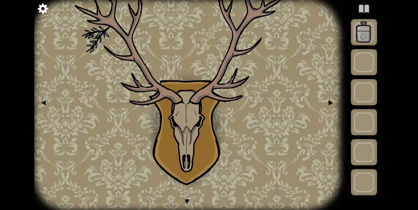 右手边的墙上可以看到一张纸,虽然字迹有些模糊,但相关提示的图标还是很清楚的。接下来,右手边的墙上有一只秃头鹿,点击之后它会长出犄角。