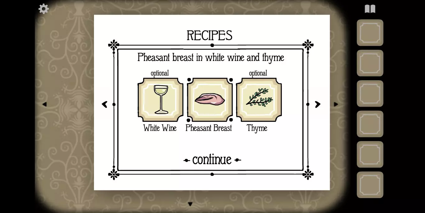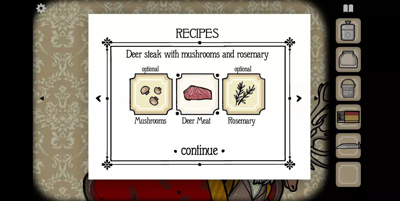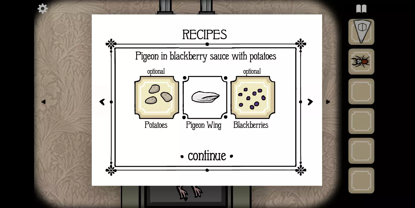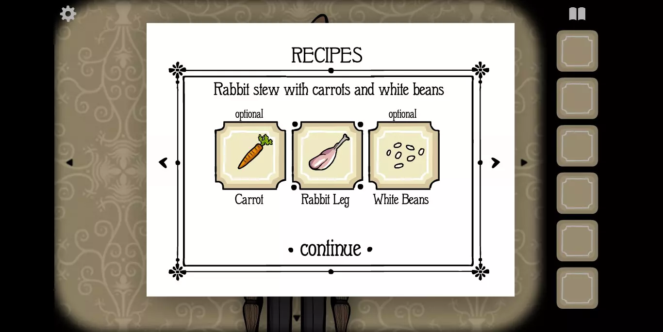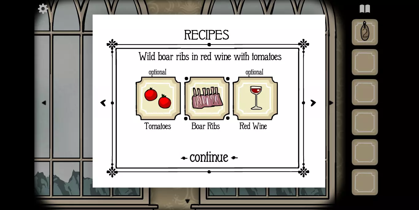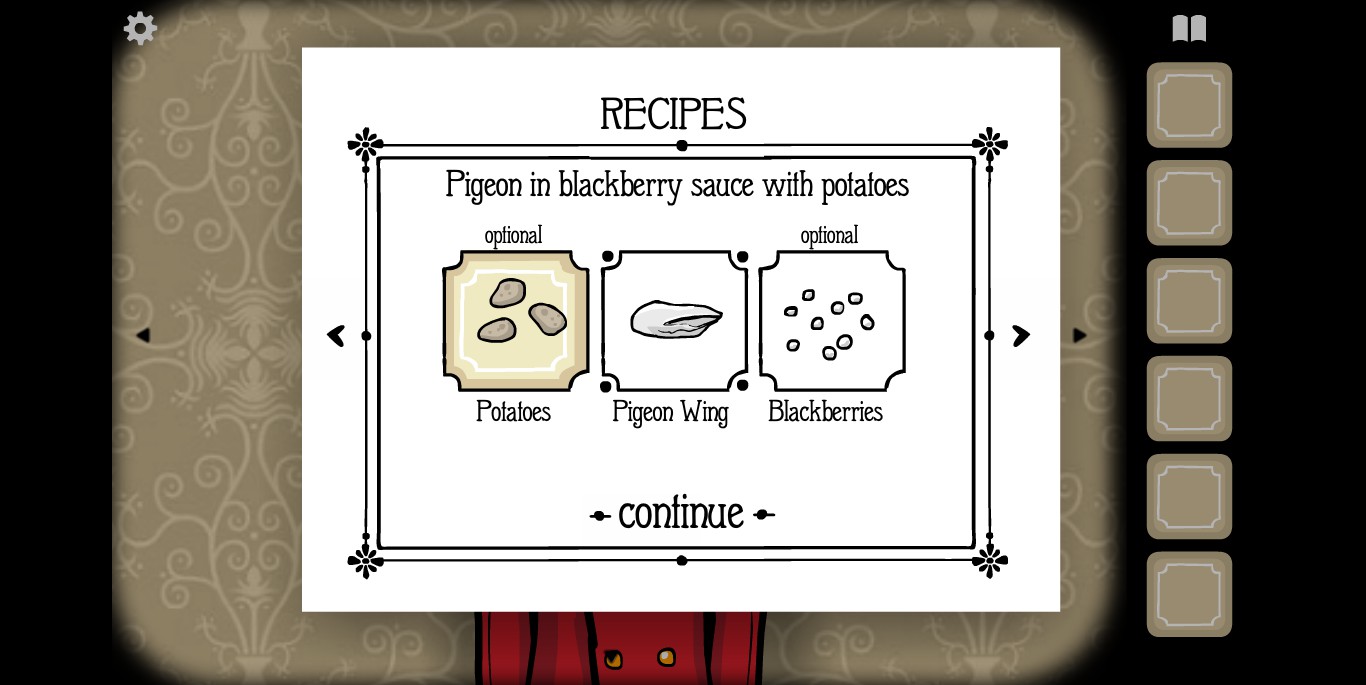 屏幕右上角的书本标记点开之后就是食谱。如前文提示中所说,肉类食材当然就是我们的客人,非肉类食材一种在大厅,一种在房间。房间1