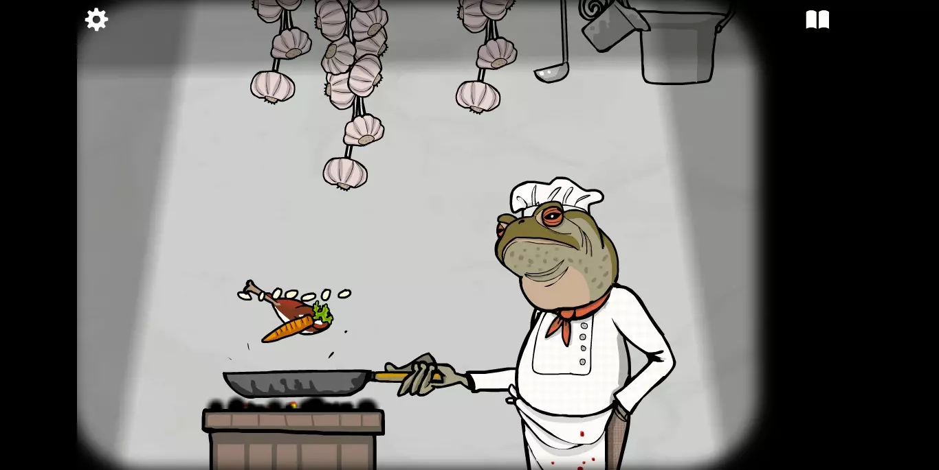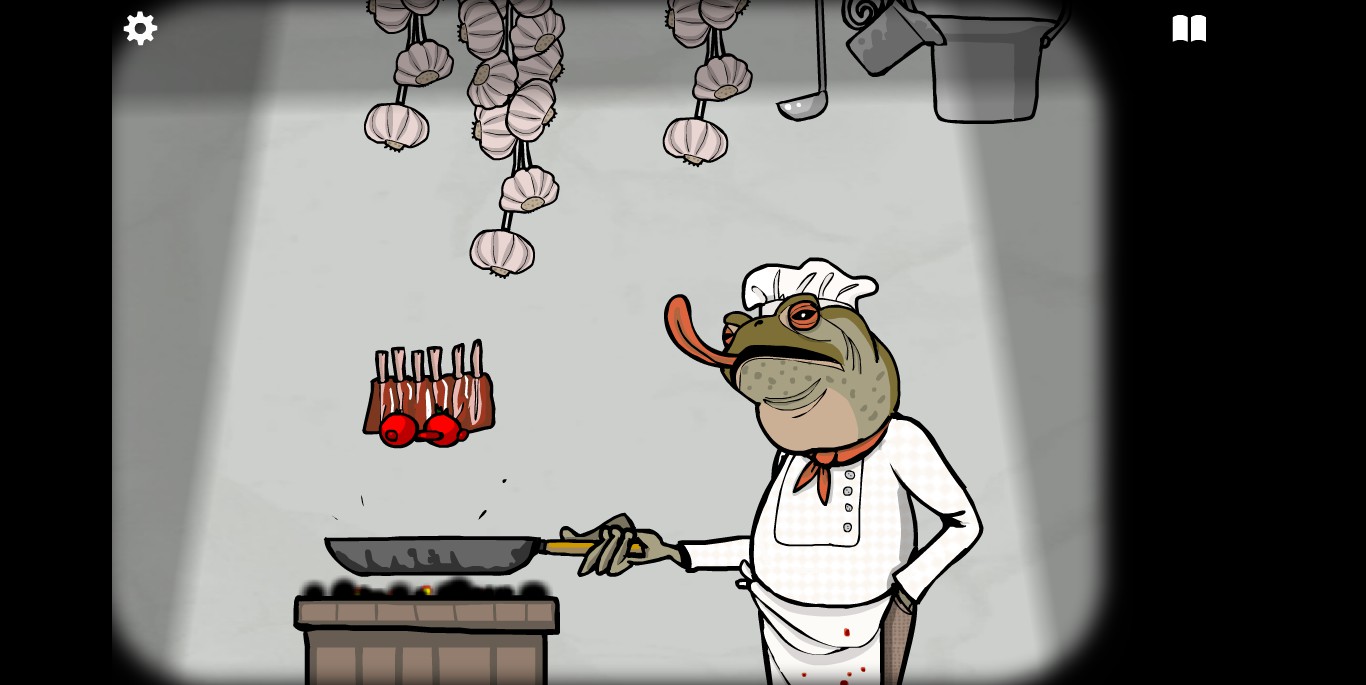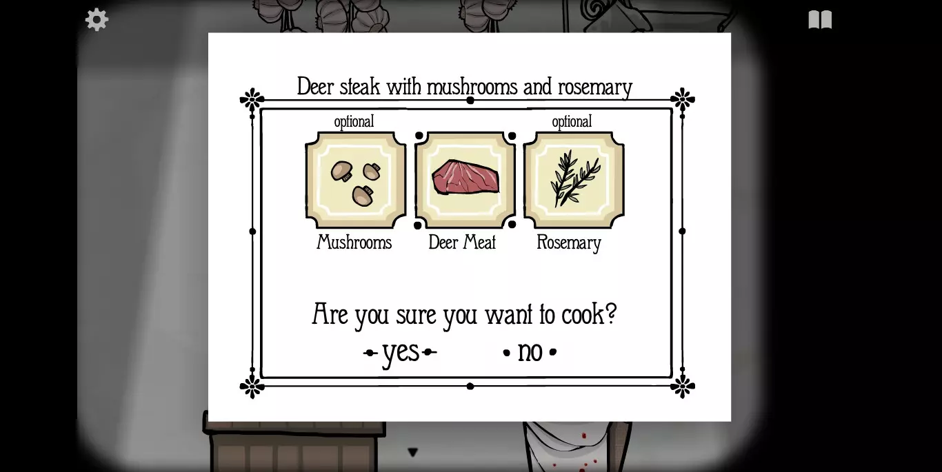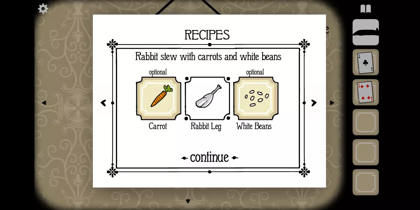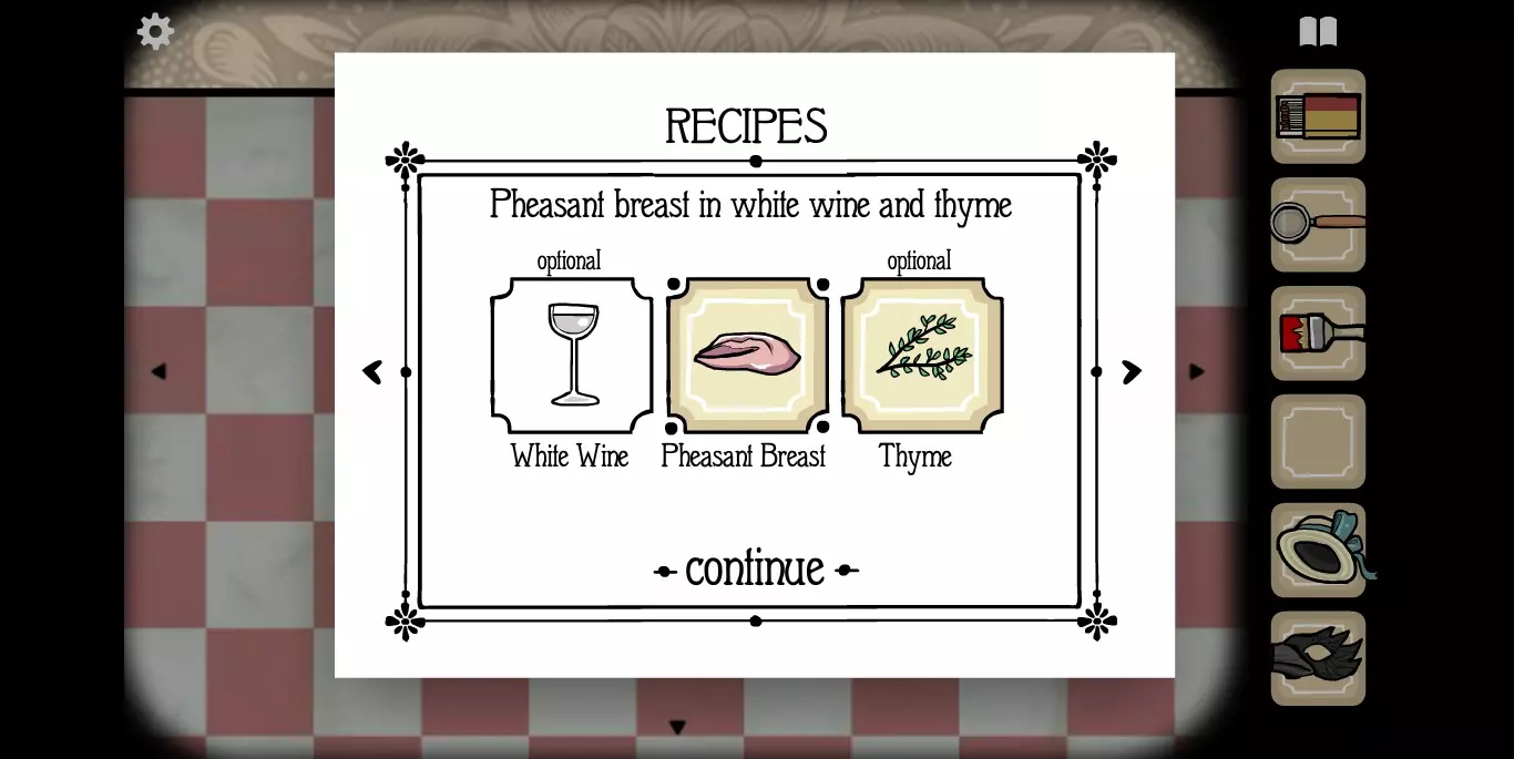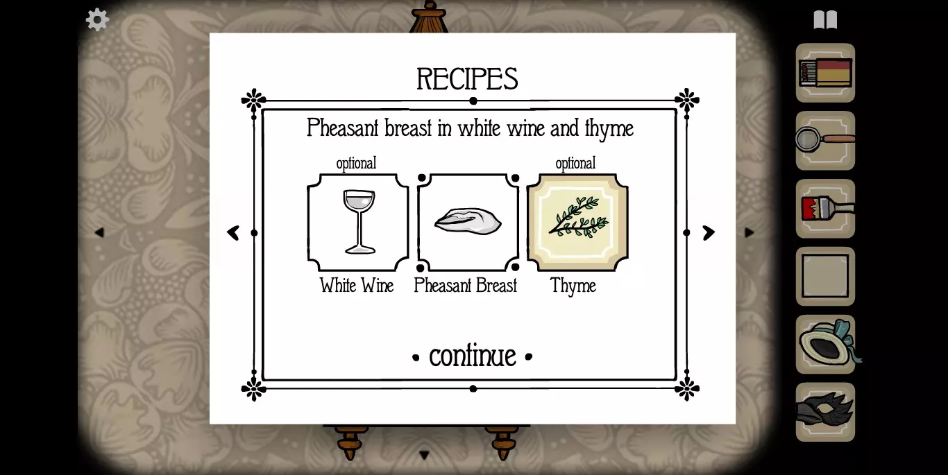 屏幕右上角的书本标记点开之后就是食谱。如前文提示中所说,肉类食材当然就是我们的客人,非肉类食材一种在大厅,一种在房间。房间1