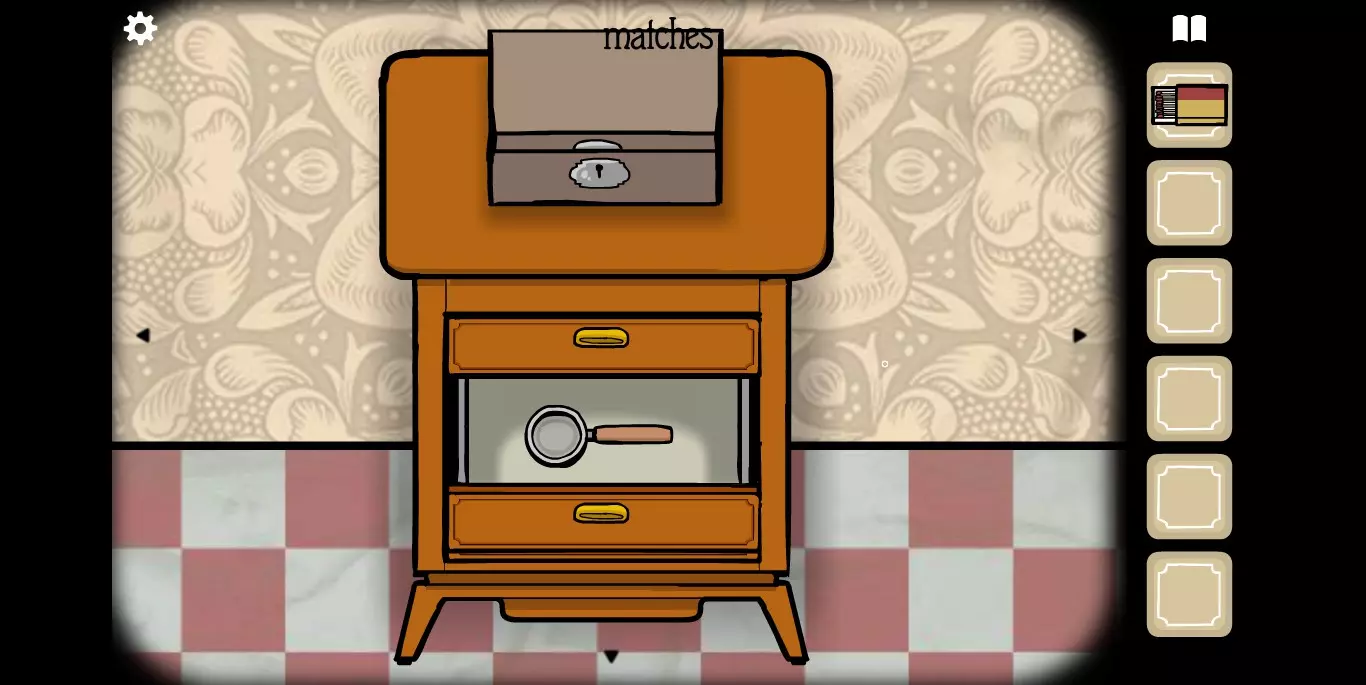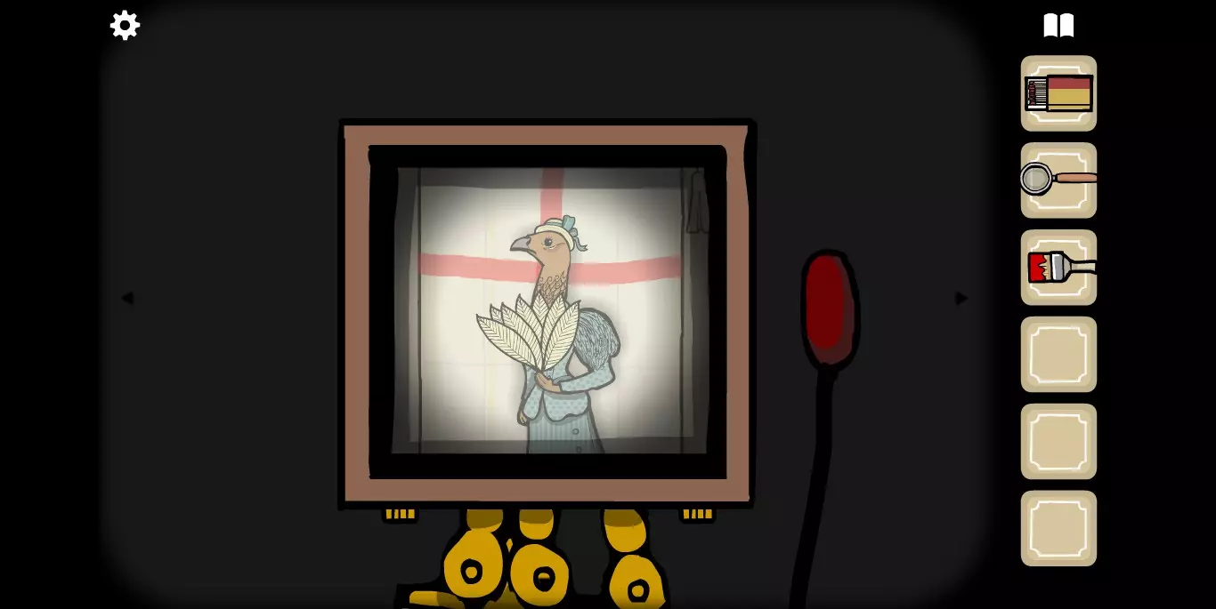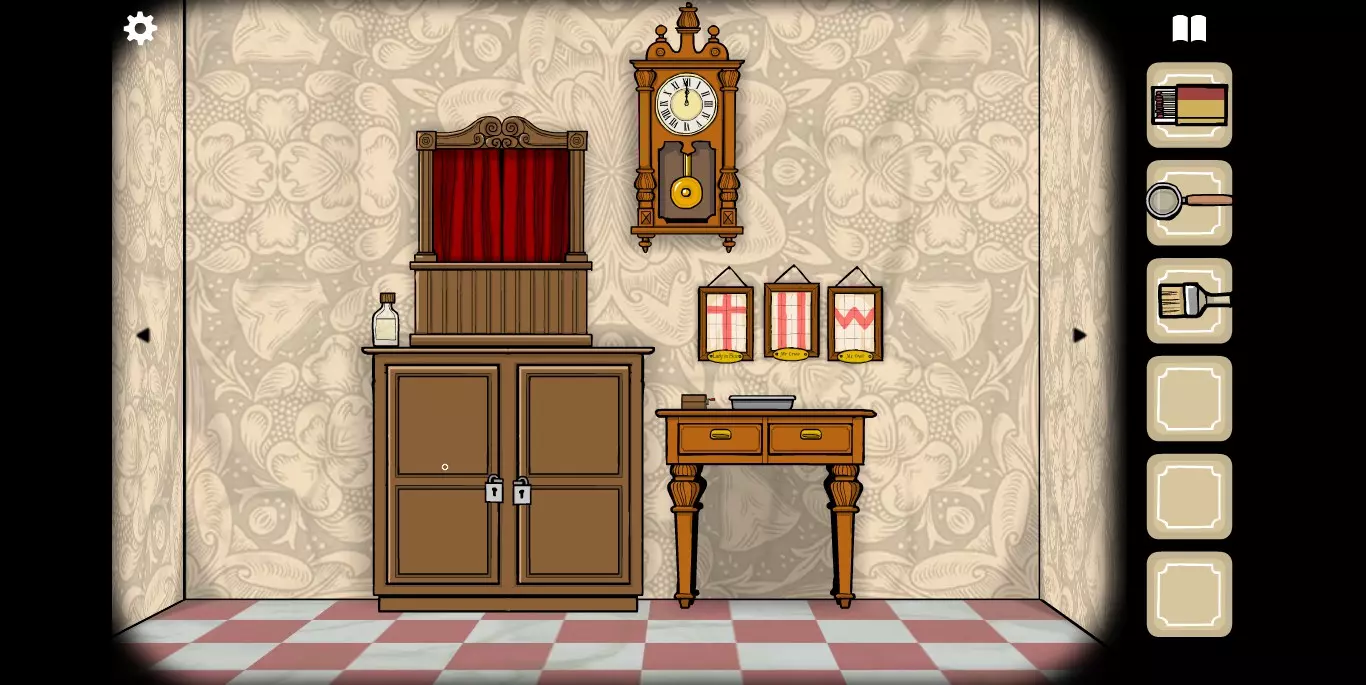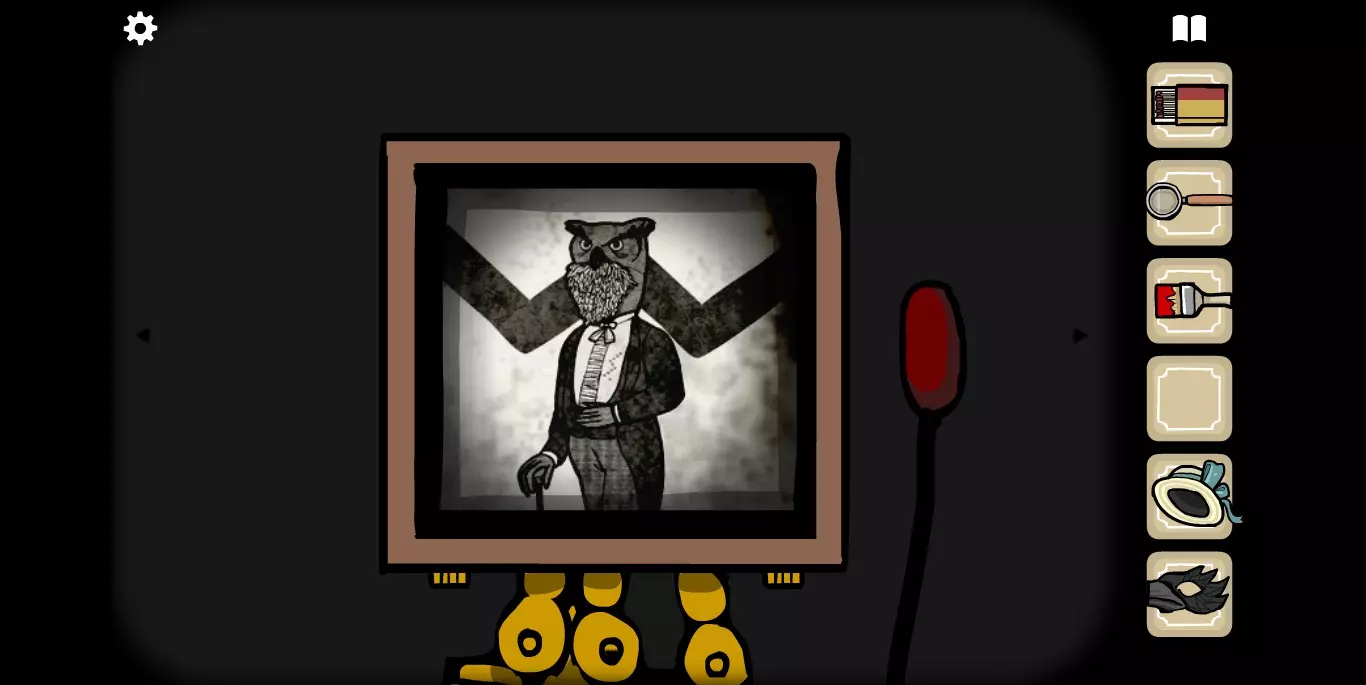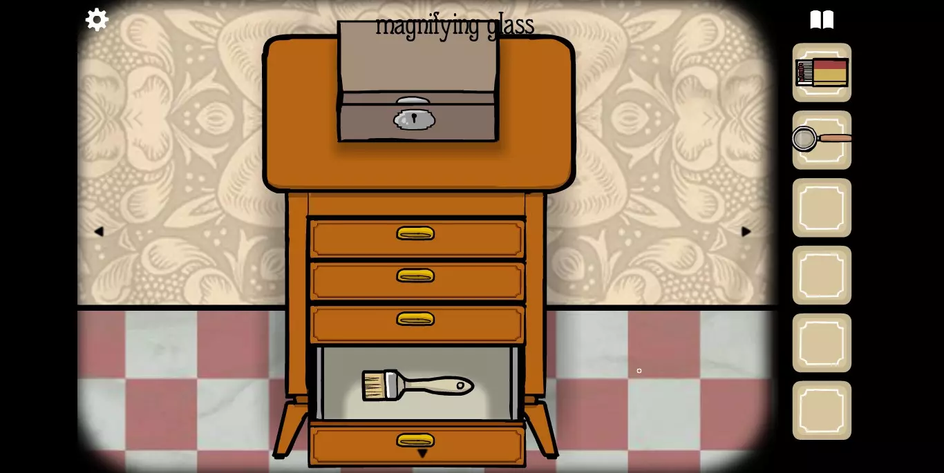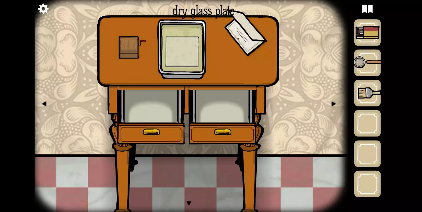 她请你帮忙拍照。环顾屋子后可以发现有三个空相框,应该是需要三张照片。在第二个场景的抽屉里可以分别找到火柴、放大镜和刷子。