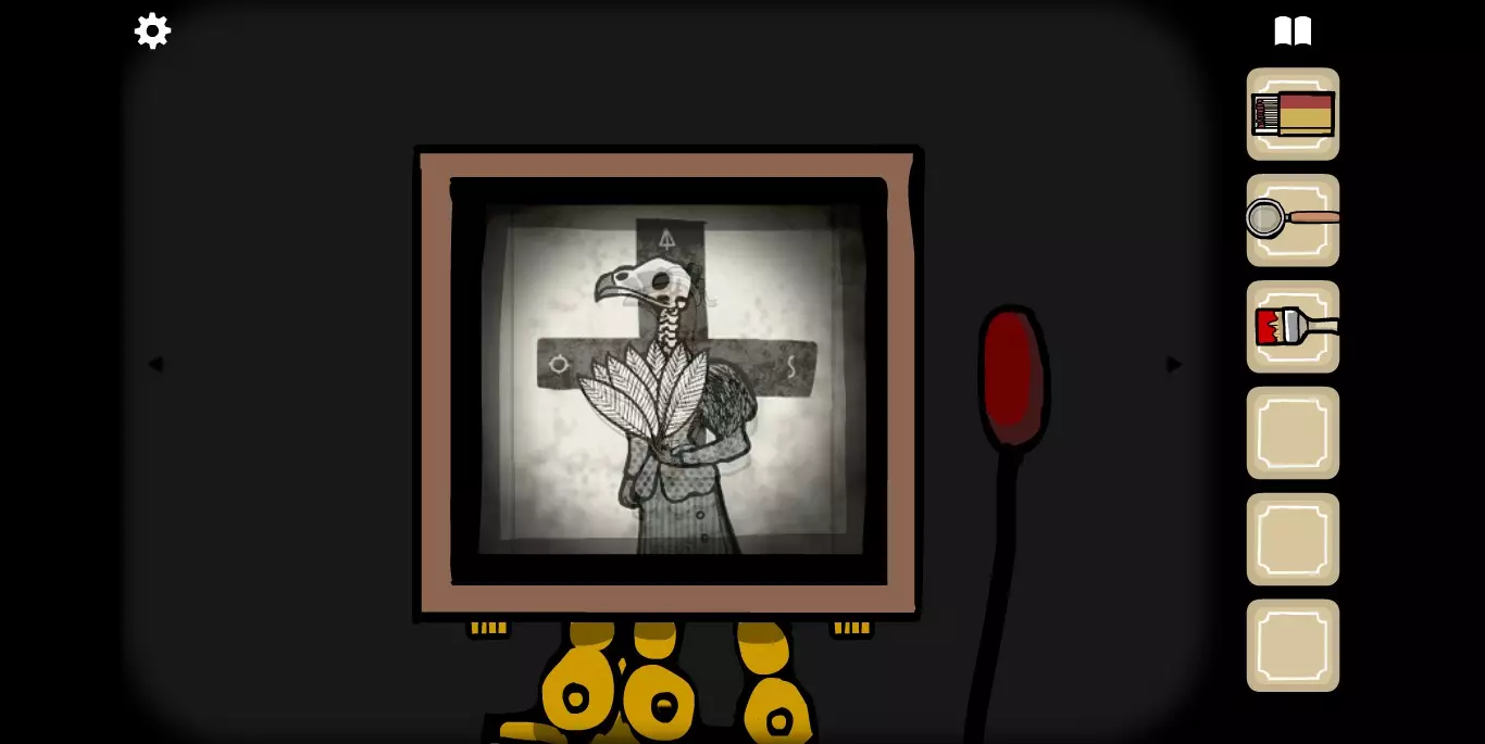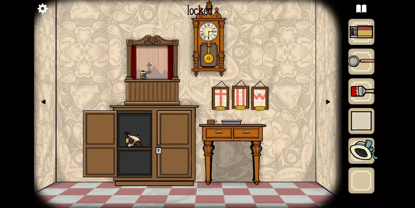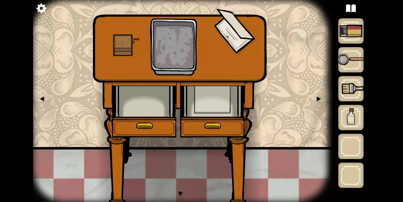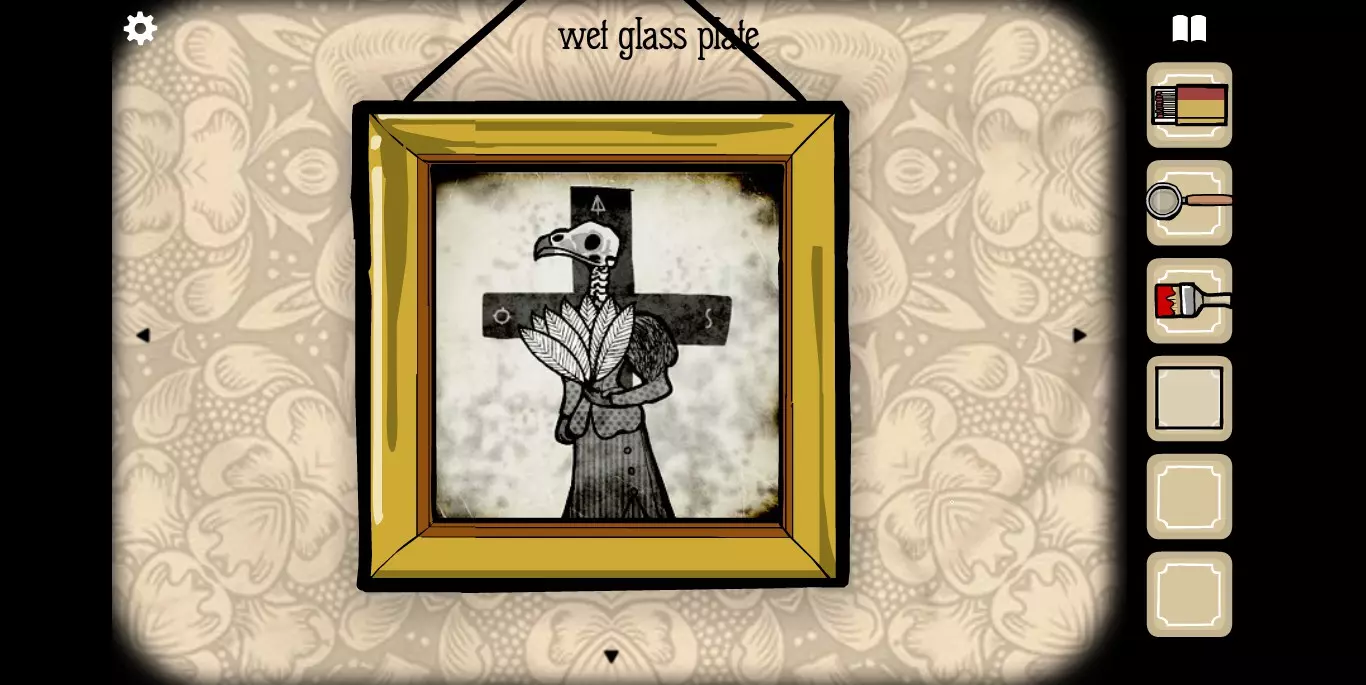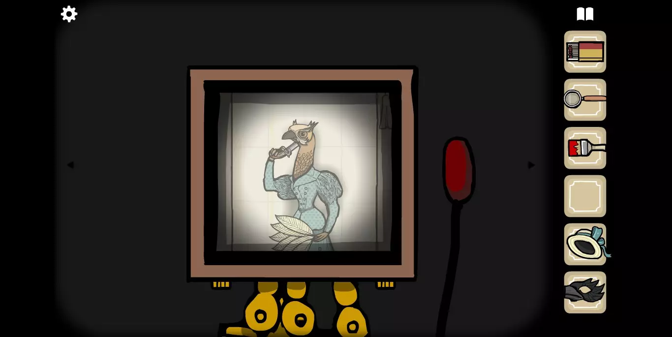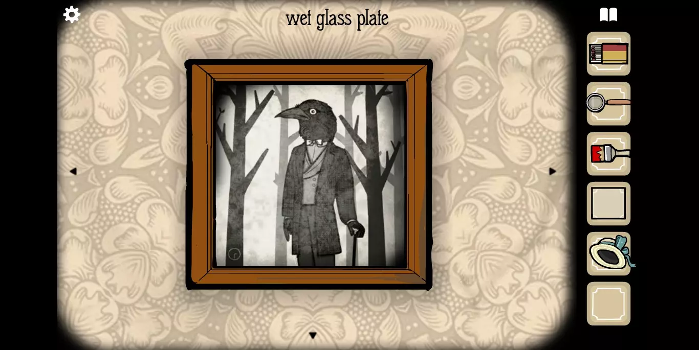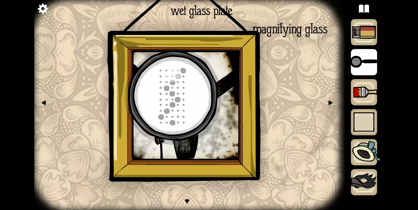 她请你帮忙拍照。环顾屋子后可以发现有三个空相框,应该是需要三张照片。在第二个场景的抽屉里可以分别找到火柴、放大镜和刷子。