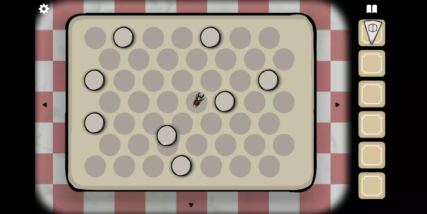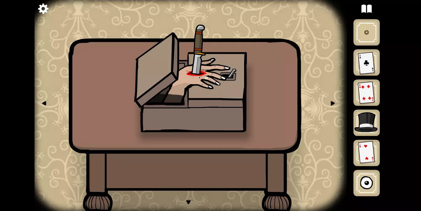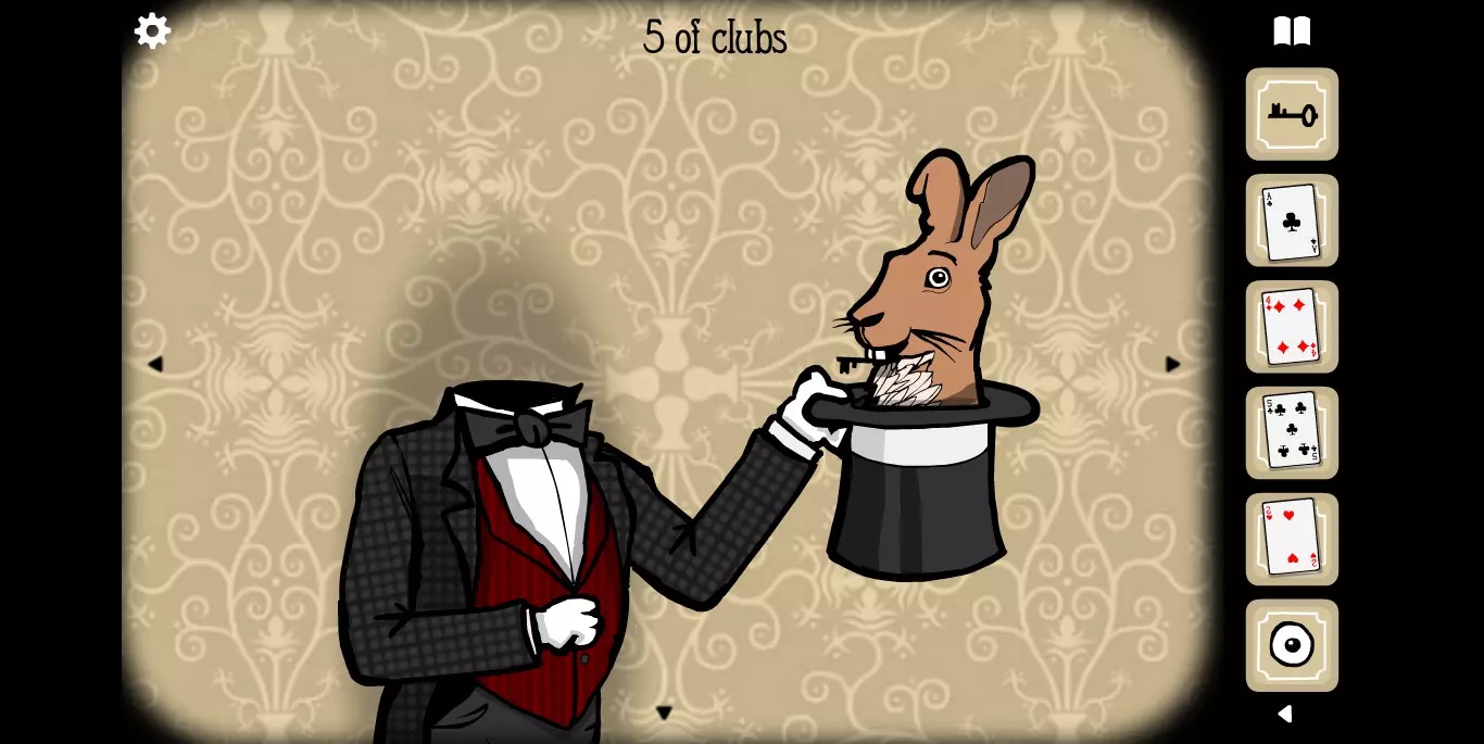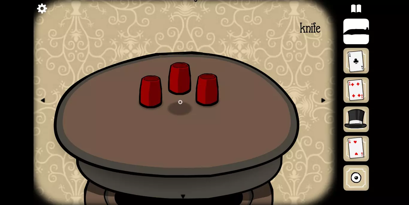 获得新的一张纸牌 接下来是这个房间解密比较难的地方(或许是我本身眼力不够好) MRRABBIT会和你玩一个关于杯子的小游戏,你需要记住有钢珠的杯子的位置,并在结束移动后准确找到它。反复找对四次后(每次杯子打开之后里面的东西会有变化),最终获得一个眼球。