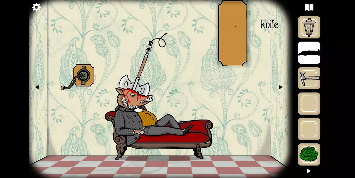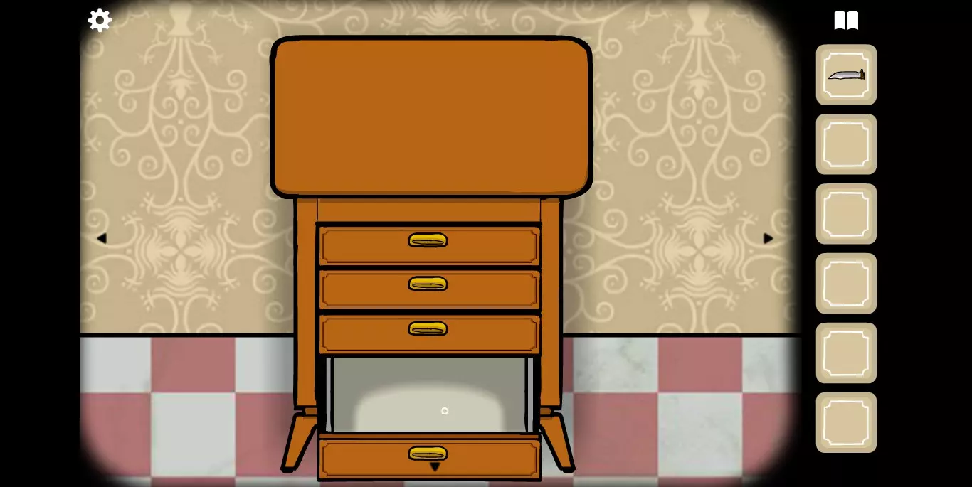 在第一个画面点击相框获得提示 相框下方的柜子里可以找到刀